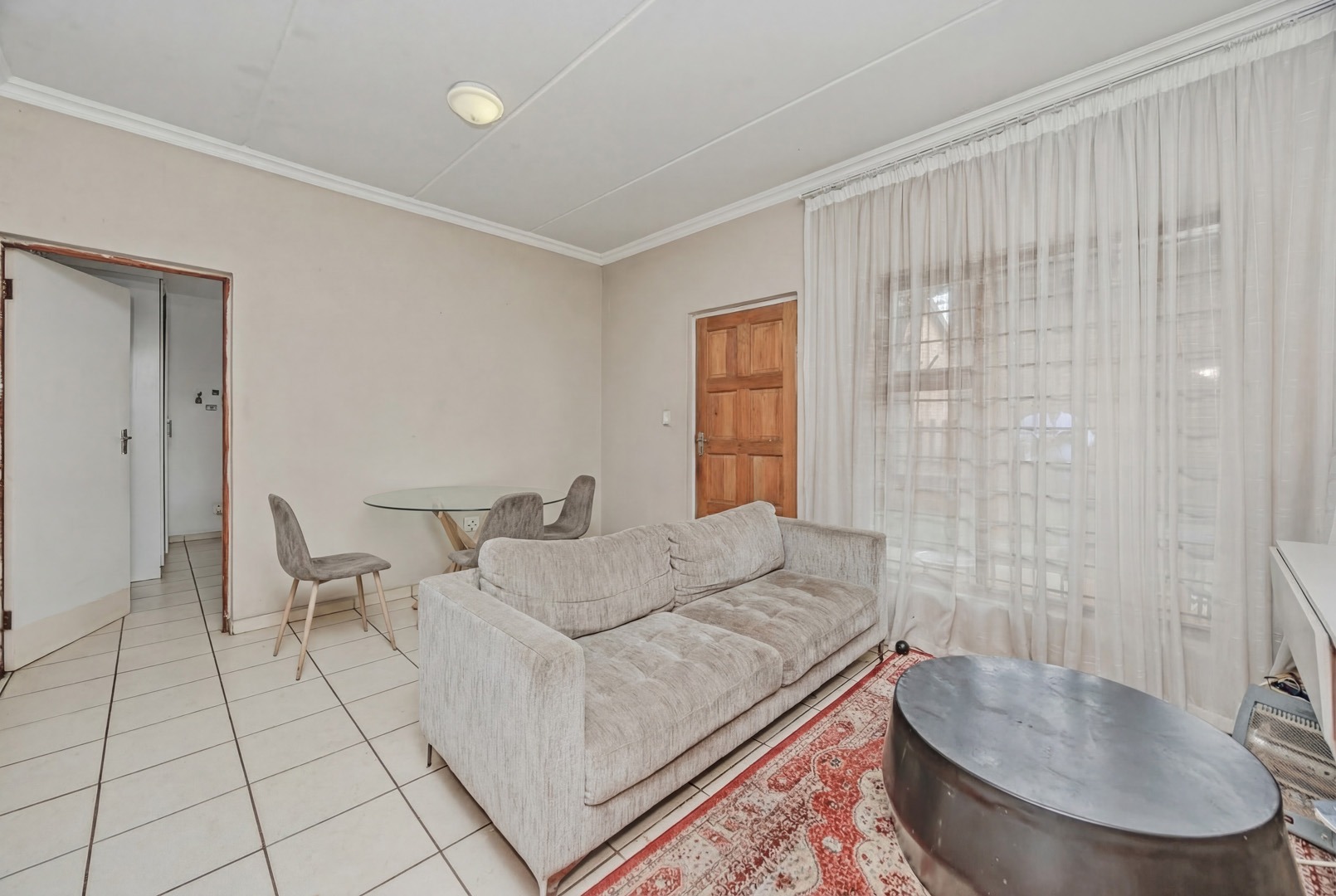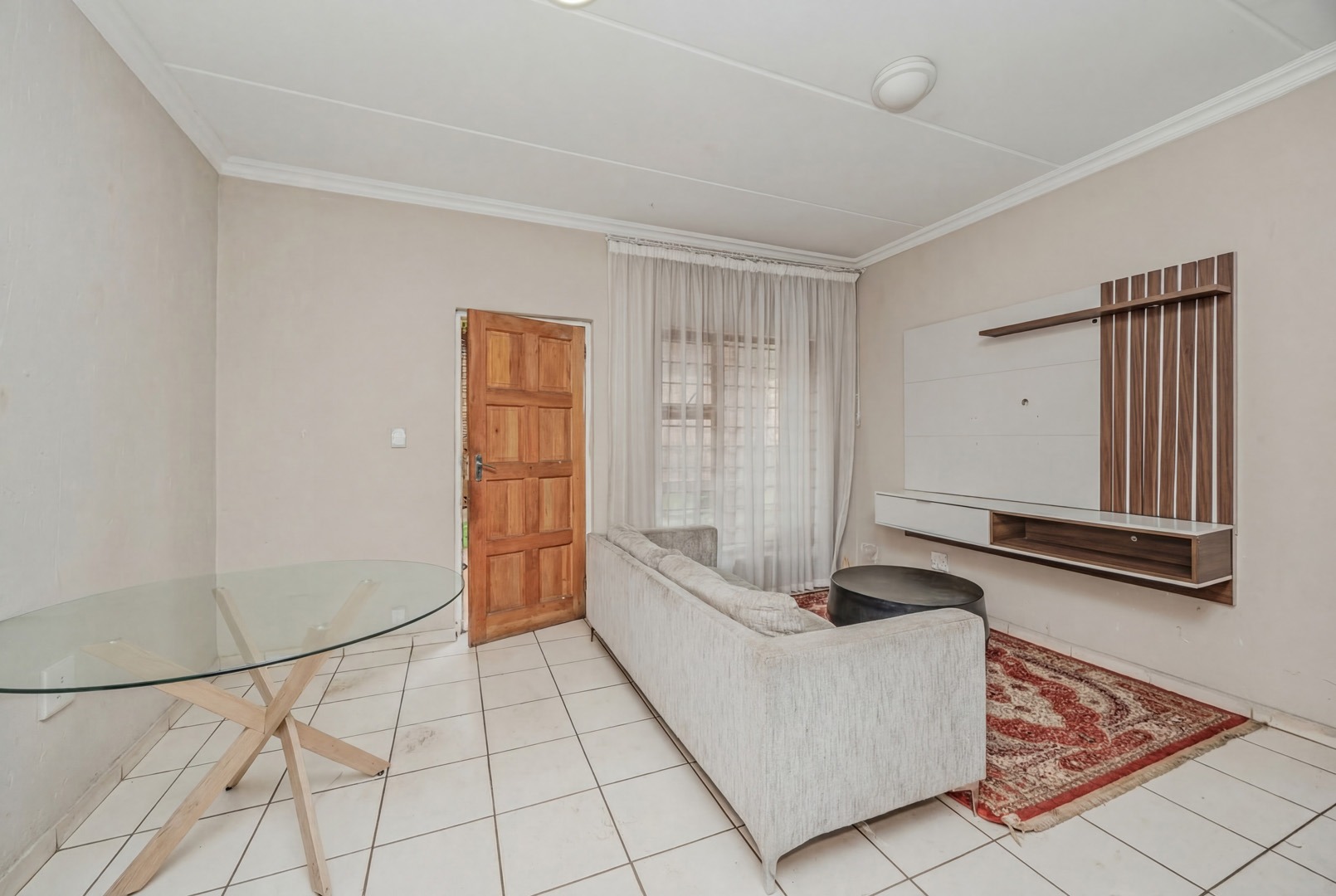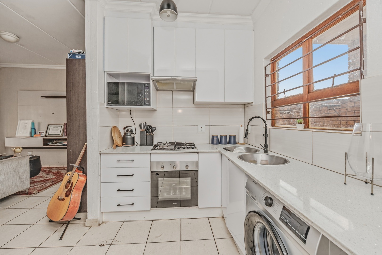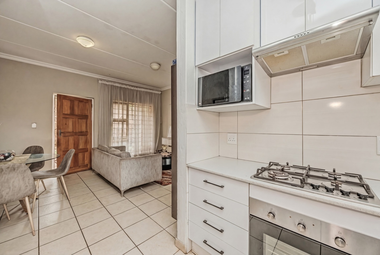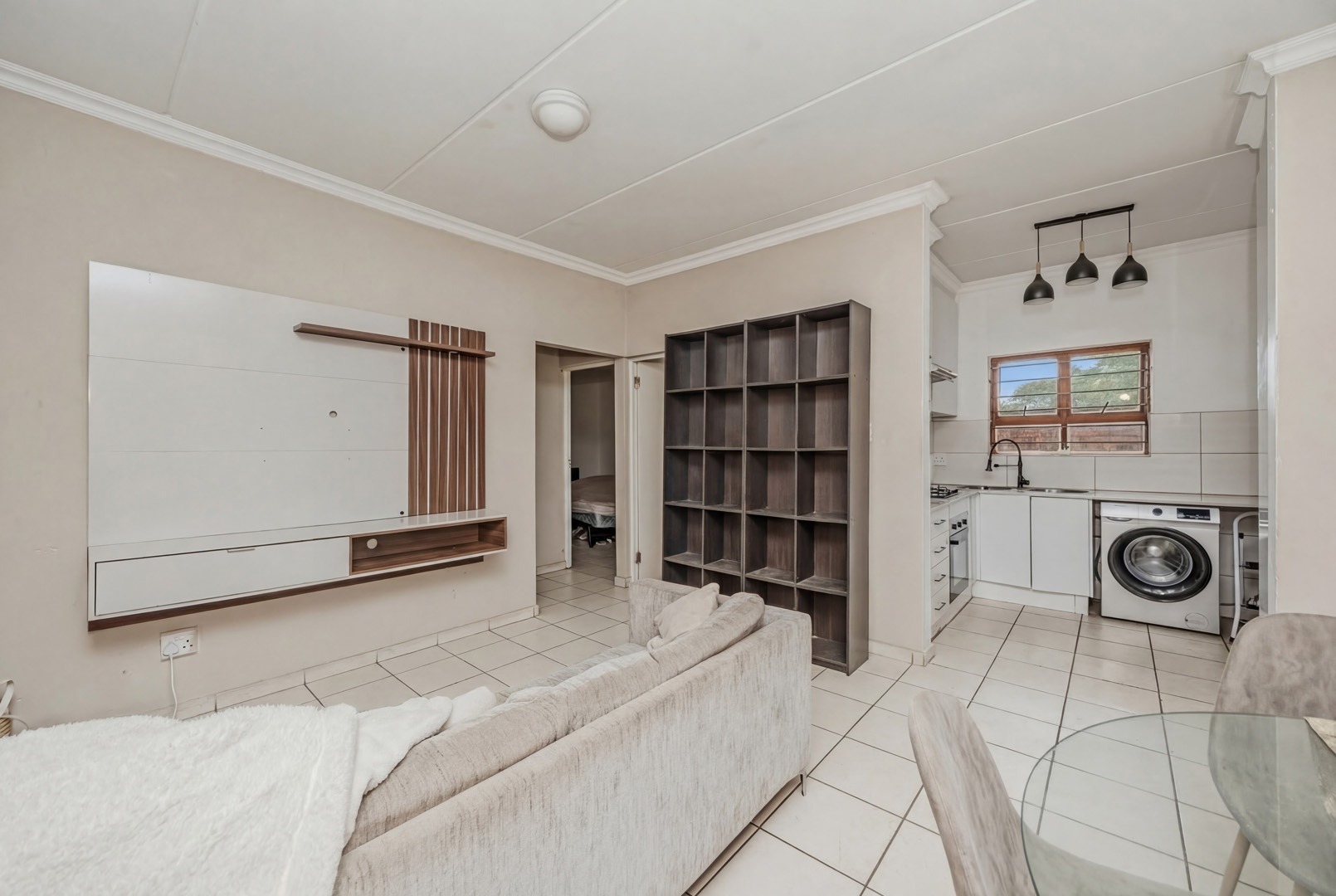 Discover this modern 71 sqm apartment located within a secure complex. The interior boasts an inviting open-plan layout, seamlessly connecting the lounge and a contemporary kitchen. The kitchen is well-appointed with modern white cabinetry, countertops and integrated oven and a gas hob. Tiled flooring extends throughout the living areas, complemented by neutral paint colours.