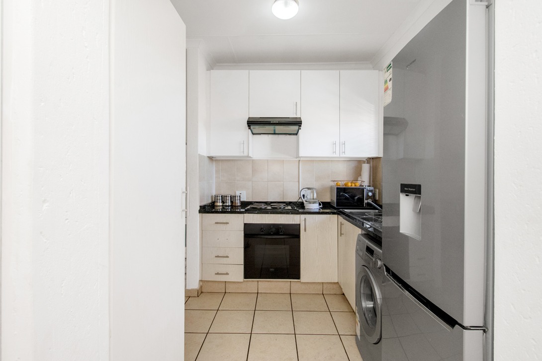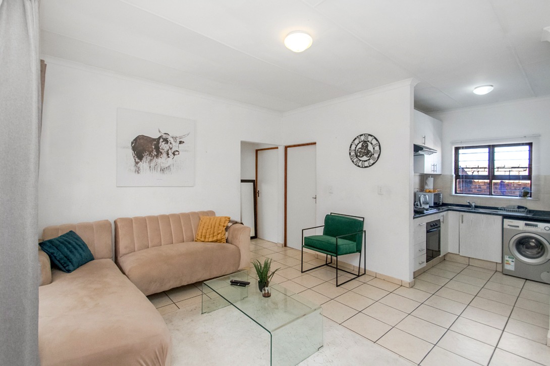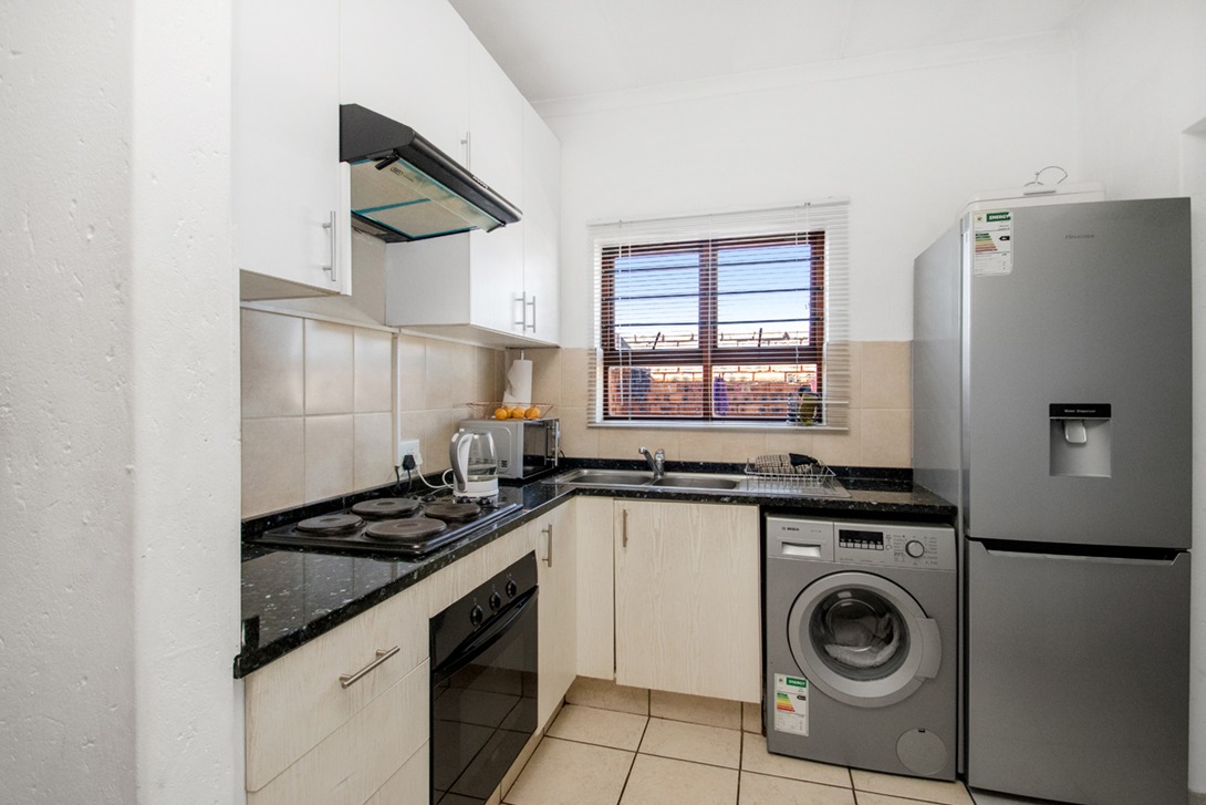 This modern 3-bedroom, 2-bathroom townhouse offers comfortable living within a secure complex in North Riding, Randburg. The interior boasts an inviting open-plan layout, featuring bright white walls and practical tiled flooring throughout the living areas. The lounge provides a versatile space for relaxation and entertainment. The compact yet highly functional kitchen is a highlight, equipped with modern white cabinetry and dark speckled countertops.