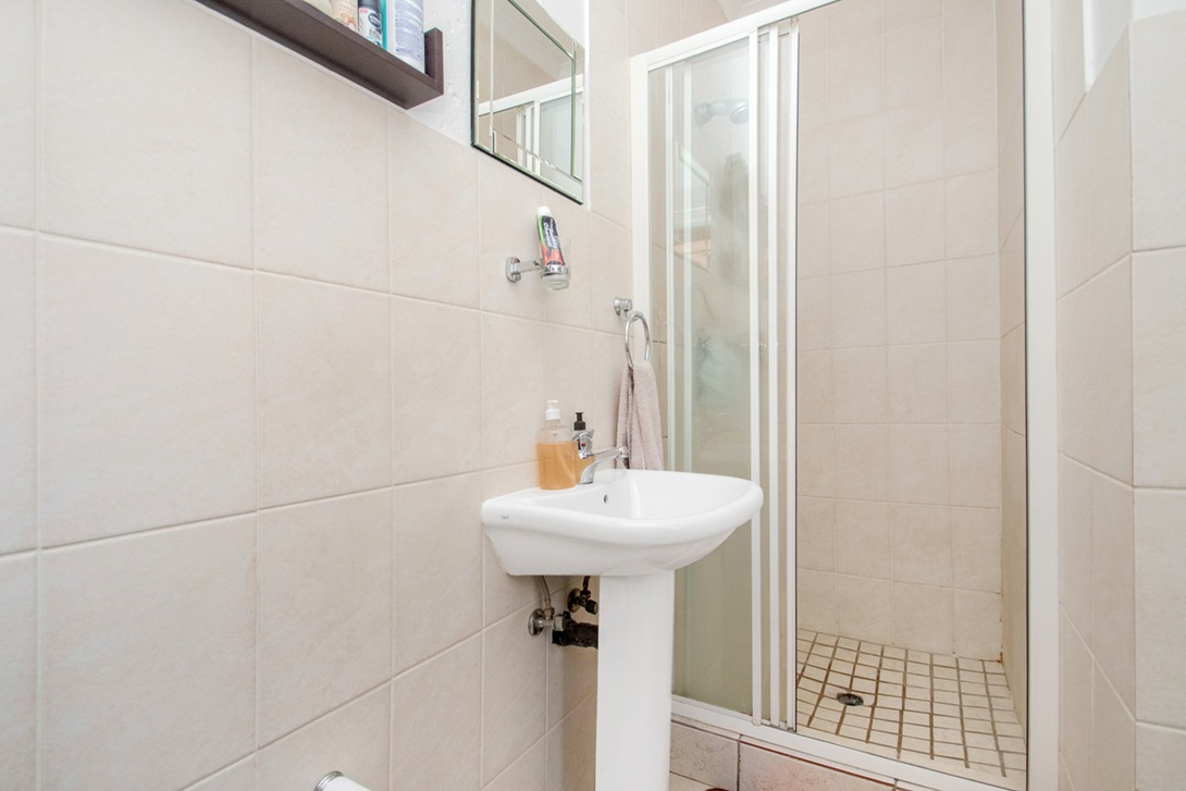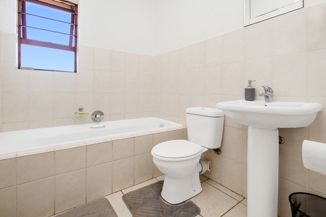The three well-proportioned bedrooms are designed for comfort, each featuring neutral light-coloured walls and tiled floors. Ample storage is provided by built-in white wardrobes in the bedrooms. The property includes two bathrooms, with one being an en-suite, both offering essential amenities such as a bathtub, modern pedestal sink, and toilet, catering to the needs of a family or residents.
