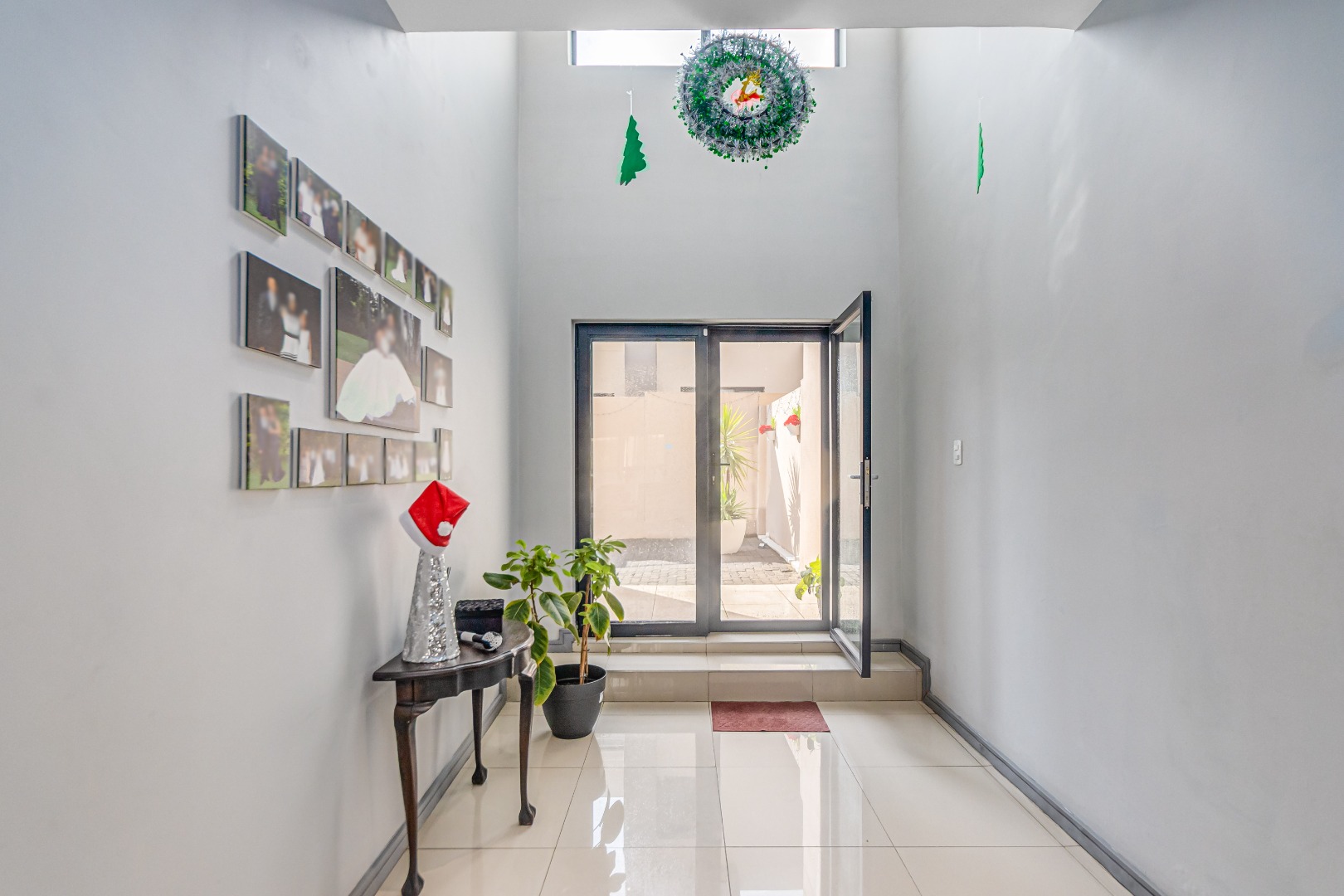 A striking double-volume reception sets the tone, flowing seamlessly into the open-plan porcelain-tiled lounge, dining, and kitchen area. The living space is anchored by a stylish gas fireplace, creating warmth and ambiance all year round. Large sliding doors open onto a covered patio overlooking a private landscaped garden and inviting swimming pool—a perfect setup for relaxed entertainment and family enjoyment.