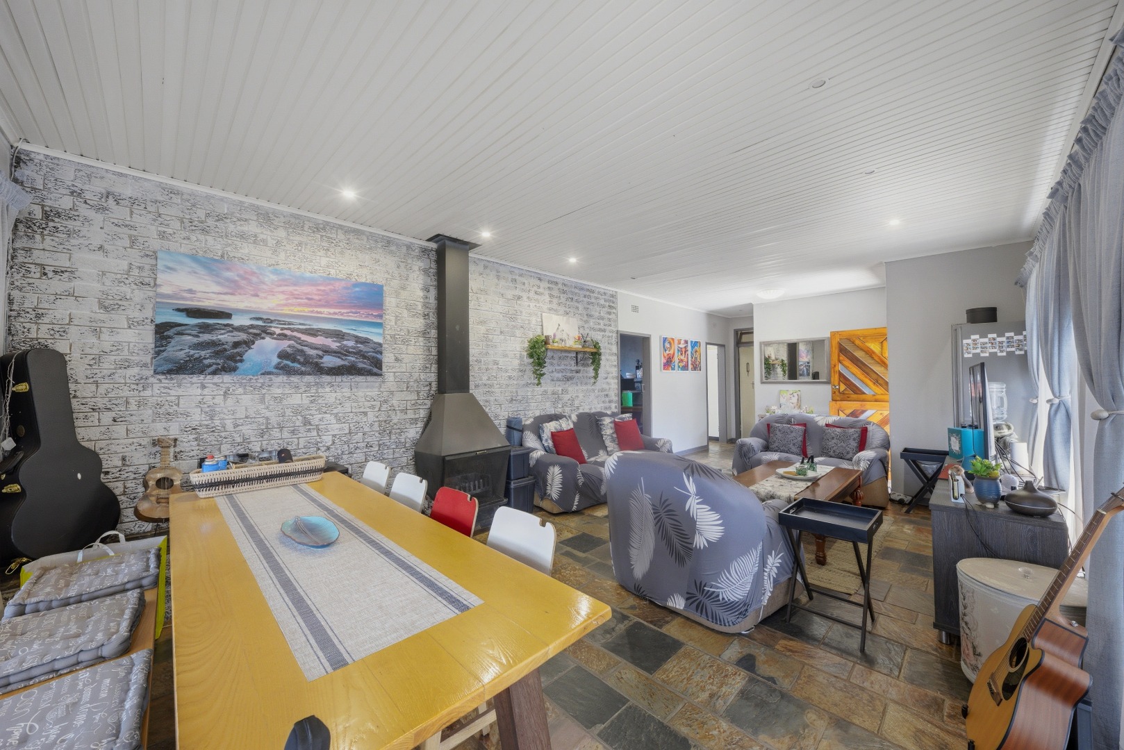 The heart of the home is the spacious kitchen, equipped with ample built-in cupboards and workspace, ideal for cooking and entertaining. The Property boasts a light-filled dining area and a comfortable living room with a working fireplace , perfect for relaxing with family or hosting guests.