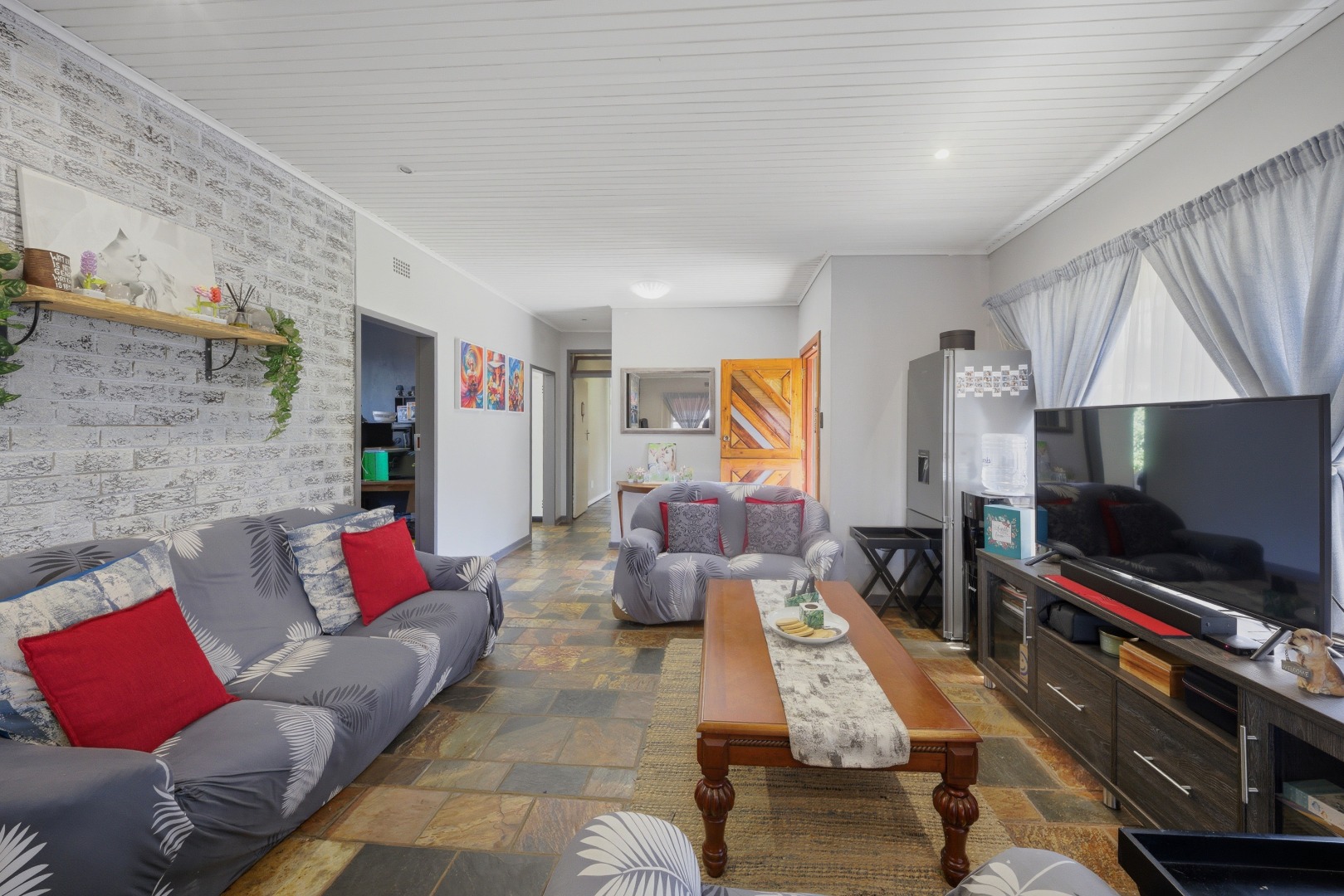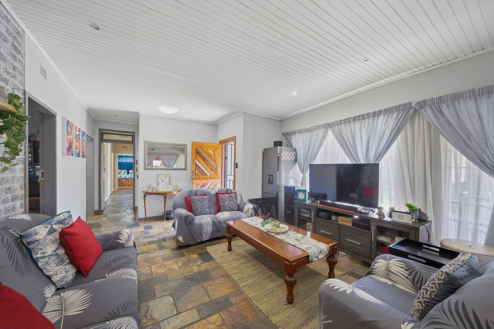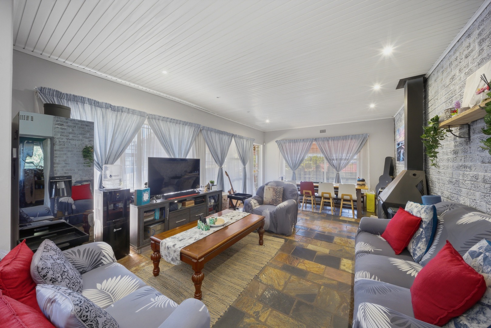 The heart of the home is the spacious kitchen, equipped with ample built-in cupboards and workspace, ideal for cooking and entertaining. The Property boasts a light-filled dining area and a comfortable living room with a working fireplace , perfect for relaxing with family or hosting guests.