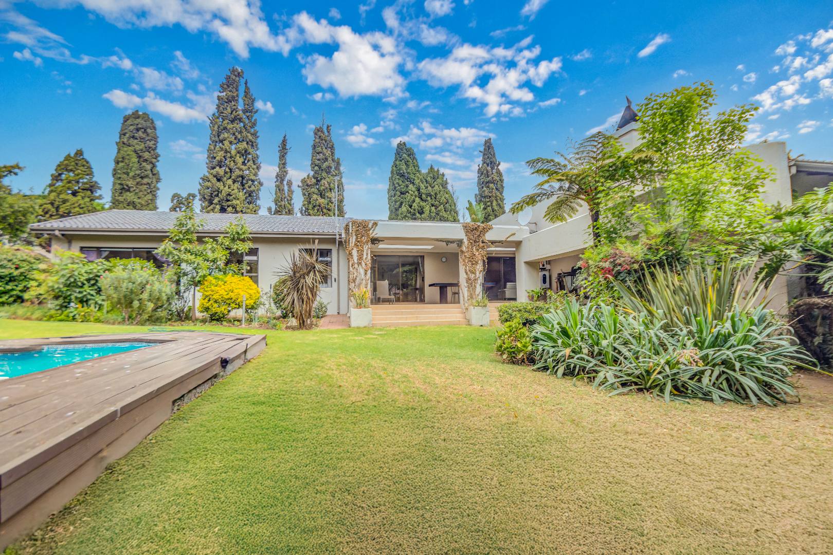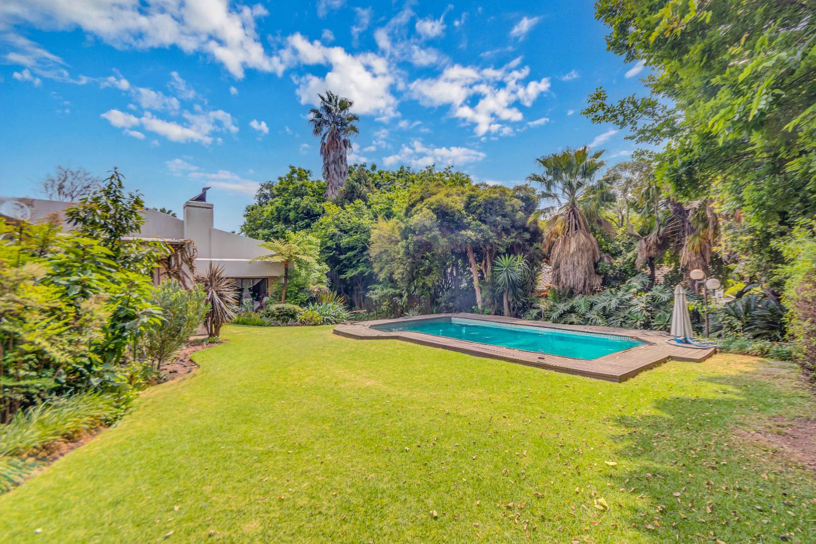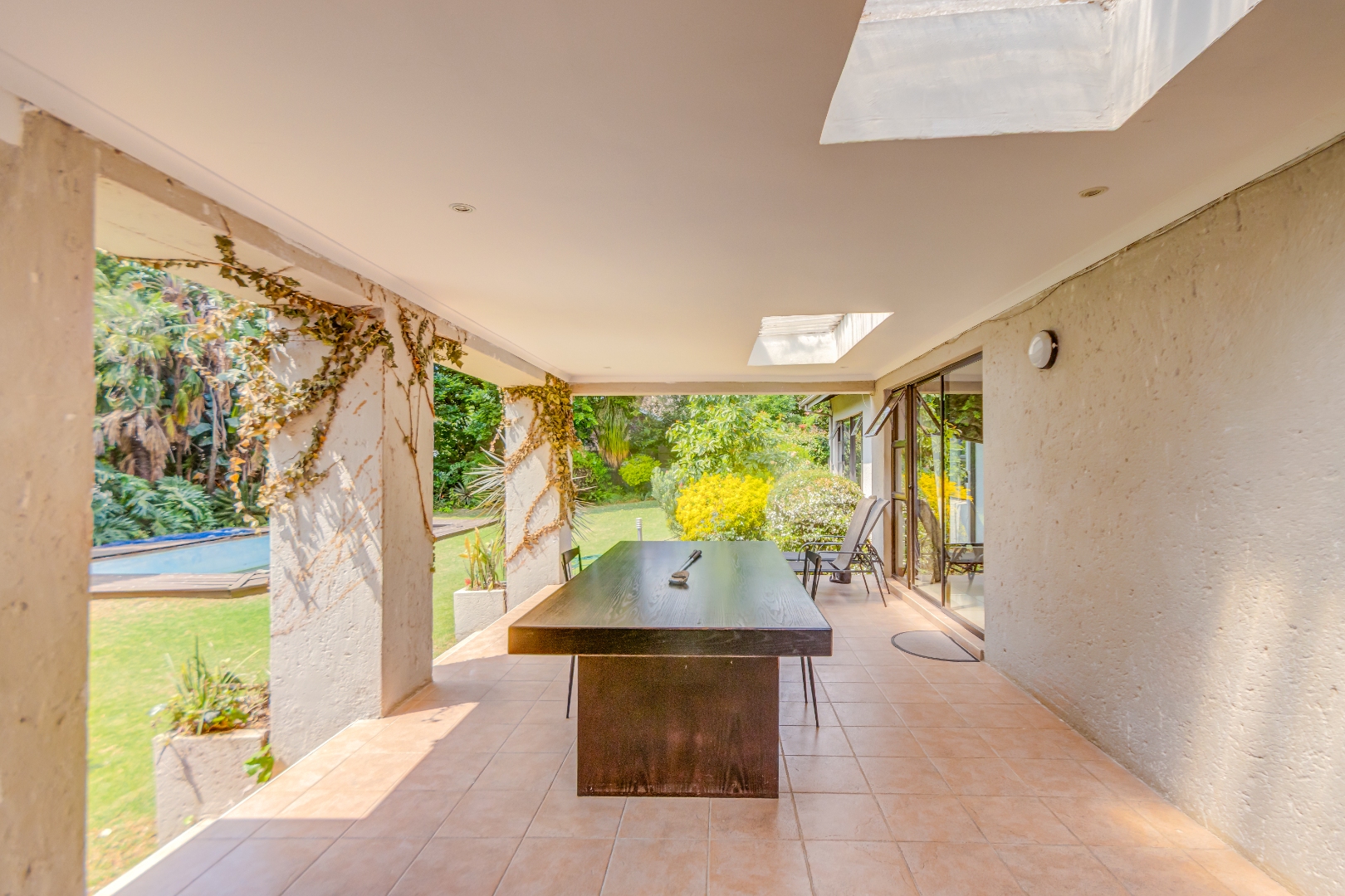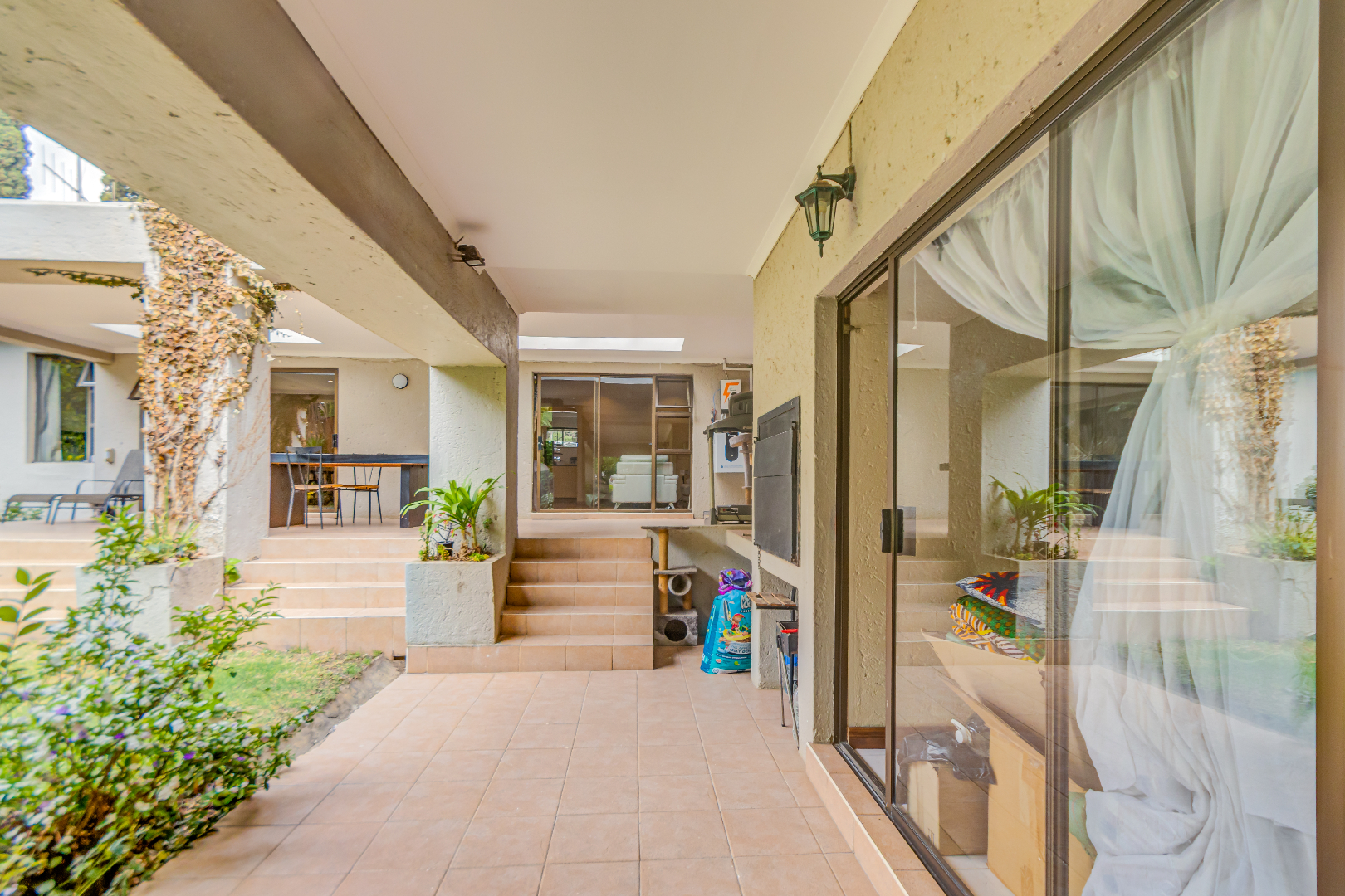 Outside, a covered patio with a built-in braai overlooks a beautiful, established garden. The sparkling pool with surrounding decking (in need of some attention) offers a wonderful space for summer fun and relaxation.