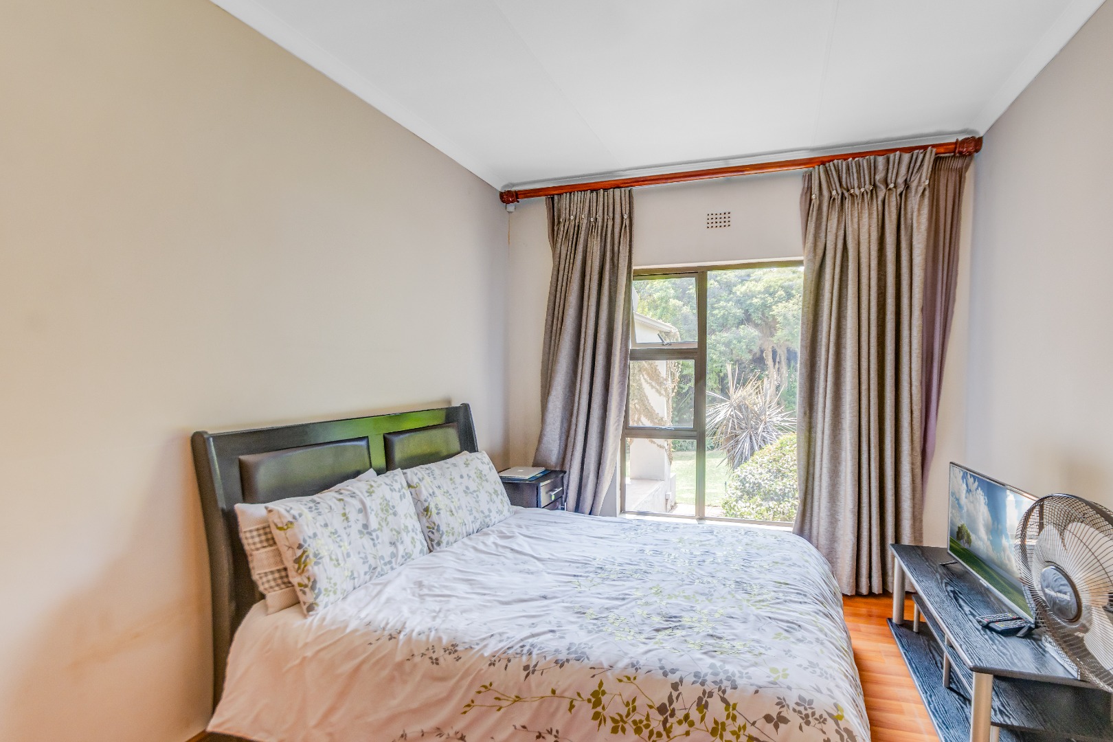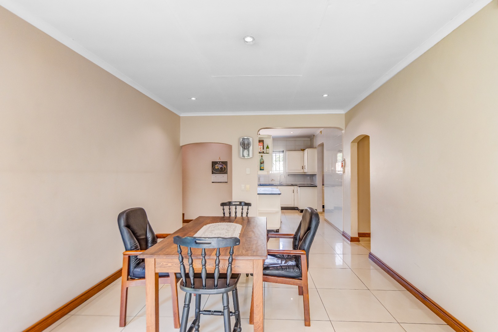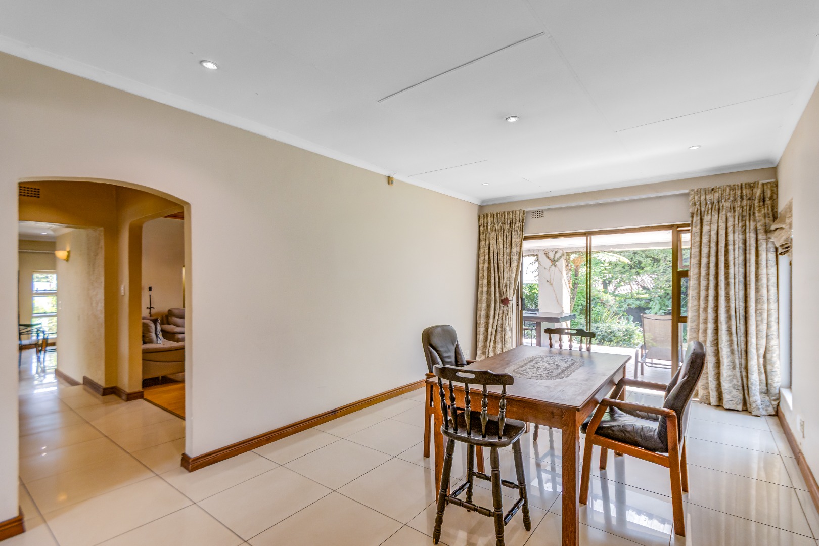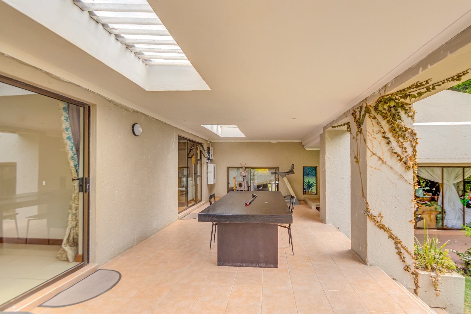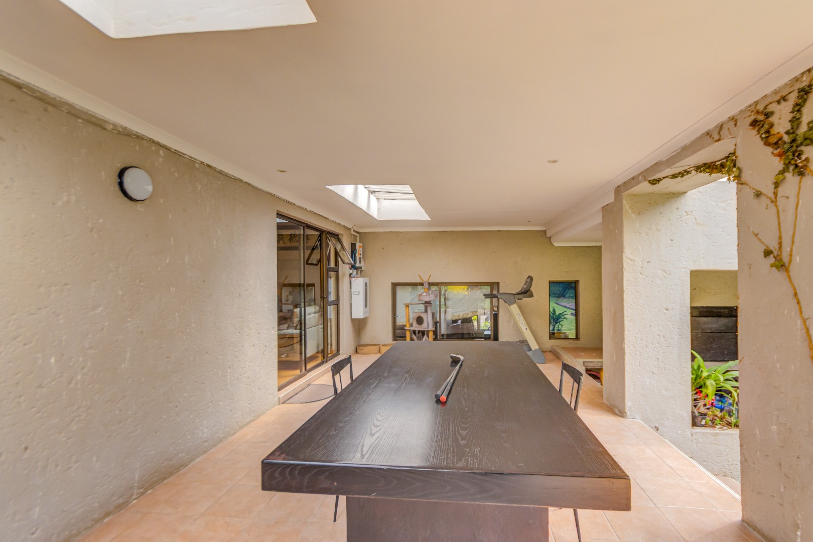 Outside, a covered patio with a built-in braai overlooks a beautiful, established garden. The sparkling pool with surrounding decking (in need of some attention) offers a wonderful space for summer fun and relaxation.