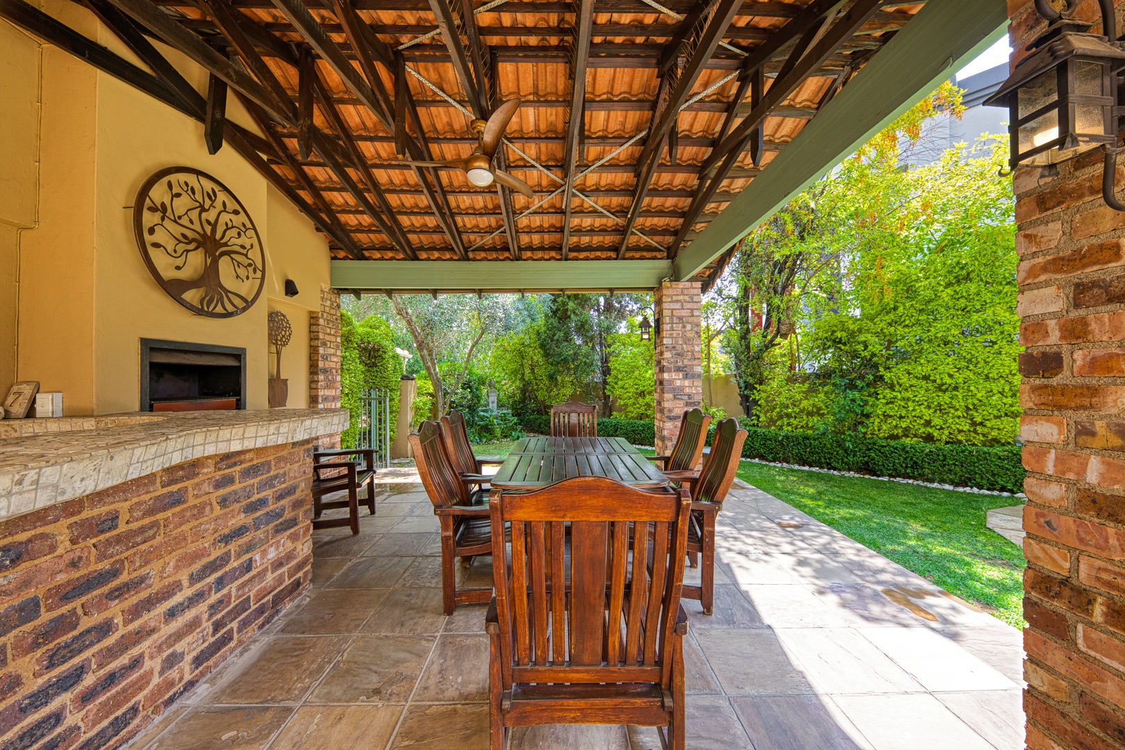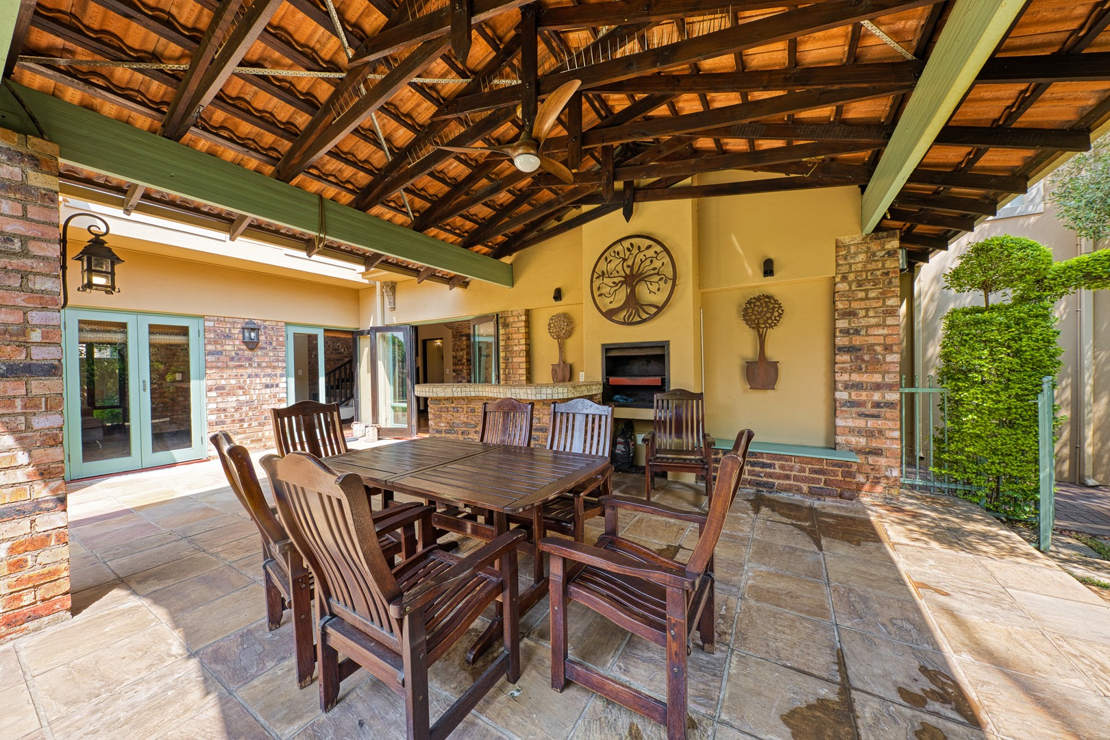 sliding doors open onto a covered patio featuring a built-in braai and bar —