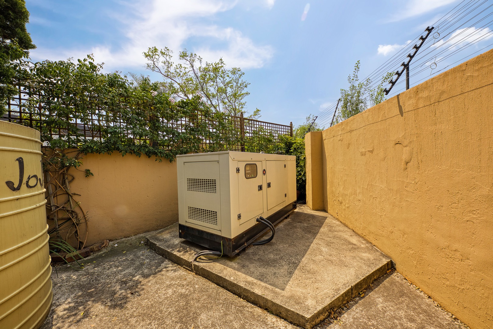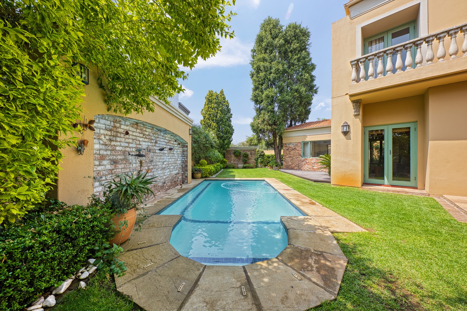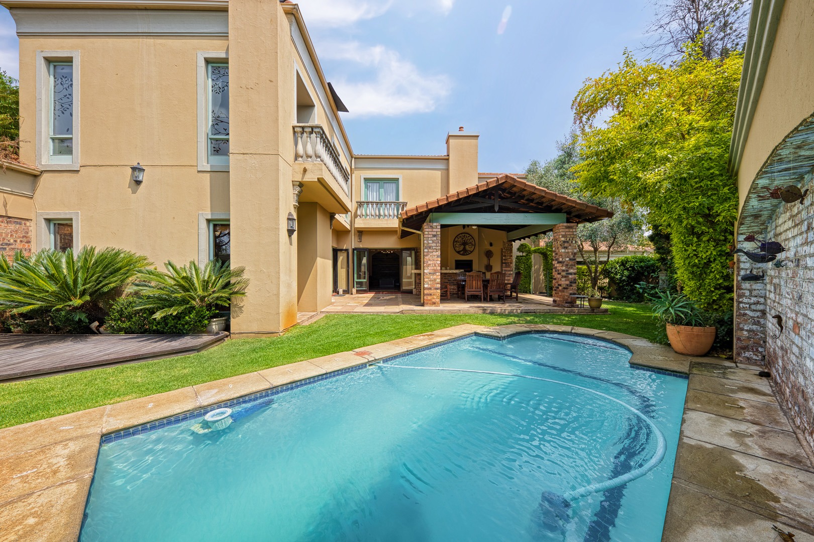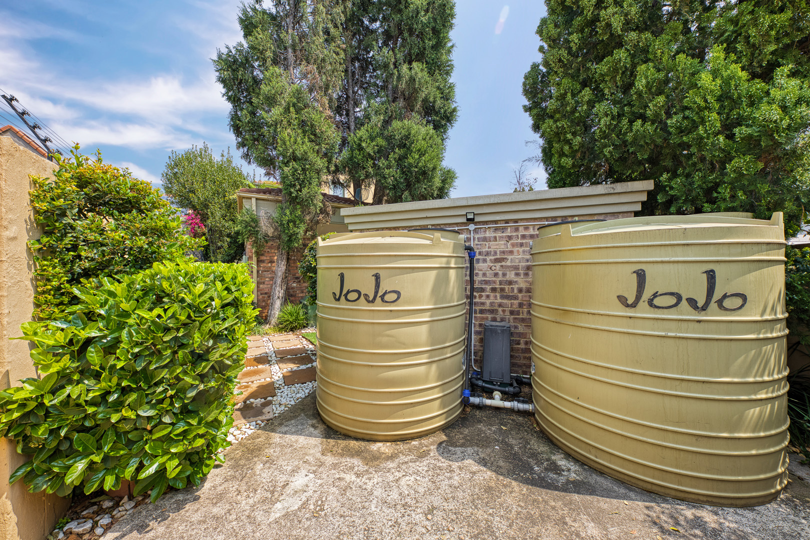 garden, and a sparkling pool. With a borehole, generator, and two JoJo tanks,