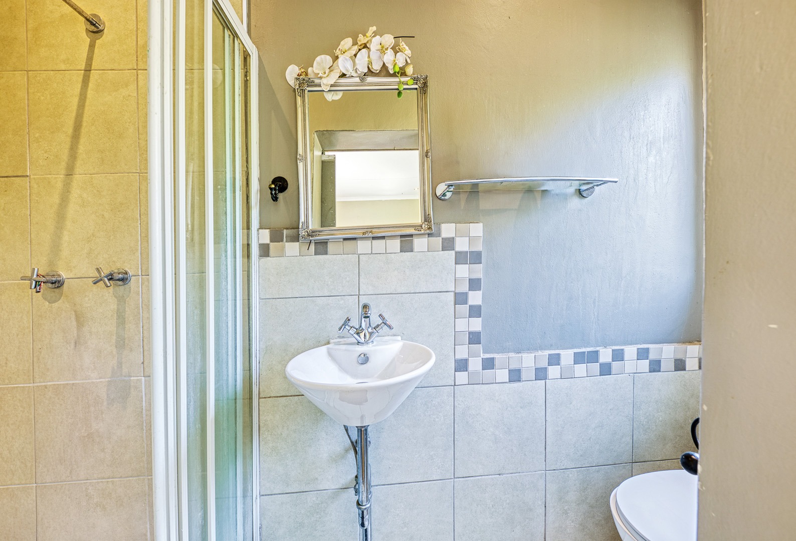 third bedroom enjoys the convenience of a private shower and basin. A third