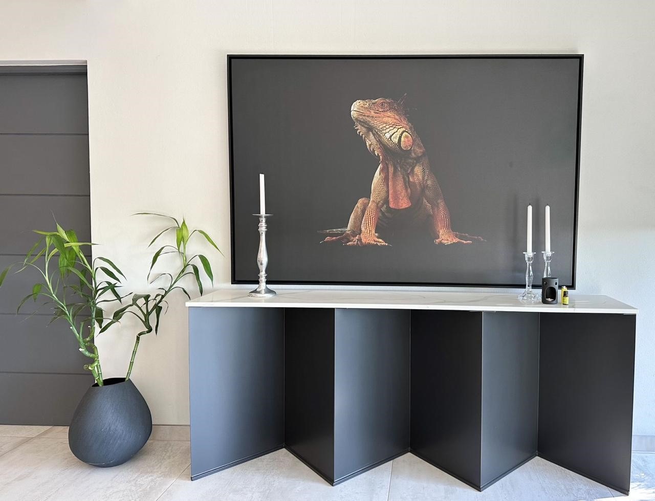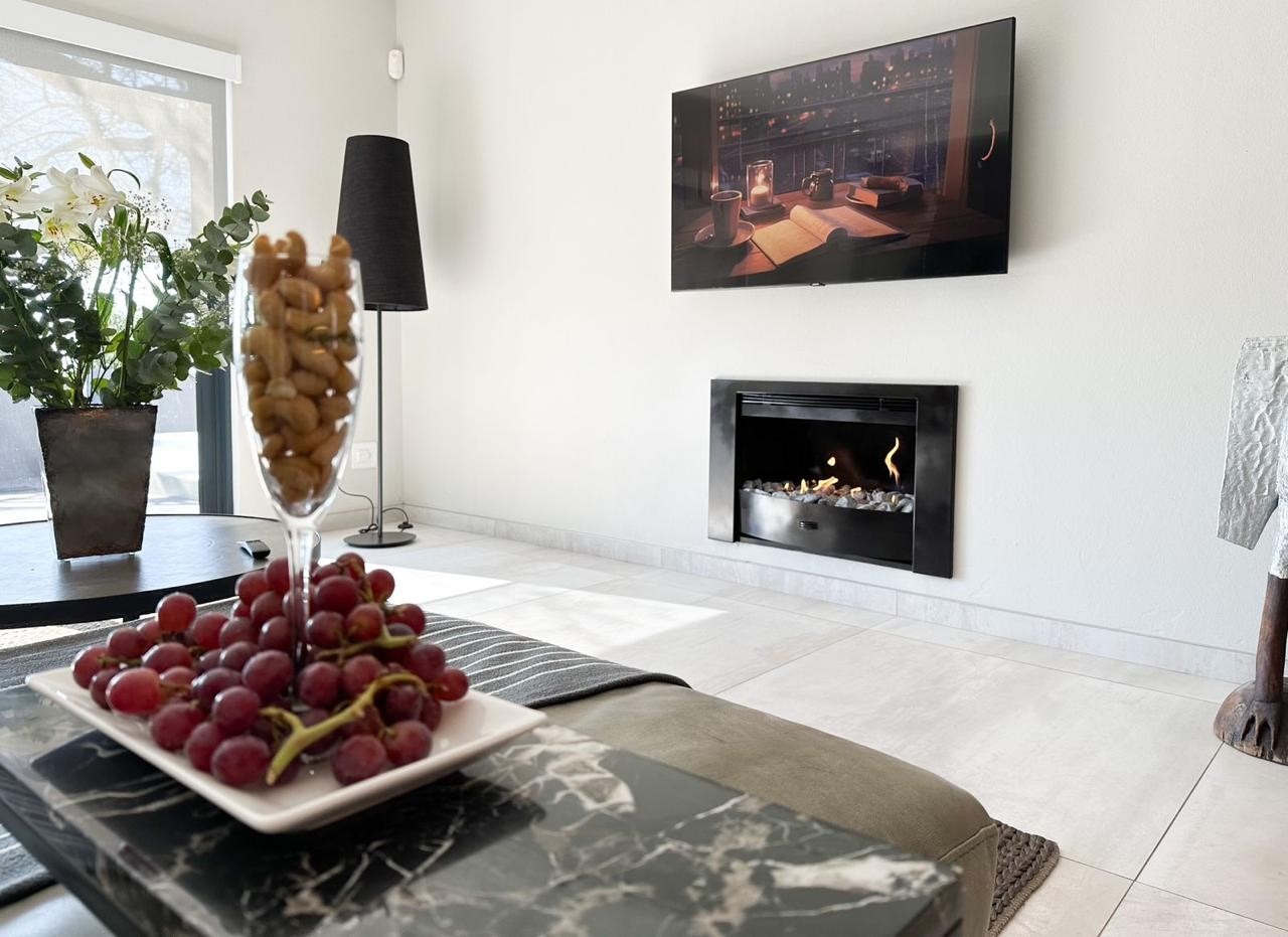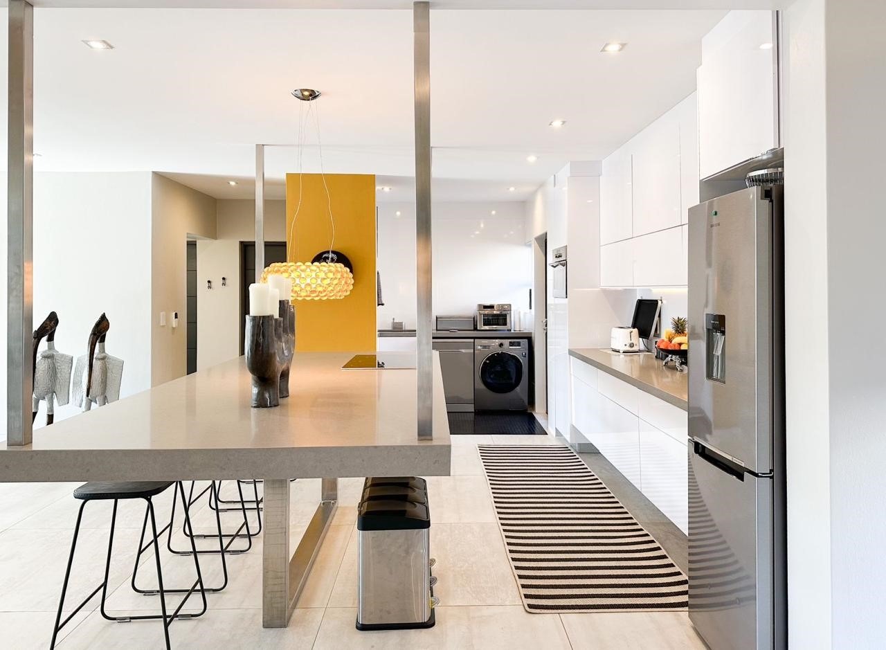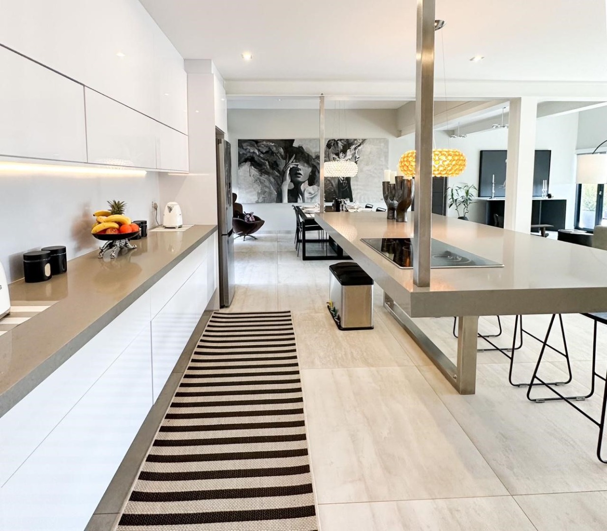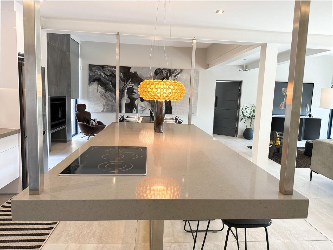 - Open-plan design connecting the Caesarstone island kitchen, lounge with open fireplace, and second lounge, and elegant dining room