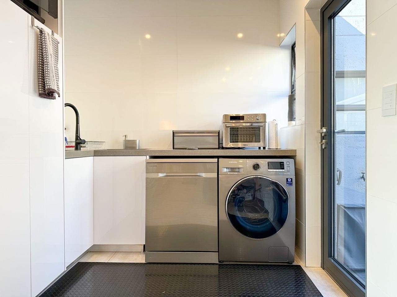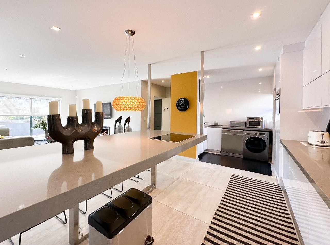 - Built-in eye-level ovens, double-door fridge, two wine coolers, and ample Caesarstone counters