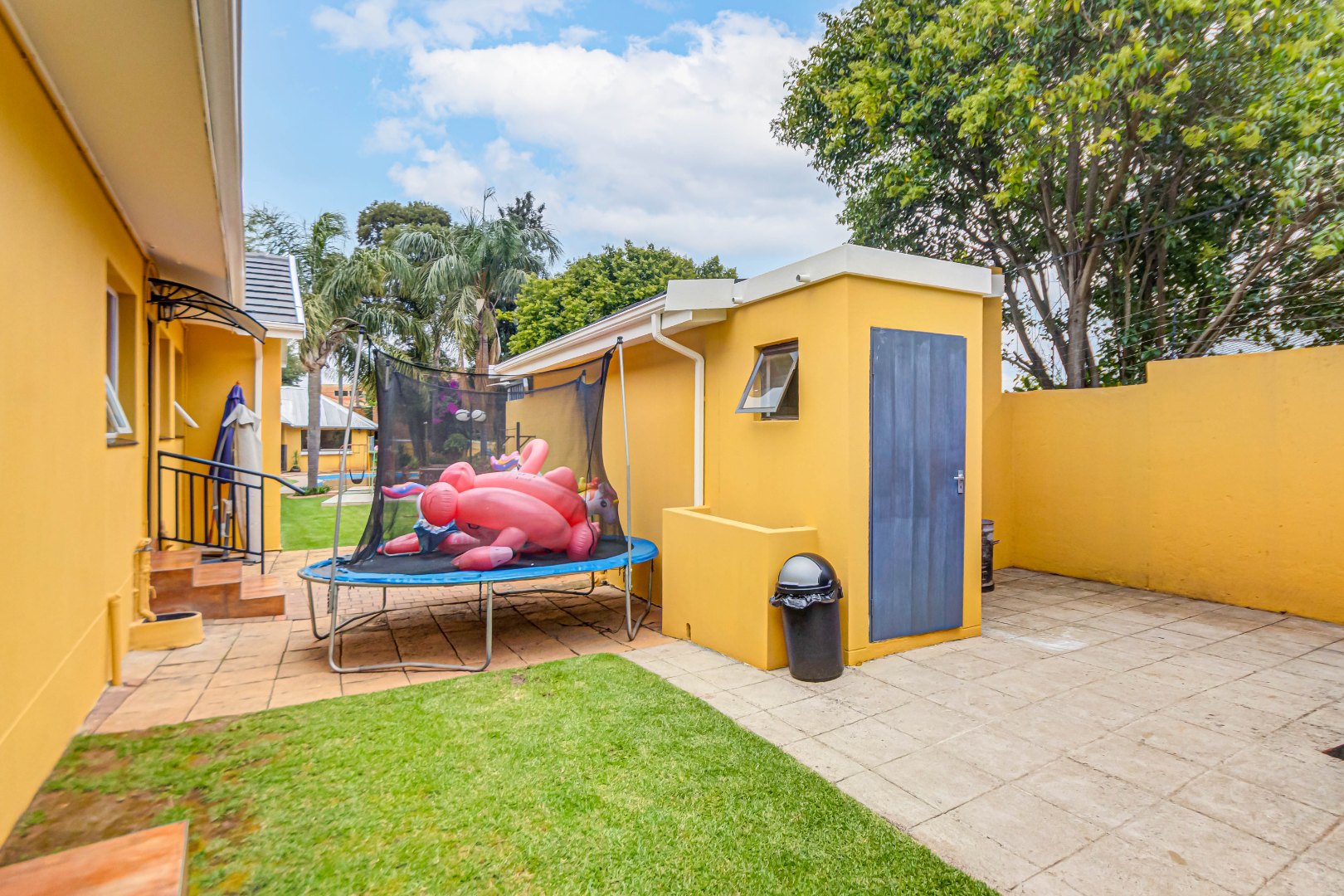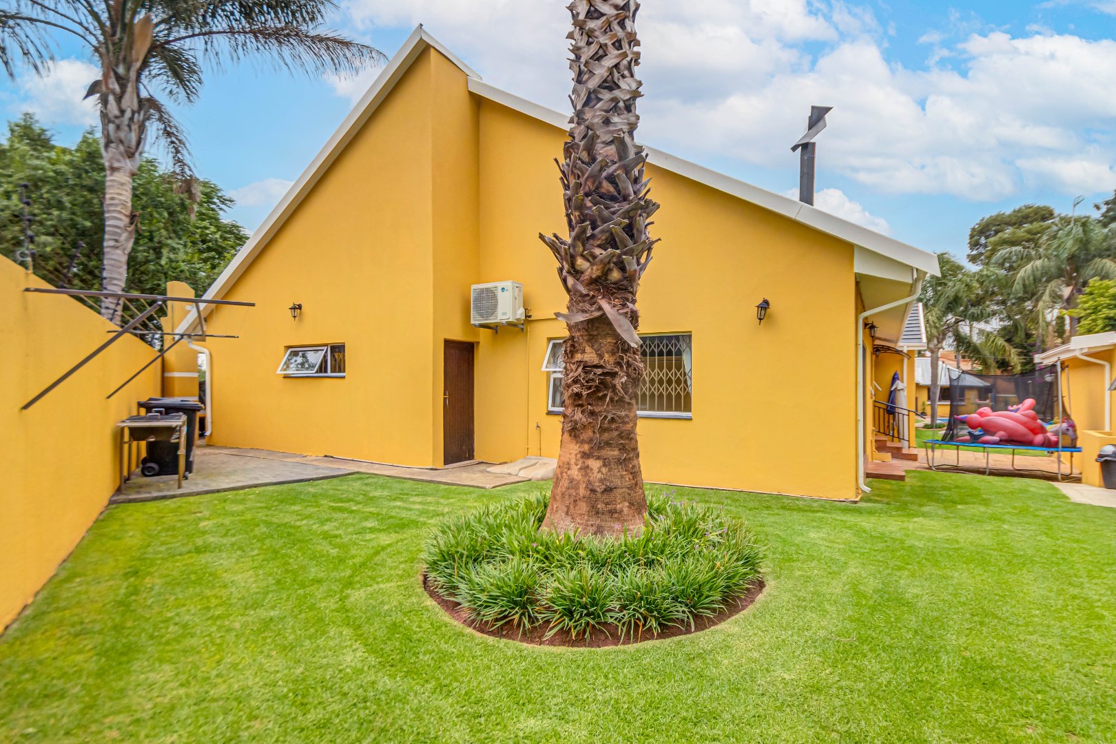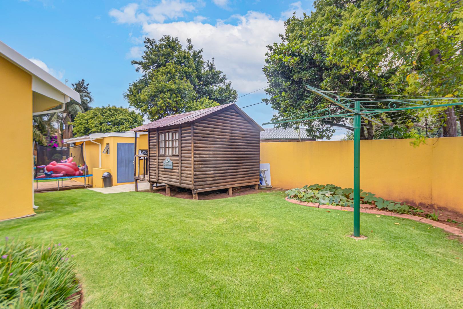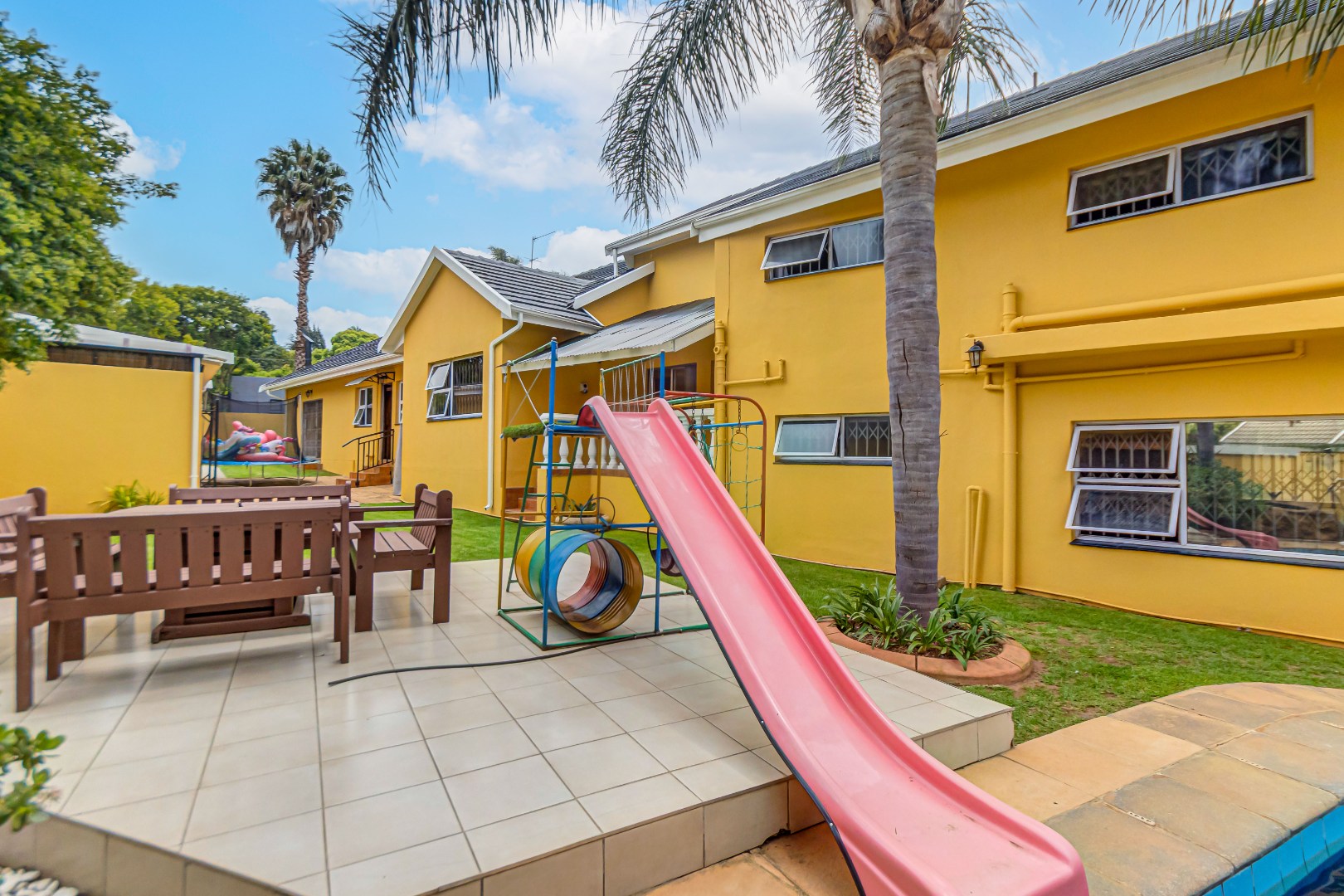 Double automated garage, laundry, staff accommodation, Zozo storage unit, covered parking for 4–5 vehicles, air conditioning, prepaid electricity, freestanding gas stoves, two JoJo water backup tanks, jungle gym with pool slide, additional braai area, and excellent security.