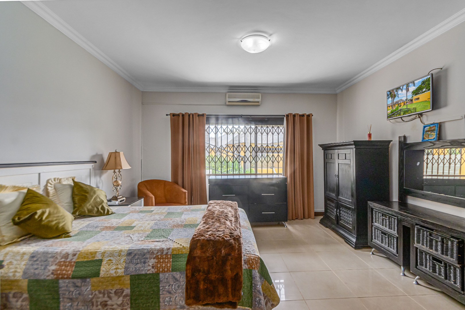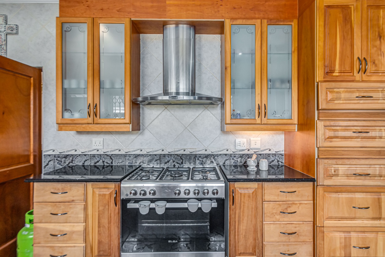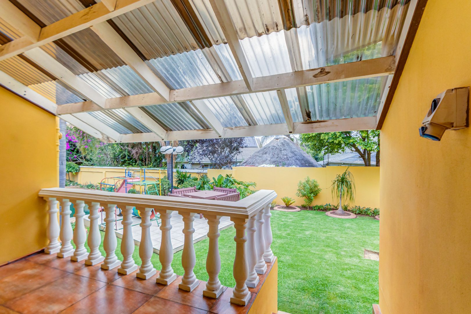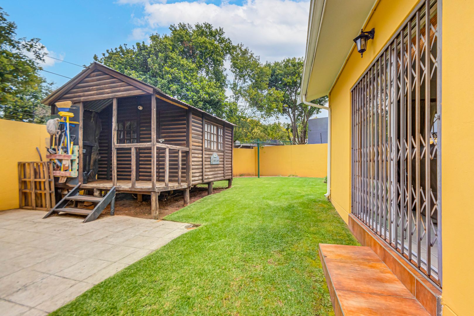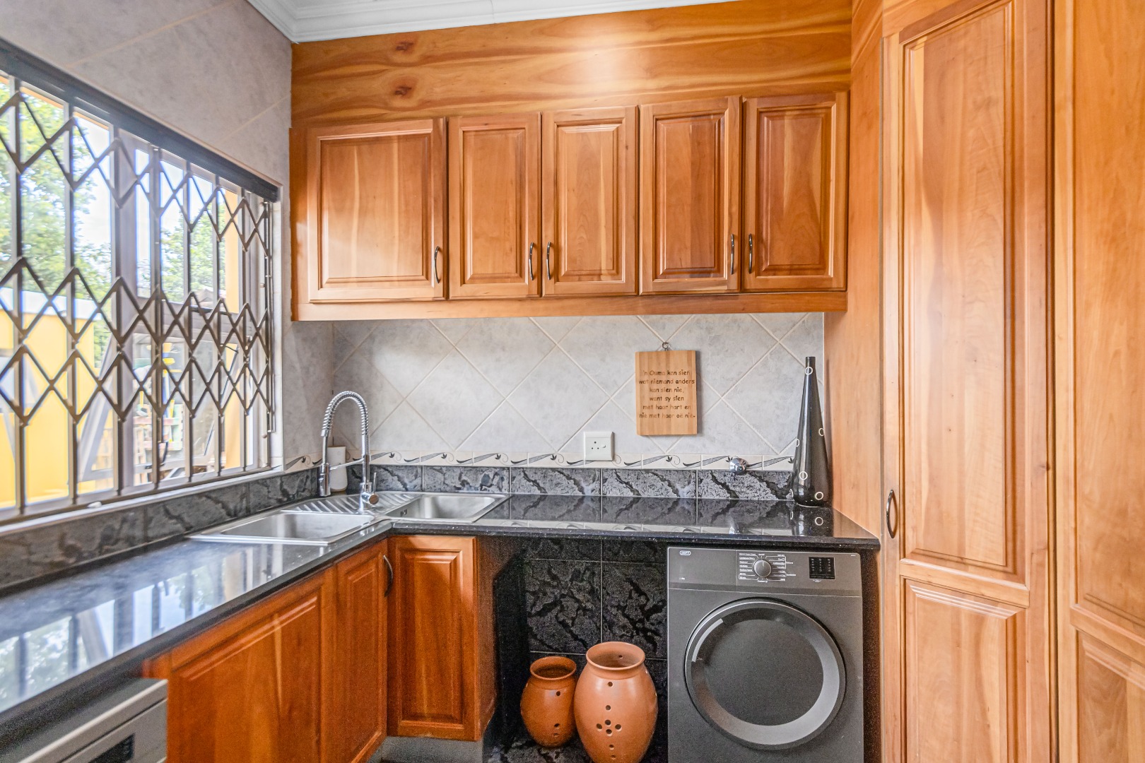 Double automated garage, laundry, staff accommodation, Zozo storage unit, covered parking for 4–5 vehicles, air conditioning, prepaid electricity, freestanding gas stoves, two JoJo water backup tanks, jungle gym with pool slide, additional braai area, and excellent security.