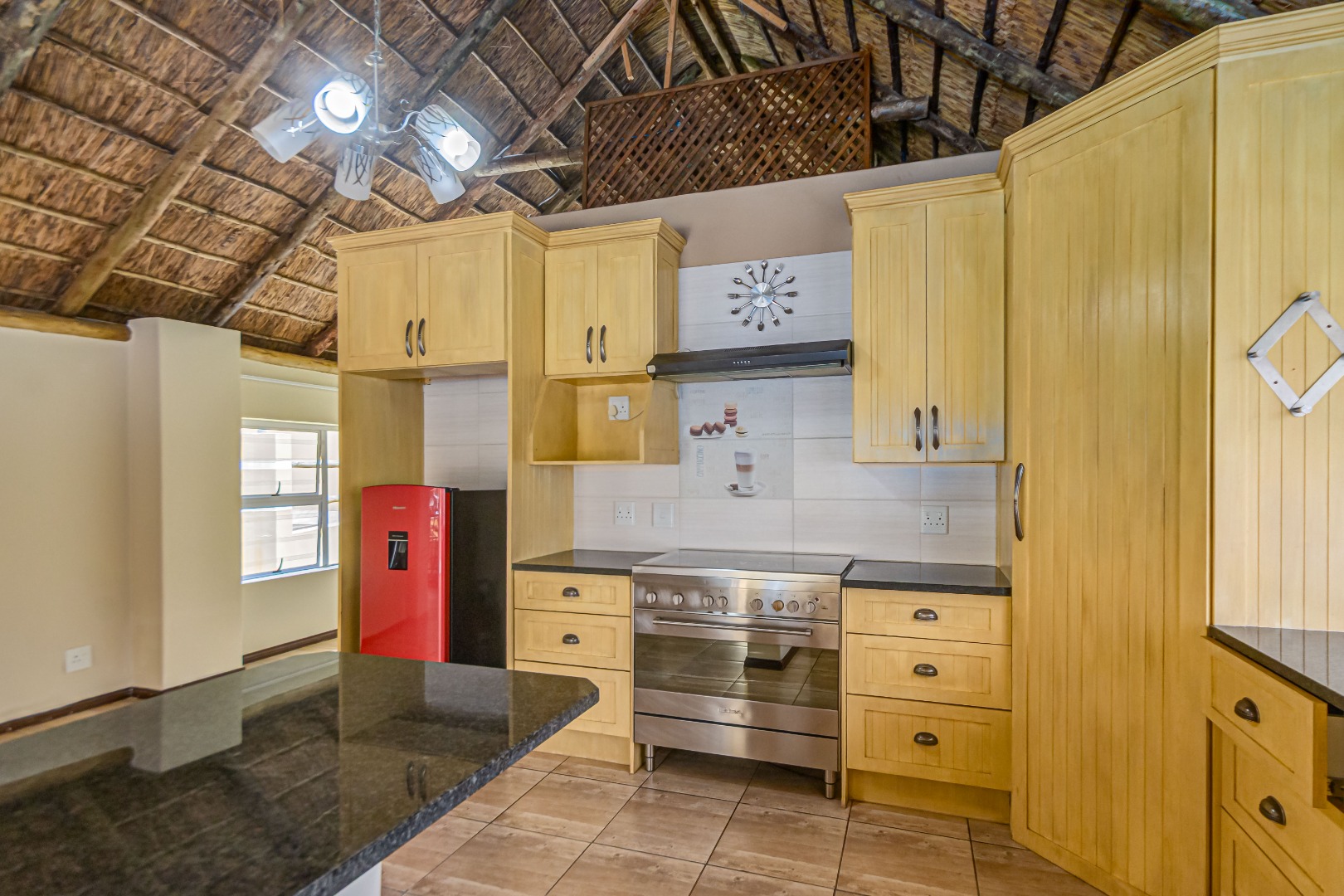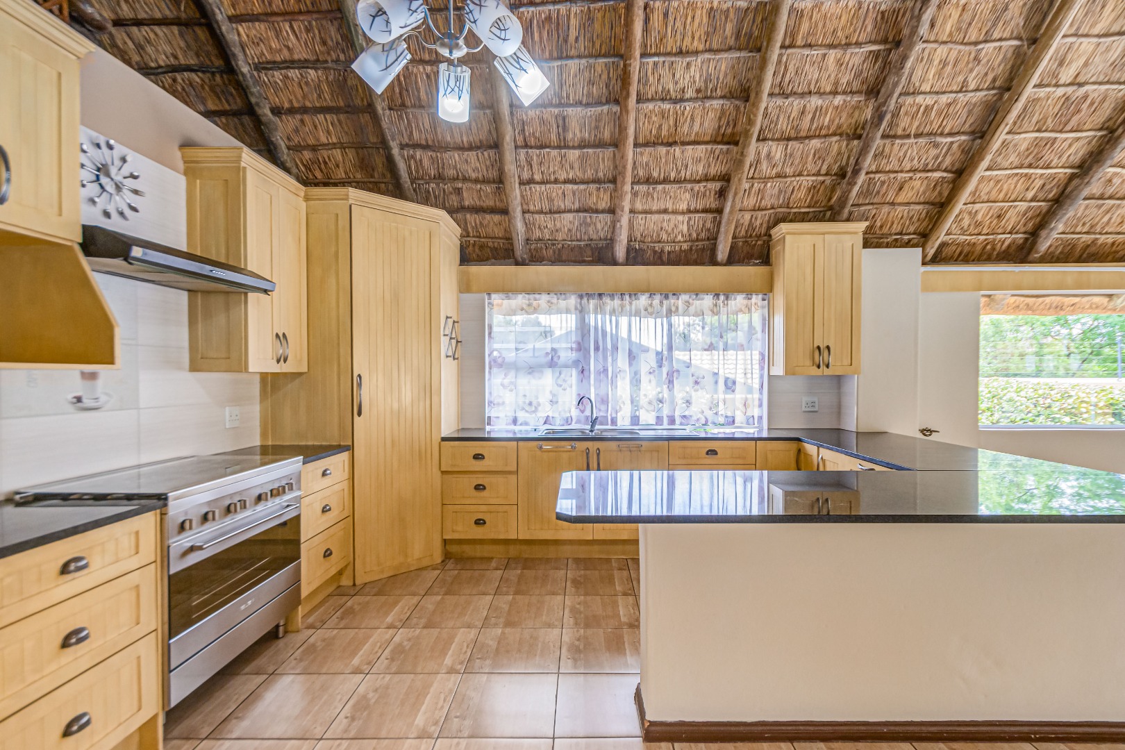 The modern kitchen is fitted with granite countertops, a freestanding gas stove, breakfast area, and separate scullery. A covered patio off the kitchen enjoys views of the pool, while a spacious bar room provides additional entertainment space for hosting family and friends.
