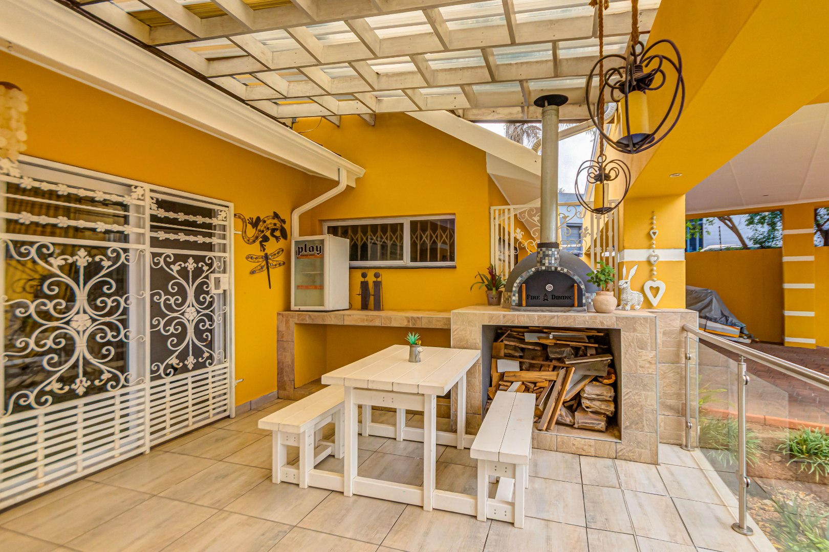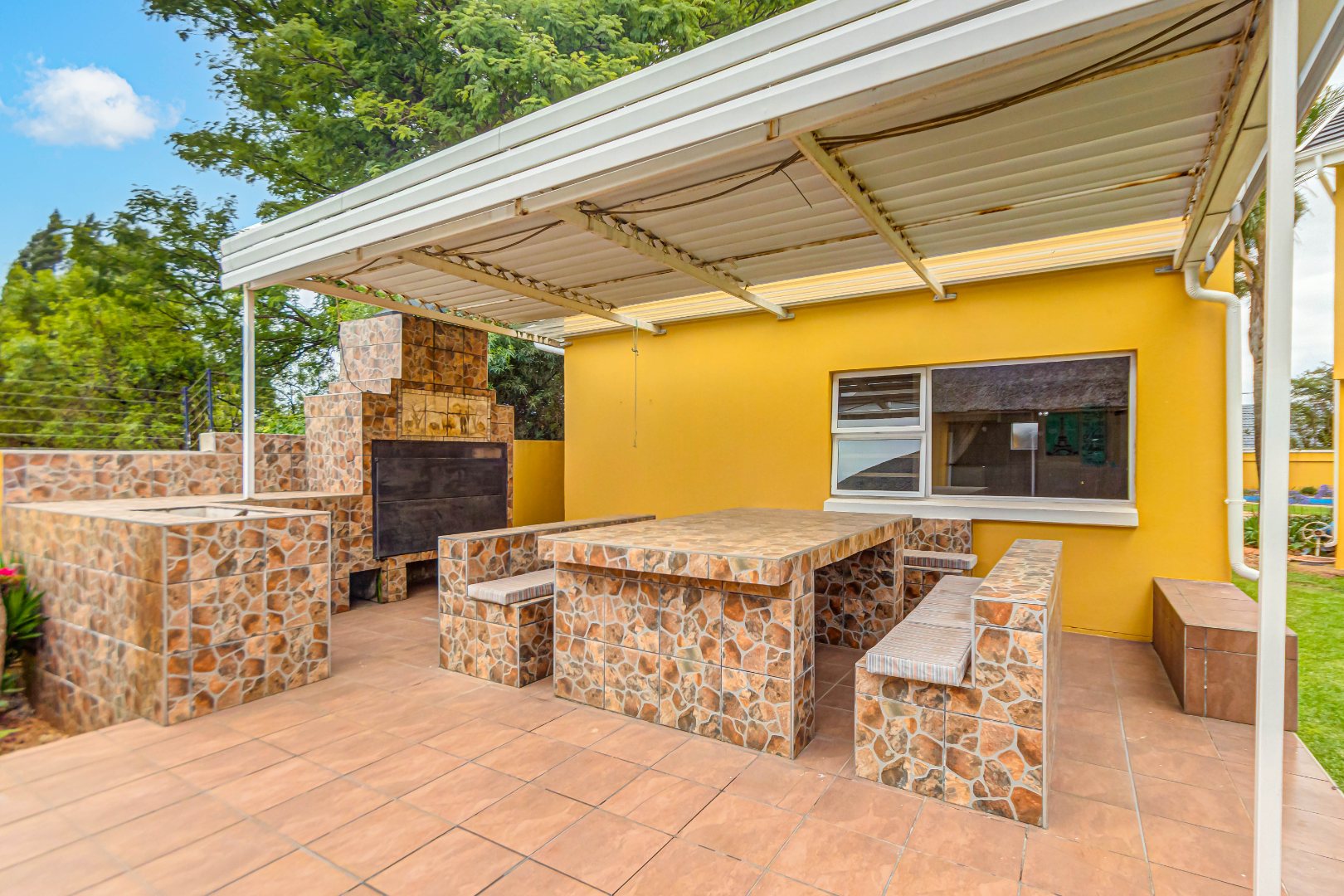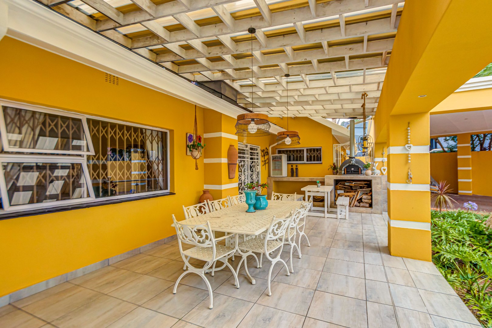 The main residence features four well-sized bedrooms and multiple living areas, including a formal lounge with wood-burning fireplace, an open-plan dining room, and a large family room. The dining area opens onto a covered entertainment patio complete with a built-in braai and pizza oven, overlooking the garden and pool.