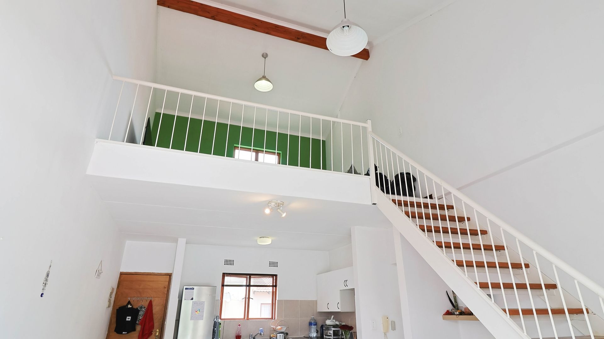 To the right, a staircase leads to a large loft area, offering versatile space ideal for a home office, second bedroom, or additional living area.