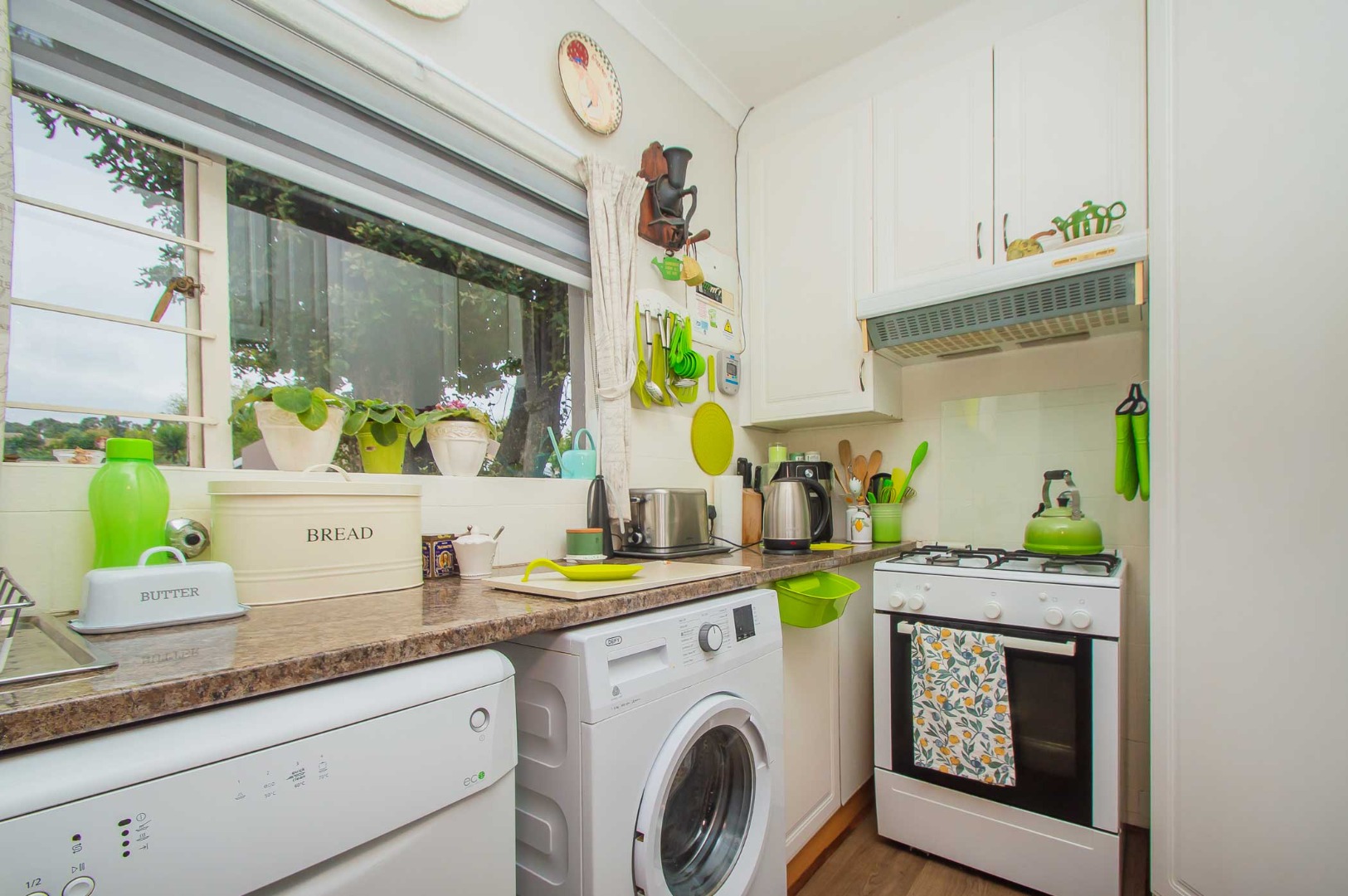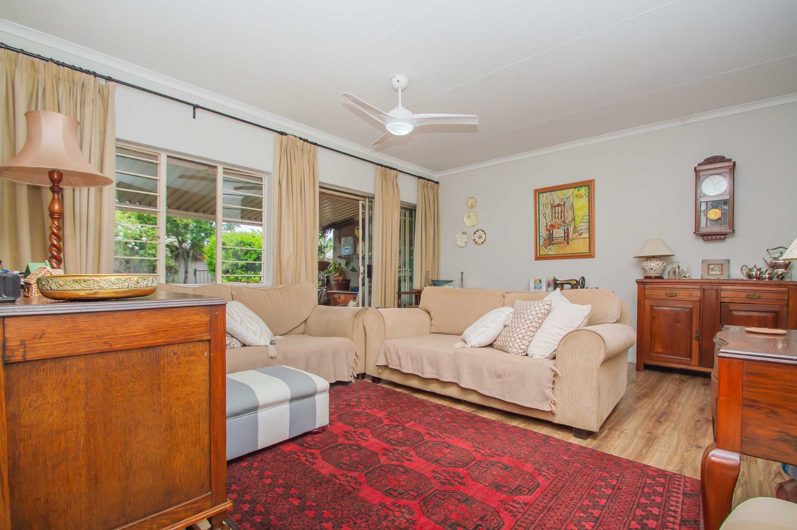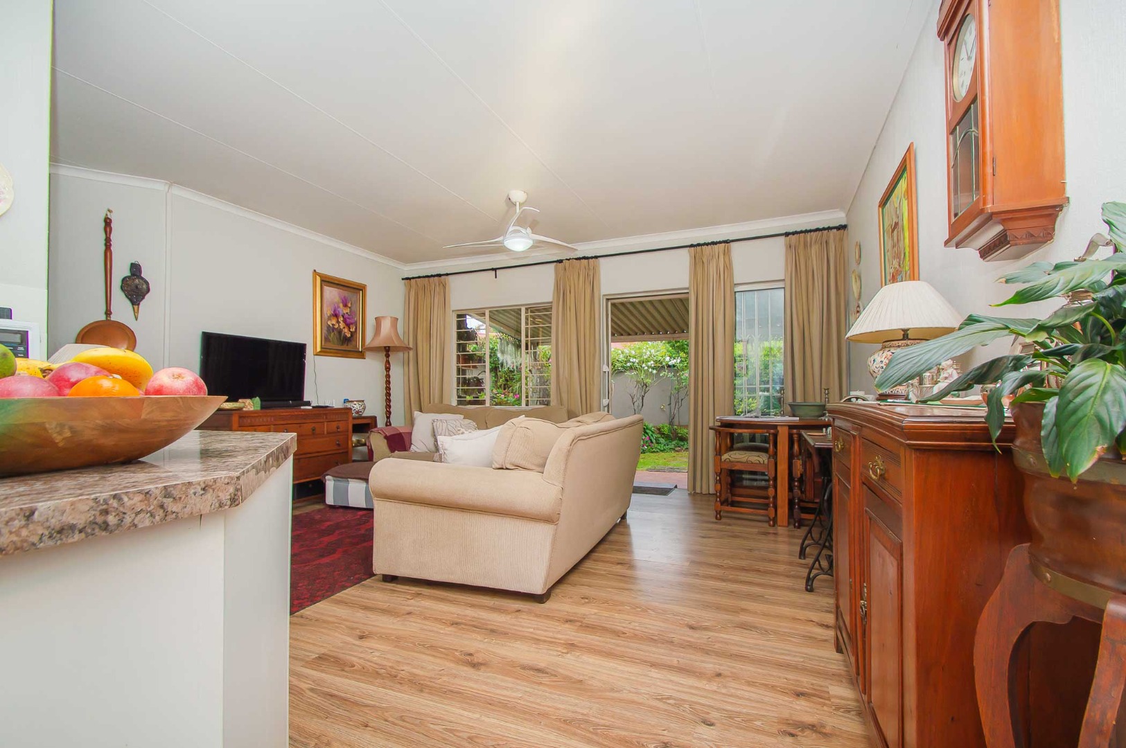 Tranquil and large open-plan modern kitchen with a breakfast nook, granite stone counter tops, space for 3x under counter appliances, a gas oven and hob, a pantry, space for a fridge and extra cupboards overlooking the large living area that sets the scene - it has a ceiling fan and is complimented with laminate flooring. The living areas that lead out to the undercover patio that overlooks the private, tranquil, manicured green garden that is pet friendly.