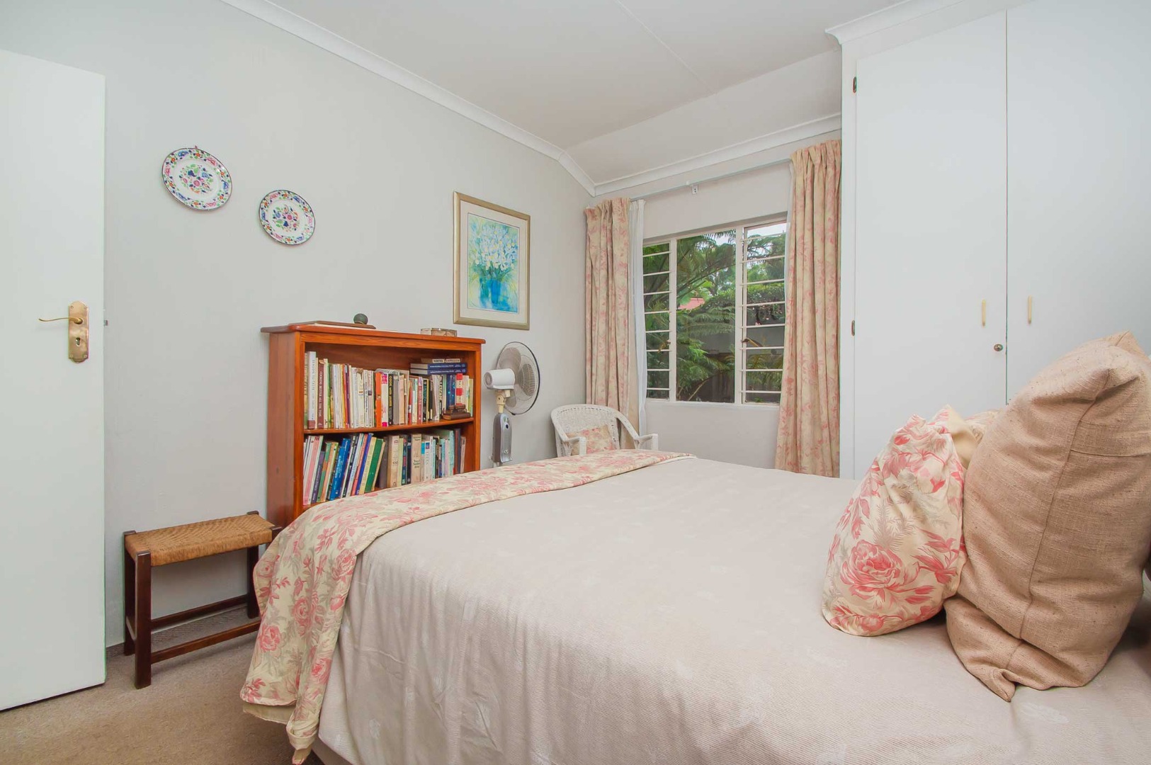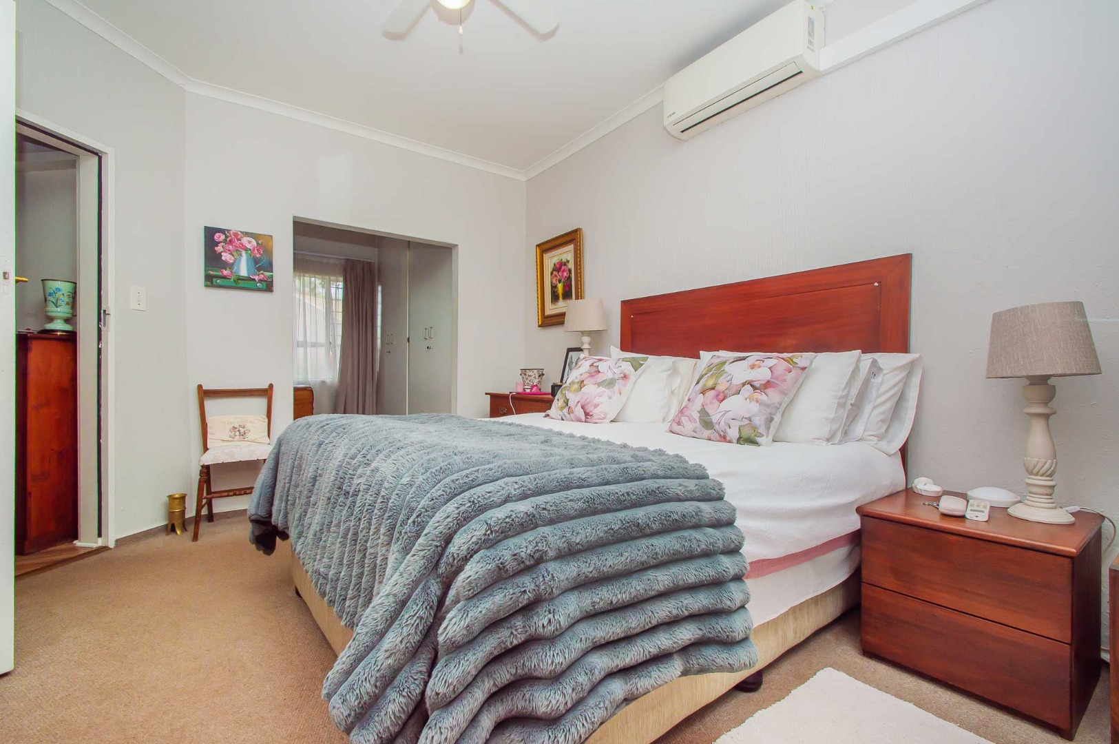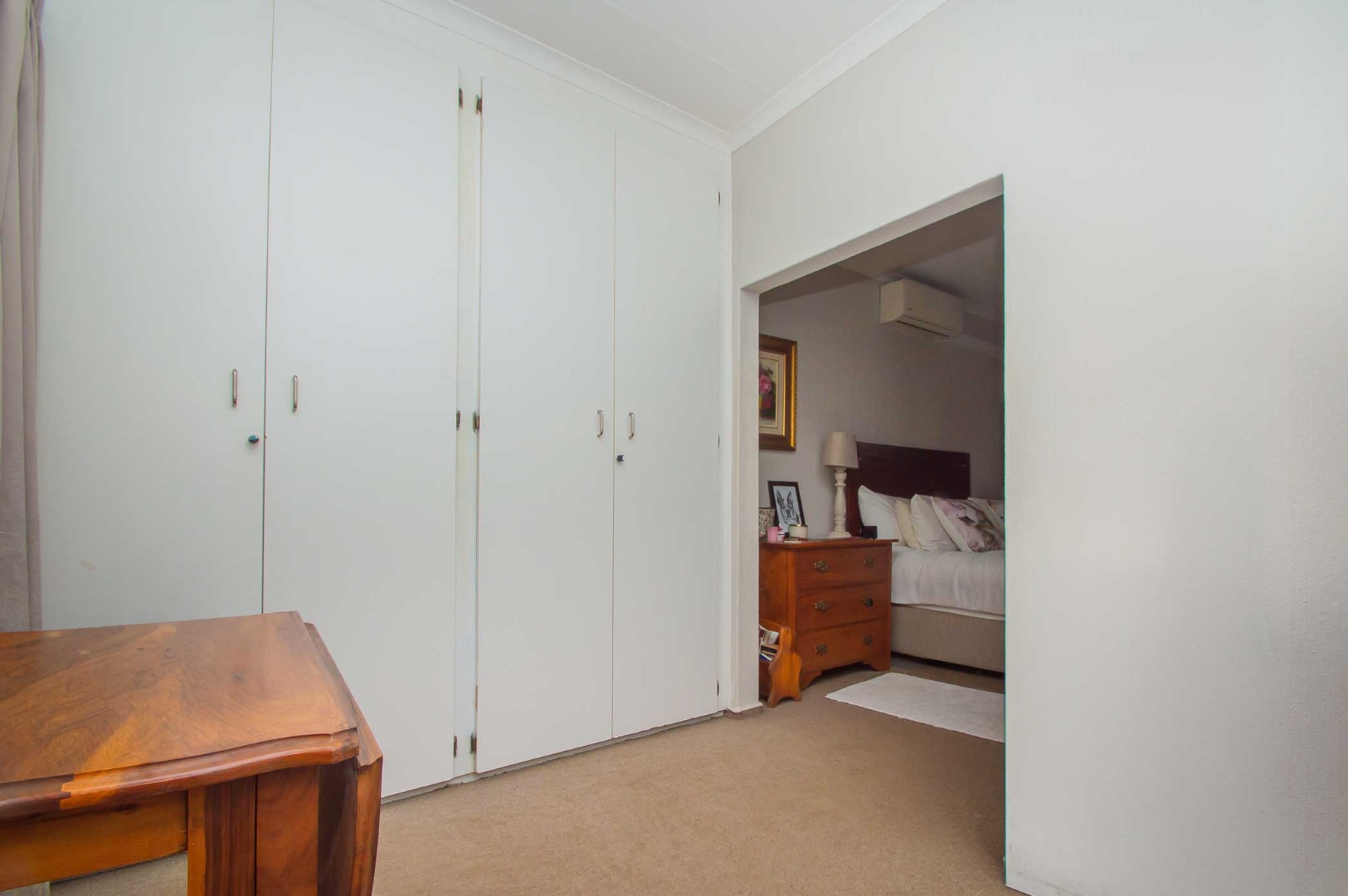 The main bedroom is spacious and cosy with ample cupboards and has an air conditioning unit, the second bedroom has been converted into a walk-in closet for the main bedroom and can be easily converted back into a second bedroom. The third bedroom is well-sized, has built-in cupboards and is filled with natural light.