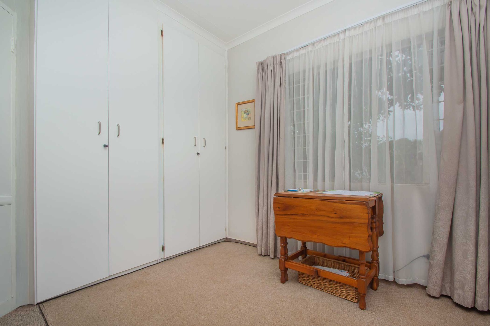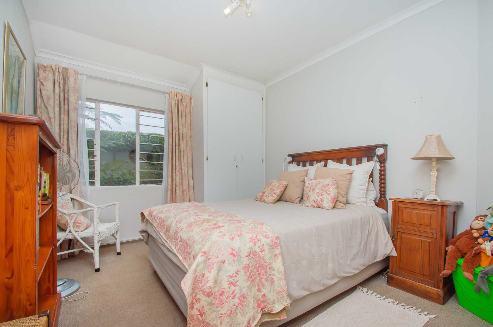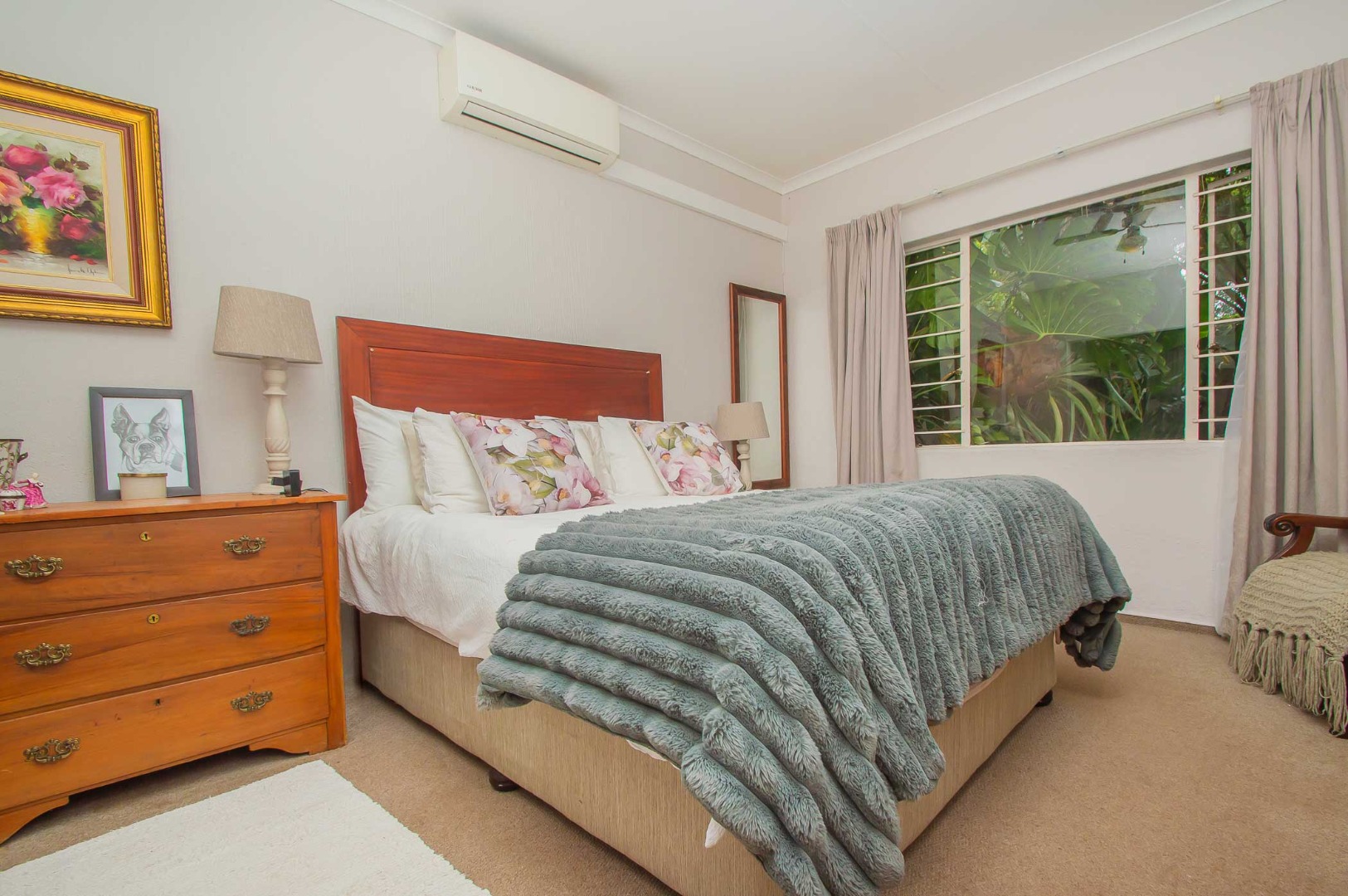 The main bedroom is spacious and cosy with ample cupboards and has an air conditioning unit, the second bedroom has been converted into a walk-in closet for the main bedroom and can be easily converted back into a second bedroom. The third bedroom is well-sized, has built-in cupboards and is filled with natural light.