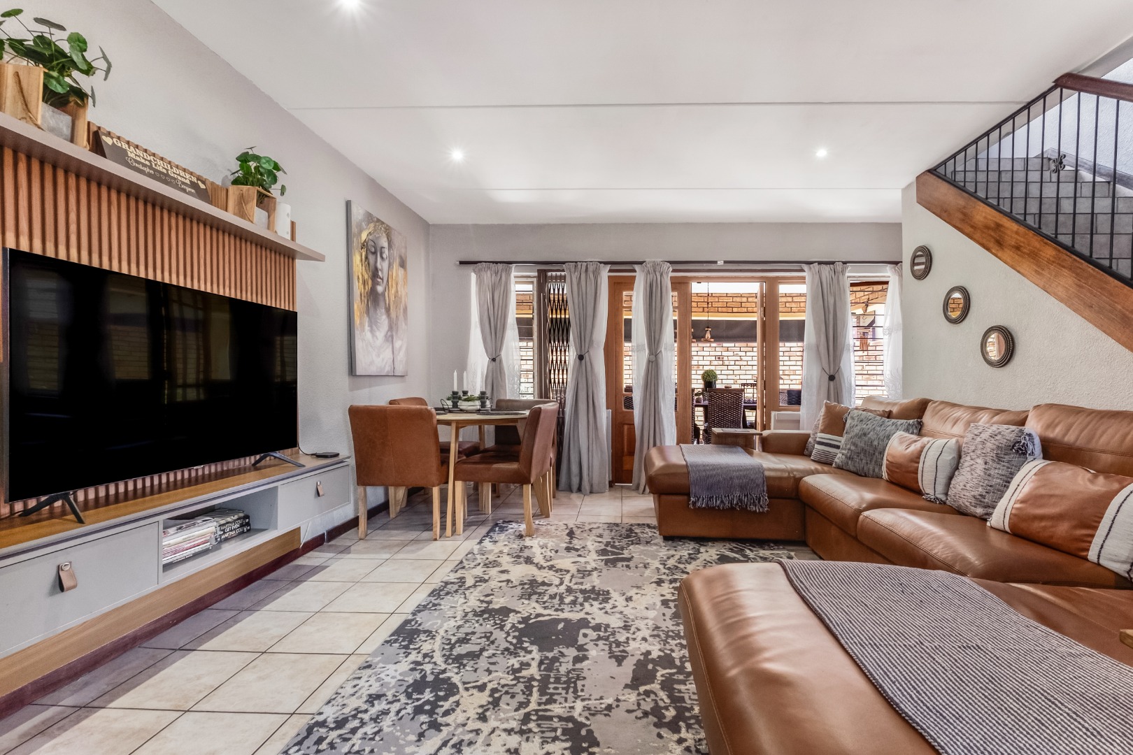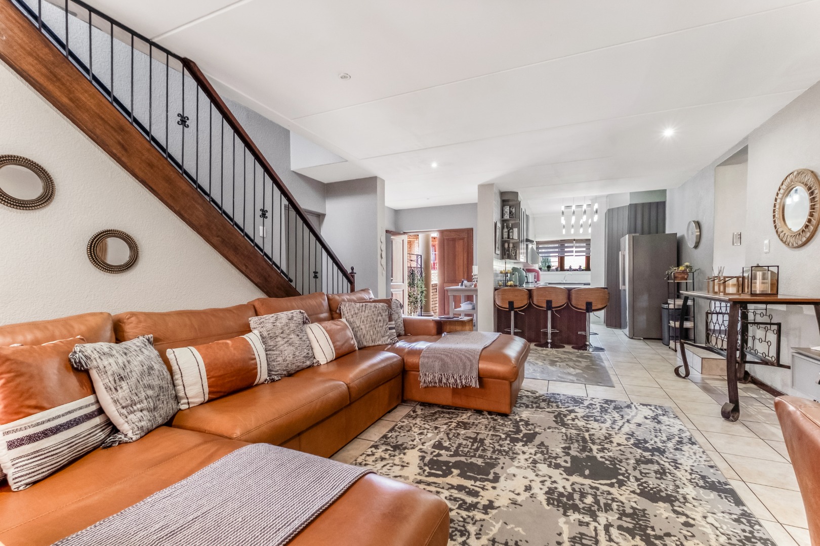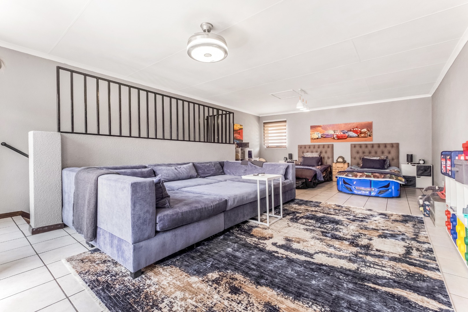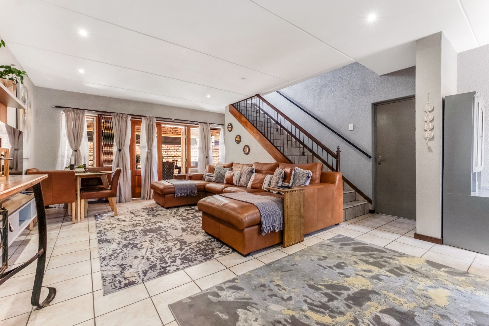 Enter into formal entrance hall with spacious living area with modern Kitchen. The living area leads out to the covered patio with Built in Braai. The Open Plan kitchen offers breakfast bar/counter, ample cupboard and working space, stylish Light fittings. Granite Tops and Pantry cupboard. The scullery and back door lead out to the Private Drying Yard. Three bedrooms with laminated flooring in mint condition. The master bedroom has ample cupboard space with a full bathroom. The one bedroom has French doors leading into the garden. The guest Bathroom offers a bath only. Upstairs offers a family room/PJ Lounge consisting of 65 sqm, the one side could easily be used as work from office or Dry walled for separate space. This property is tucked away in the heart of the complex. The double automated garages offer direct access into the home. The small garden offers a beautiful established garden to the one side and the other side is paved for small pets and grassed drying area all with minimal upkeep. Double Automated garages with direct access into the house. Pet friendly (2) Fibre Ready. This complex is safe and secure with Electric Fence and Affordable Levies. Visitors Parking. This home ideal for starter family with minimal Maintenance. The Invertor and Solar system are owned outright with no lease or contract. Both bathrooms and kitchen have blinds. Bedrooms laminated flooring and Living areas are tiled. The property is full enclosed for pets. Please email us to make arrangements to view.