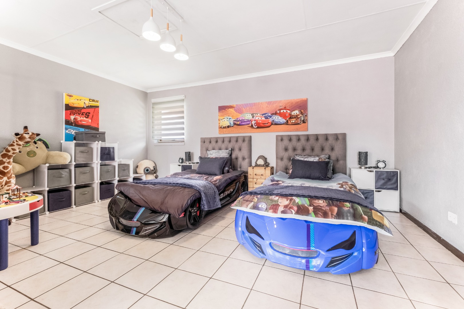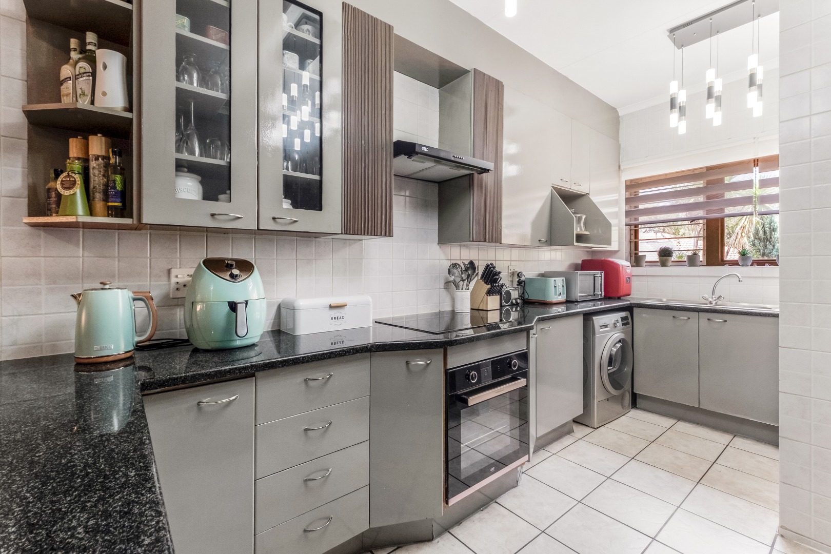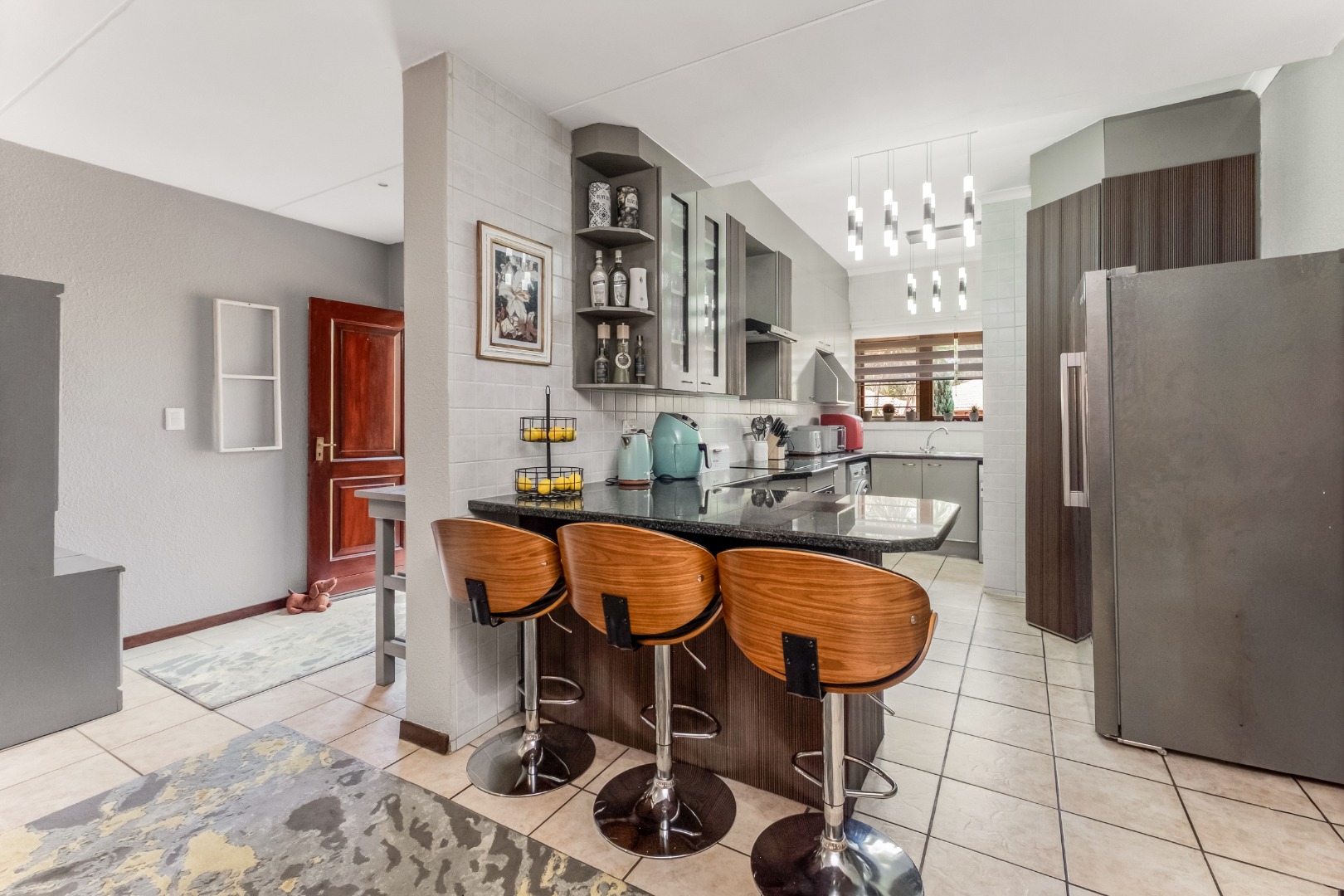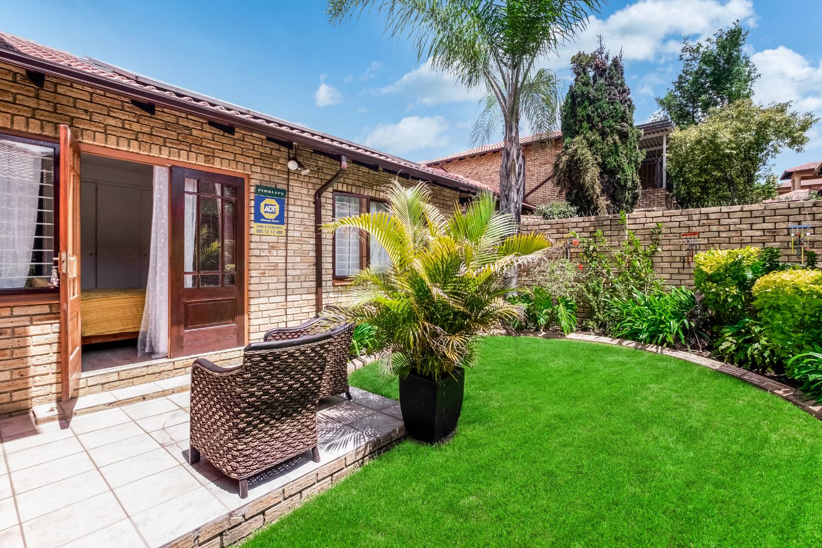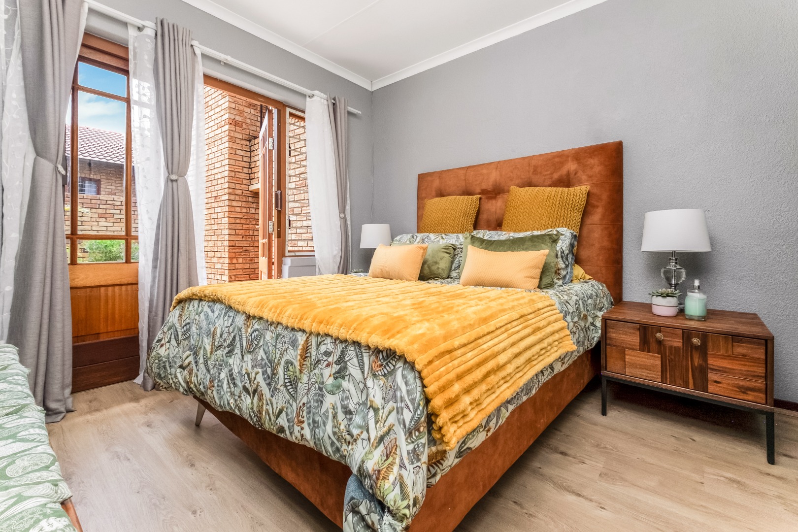 Enter into formal entrance hall with spacious living area with modern Kitchen. The living area leads out to the covered patio with Built in Braai. The Open Plan kitchen offers breakfast bar/counter, ample cupboard and working space, stylish Light fittings. Granite Tops and Pantry cupboard. The scullery and back door lead out to the Private Drying Yard. Three bedrooms with laminated flooring in mint condition. The master bedroom has ample cupboard space with a full bathroom. The one bedroom has French doors leading into the garden. The guest Bathroom offers a bath only. Upstairs offers a family room/PJ Lounge consisting of 65 sqm, the one side could easily be used as work from office or Dry walled for separate space. This property is tucked away in the heart of the complex. The double automated garages offer direct access into the home. The small garden offers a beautiful established garden to the one side and the other side is paved for small pets and grassed drying area all with minimal upkeep. Double Automated garages with direct access into the house. Pet friendly (2) Fibre Ready. This complex is safe and secure with Electric Fence and Affordable Levies. Visitors Parking. This home ideal for starter family with minimal Maintenance. The Invertor and Solar system are owned outright with no lease or contract. Both bathrooms and kitchen have blinds. Bedrooms laminated flooring and Living areas are tiled. The property is full enclosed for pets. Please email us to make arrangements to view.