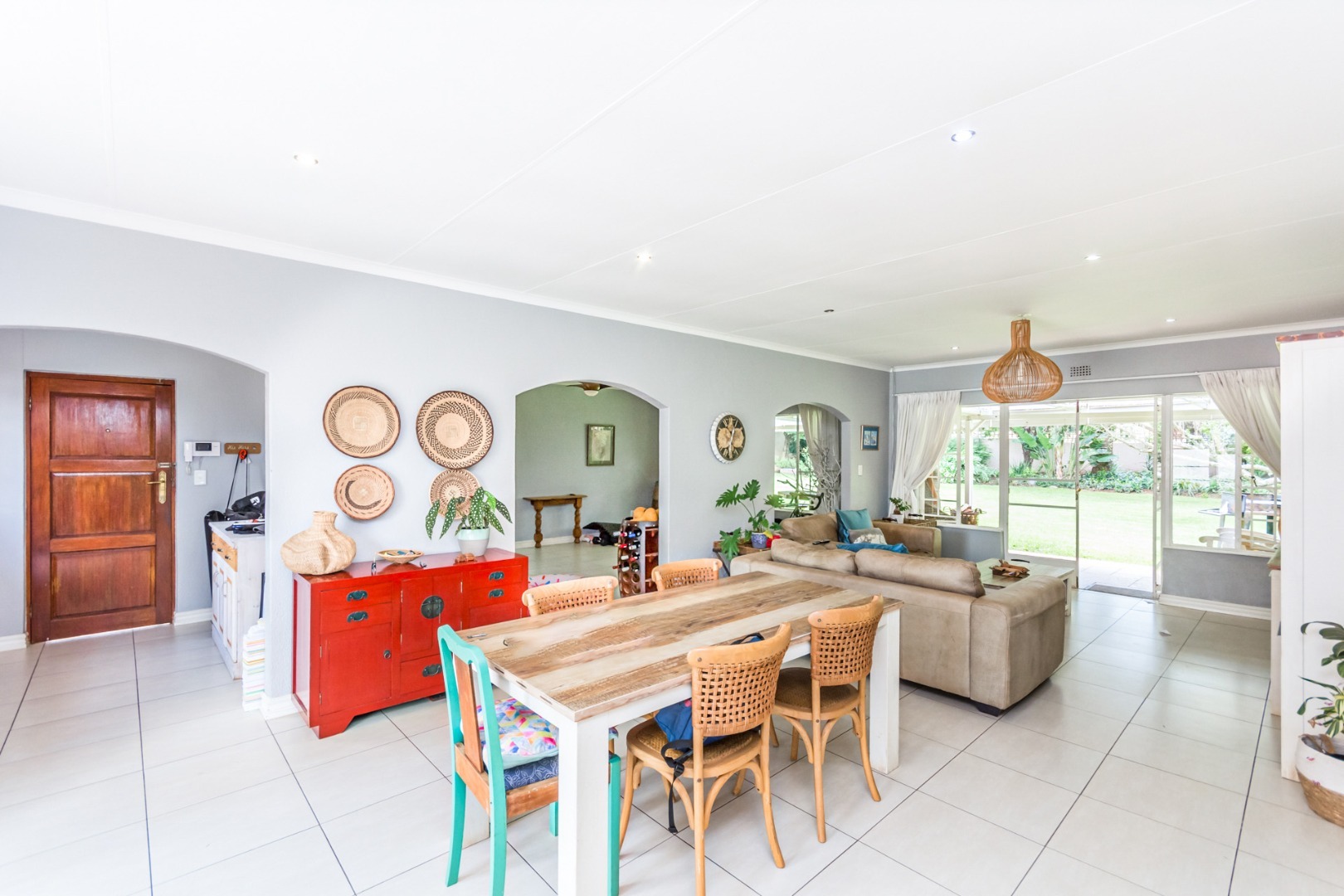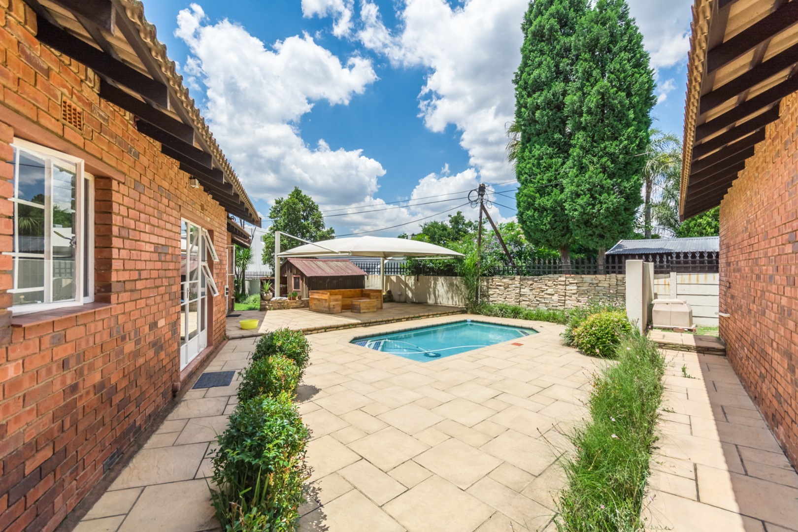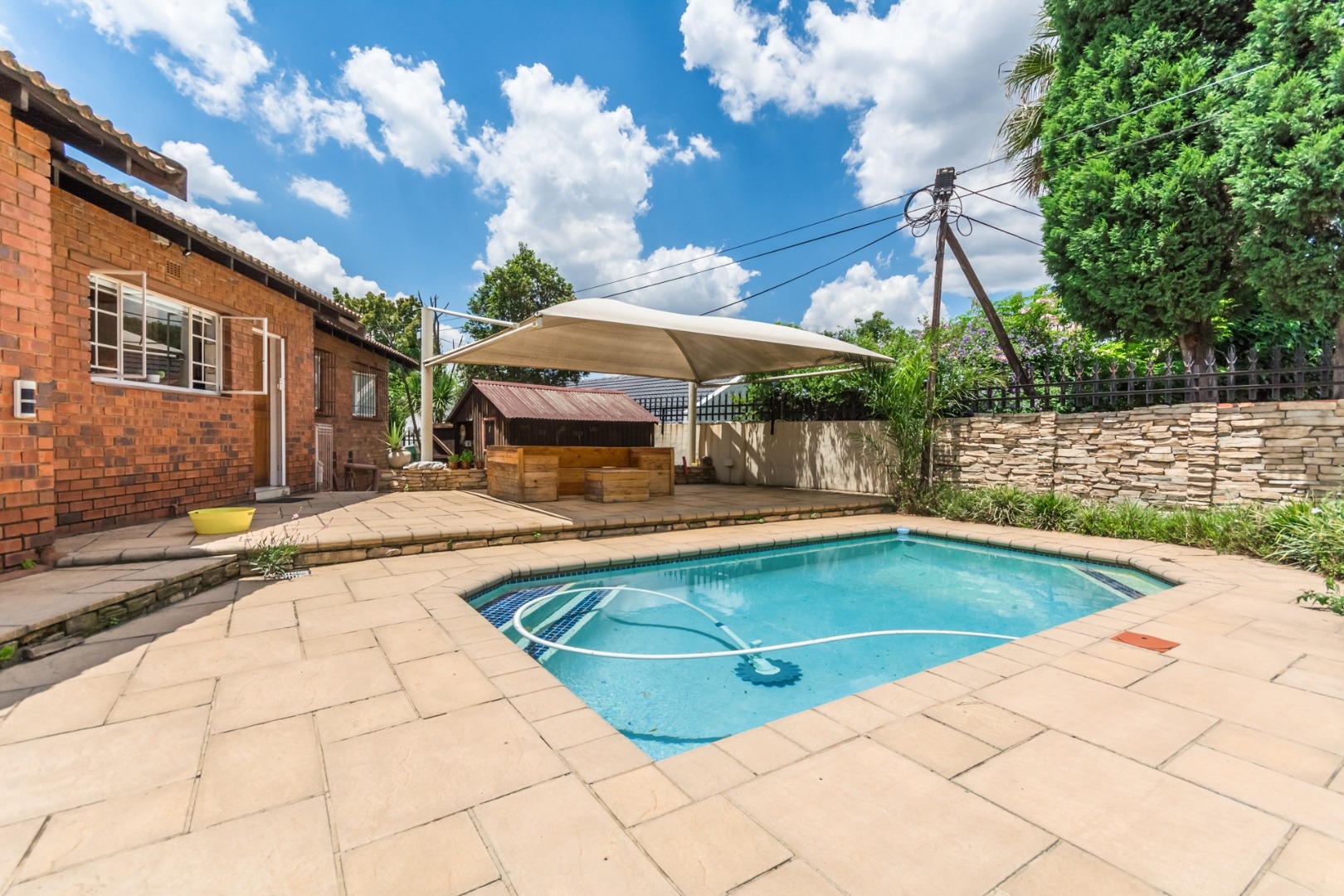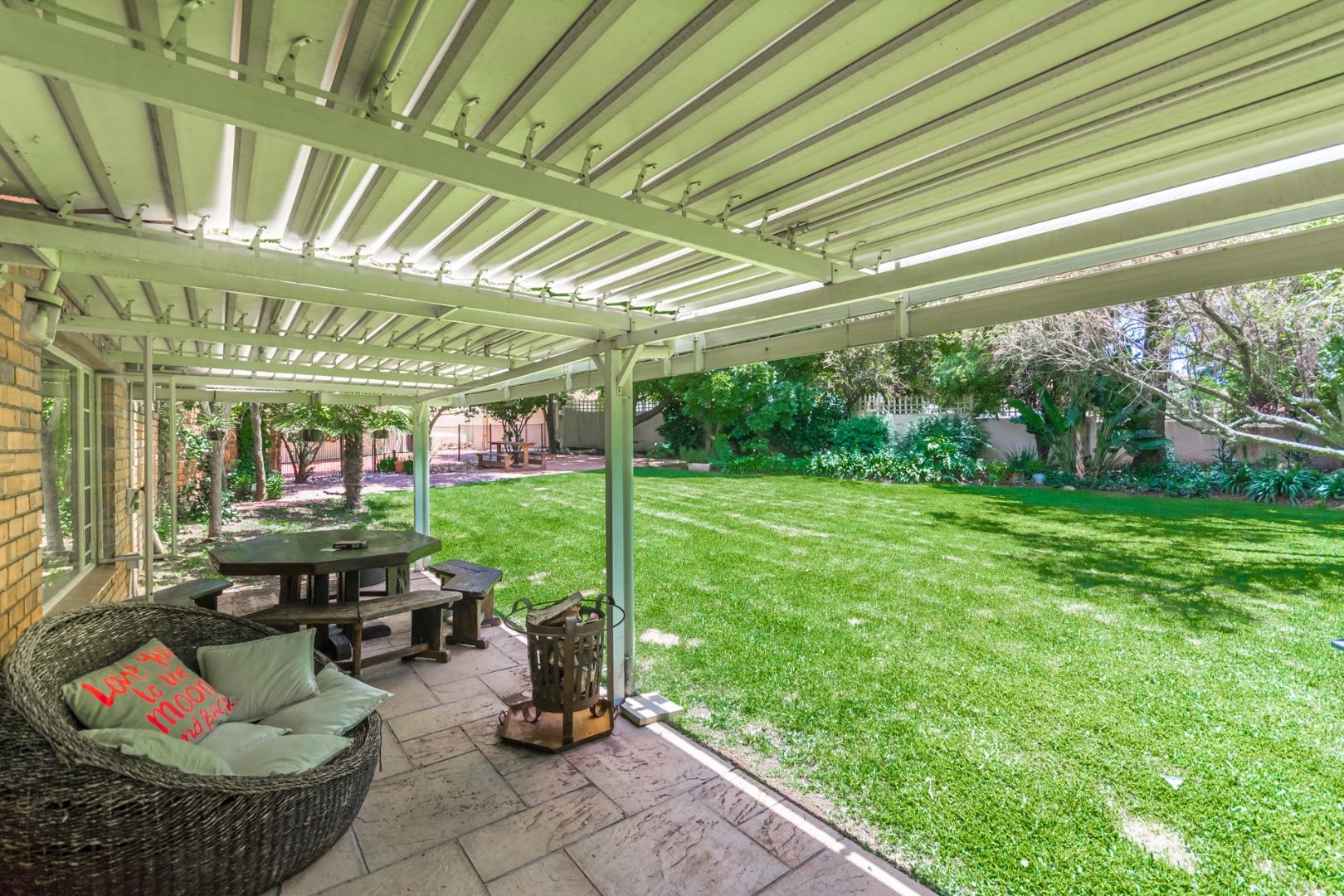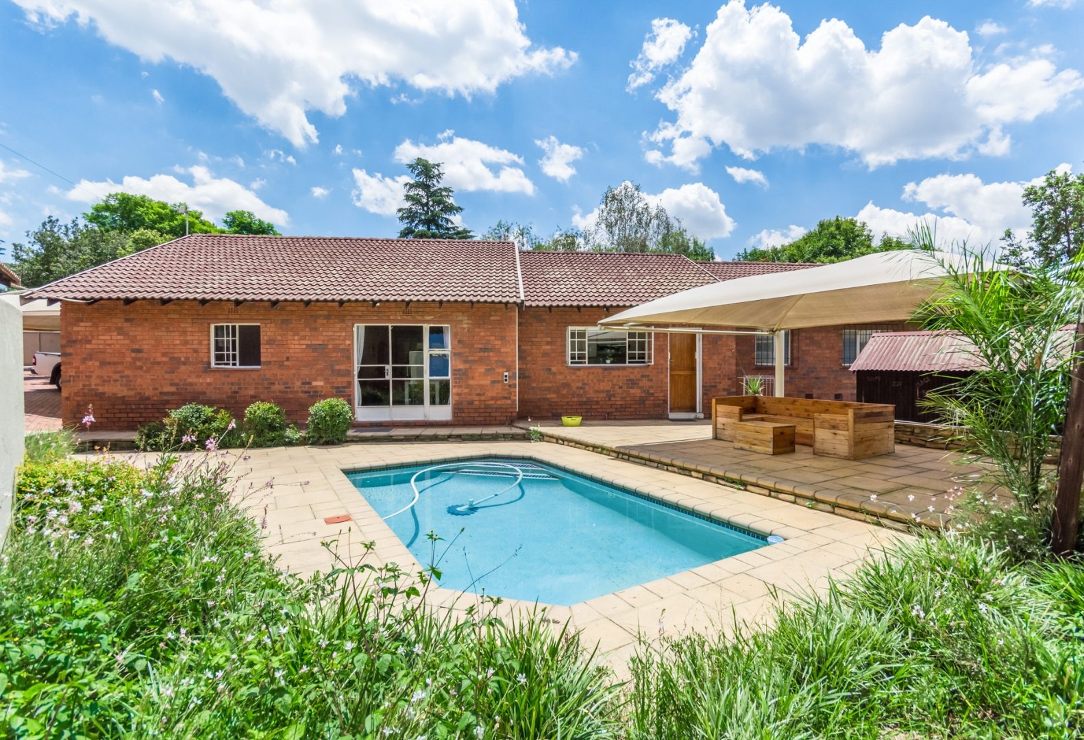 Step into the spacious open-plan lounge, dining room, and family room, which effortlessly flow to the exterior of the home on either side. This layout is ideal for hosting gatherings or enjoying quality family time. The separate kitchen is well-equipped with ample cupboard space and accommodates a double-door fridge, catering to all your culinary needs. Enjoy the outdoors on the covered patio that overlooks a large, lush garden—perfect for children to play and explore. Adjacent to the solar-heated swimming pool, you'll find an additional covered entertainment area, making it an ideal spot for socializing and relaxation. The home features three comfortable bedrooms, including a main bedroom with air-conditioning, and two bathrooms, with the main en-suite.