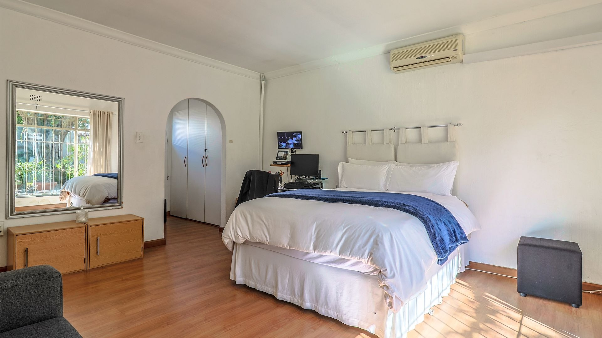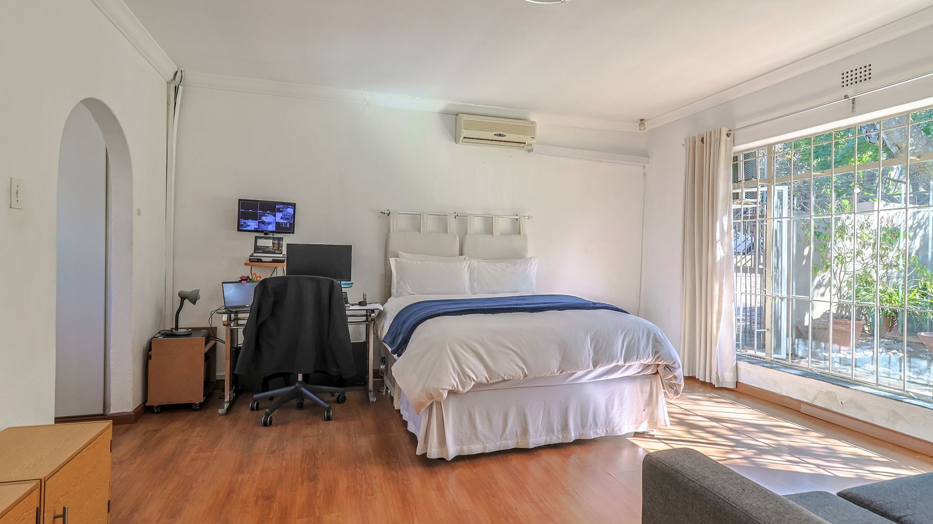 The main bedroom is a spacious peaceful retreat with its own air-conditioning, walk-in closet, and en-suite bathroom. It also opens up to the garden and pool, giving you a sense of calm and connection to nature each day.