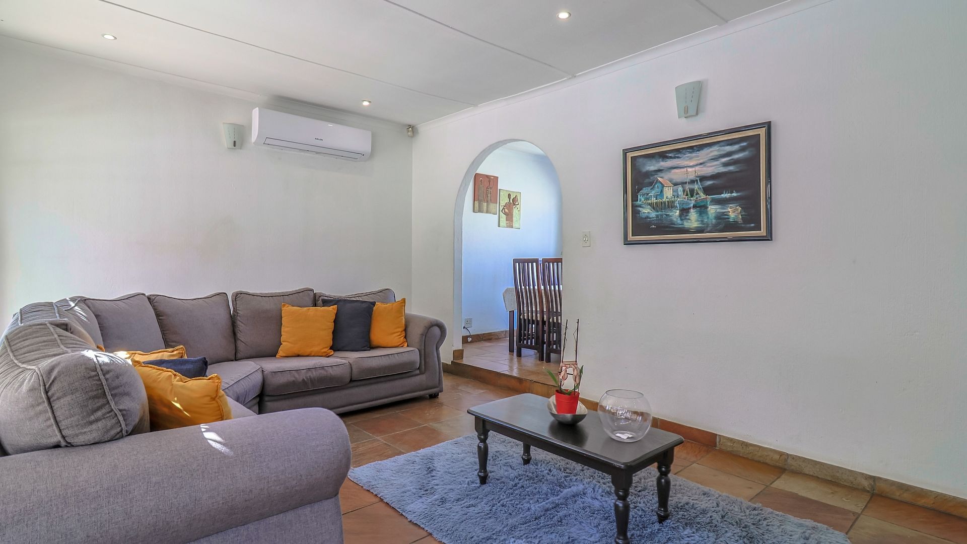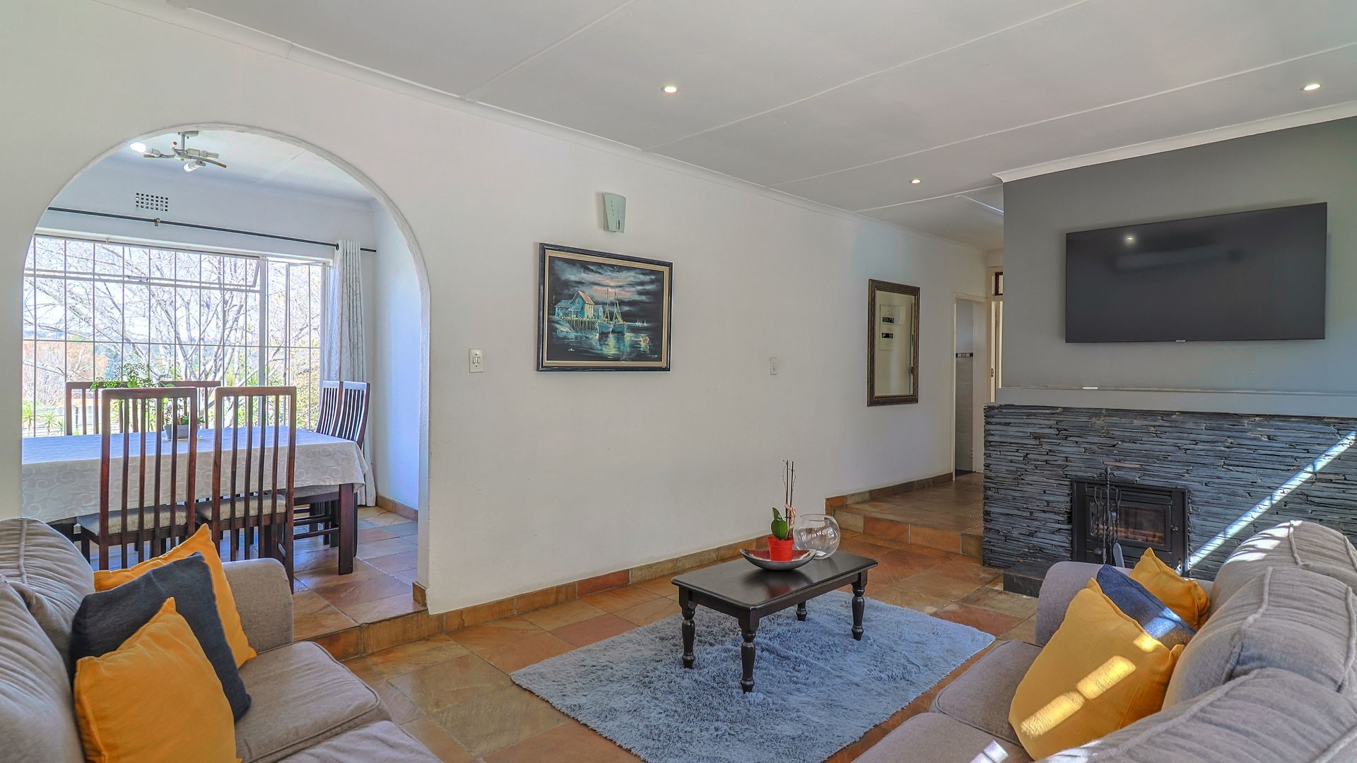 As you step inside, you are welcomed by a spacious, light-filled lounge complete with a fireplace for chilly winter evenings and air-conditioning for those warmer summer days. Sliding doors open up to a beautifully maintained garden and a sparkling swimming pool and patio area with braai — the perfect spot for relaxing weekends and sunny afternoons with loved ones.