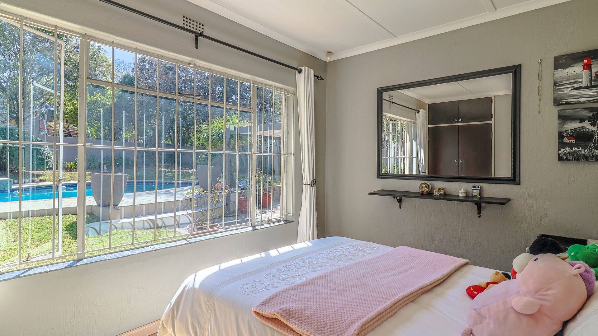 This home offers three warm and comfortable bedrooms. Two of the bedrooms enjoy lovely views of the garden and pool, while the third faces the serene back garden. These rooms share a neat bathroom with a shower.