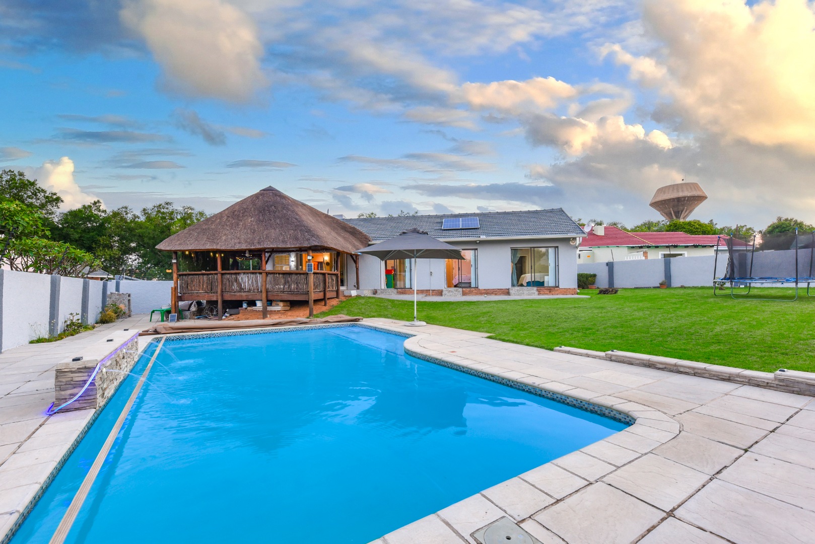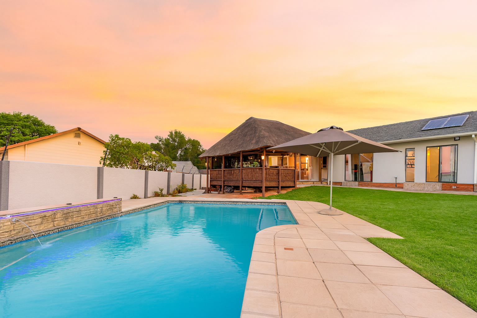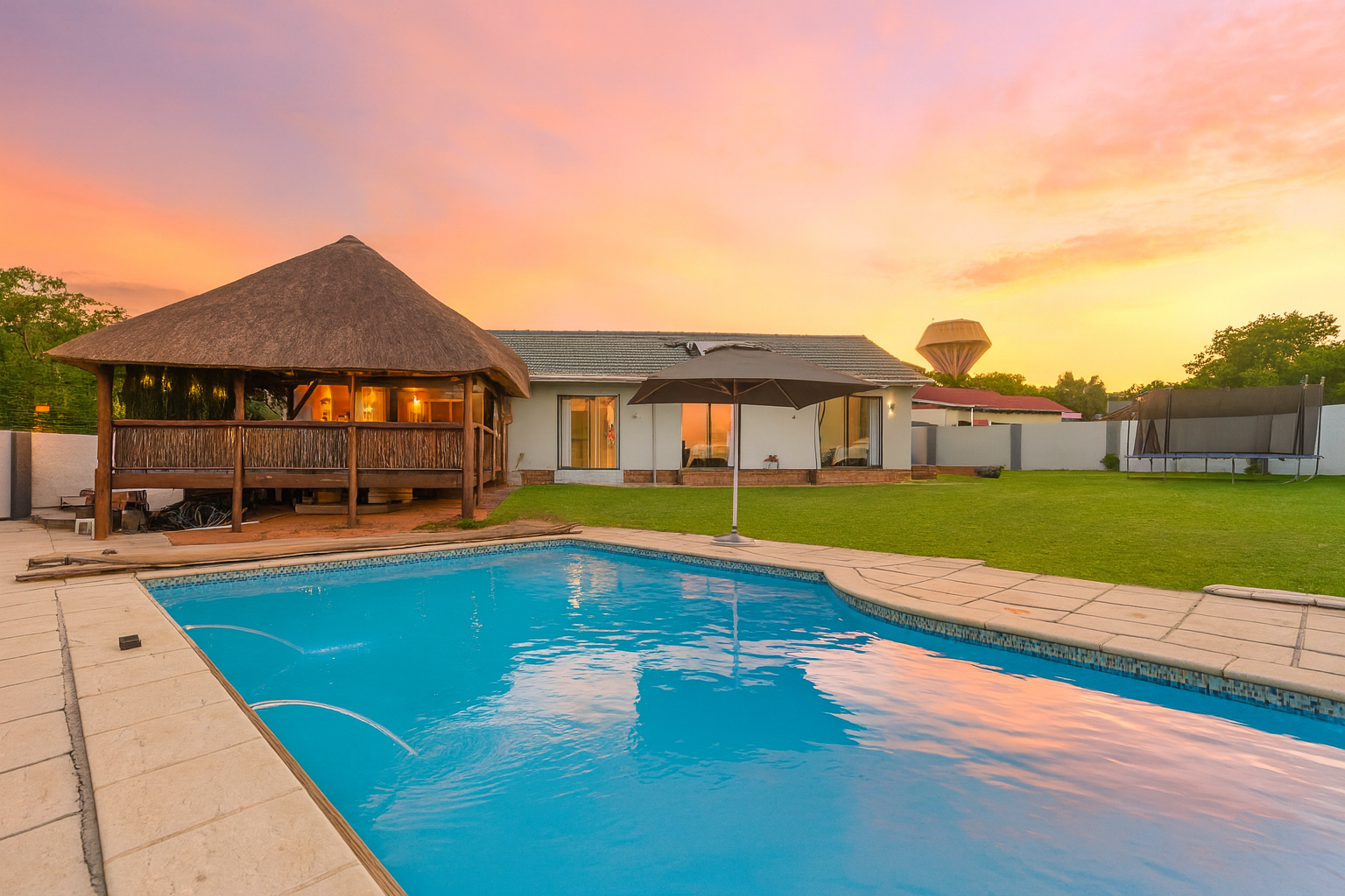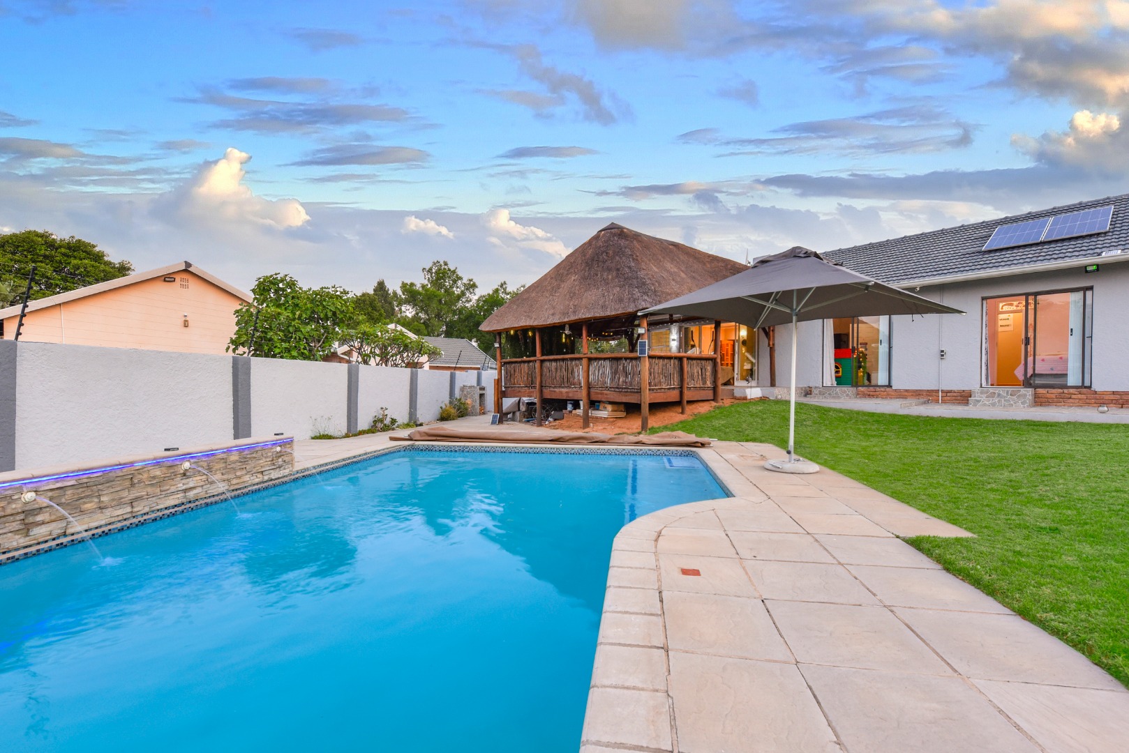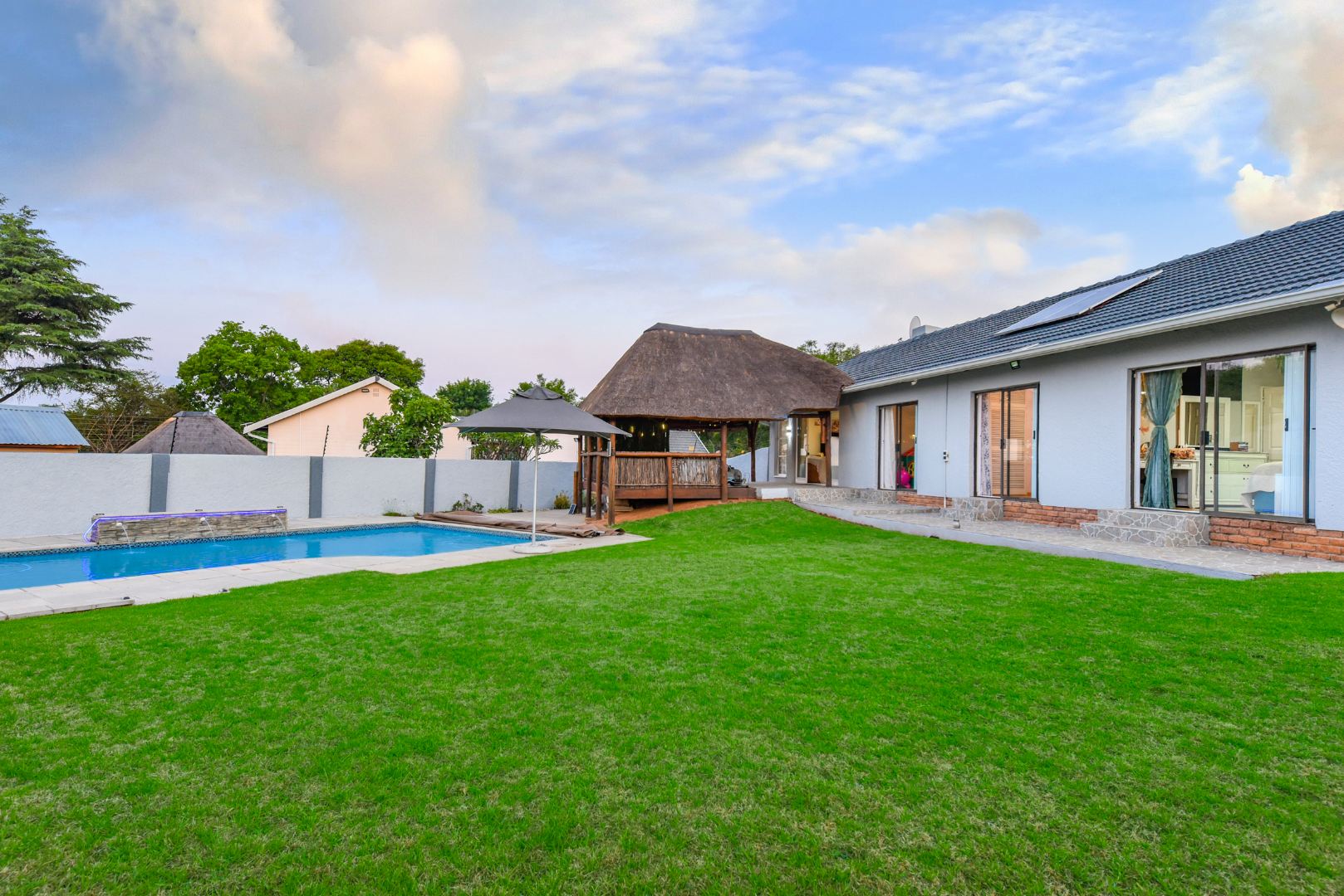 The expansive outdoor area is a true highlight, perfect for the South African lifestyle. A large, sparkling swimming pool and spacious, well-maintained lawn create an ideal setting for recreation. The charming thatched lapa, complete with lighting, offers an excellent entertainment space for gatherings. The property also features a lovely garden, paving, a Wendy house for storage, and generous off-street parking for up to six vehicles.