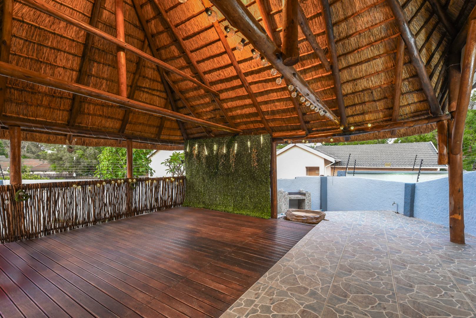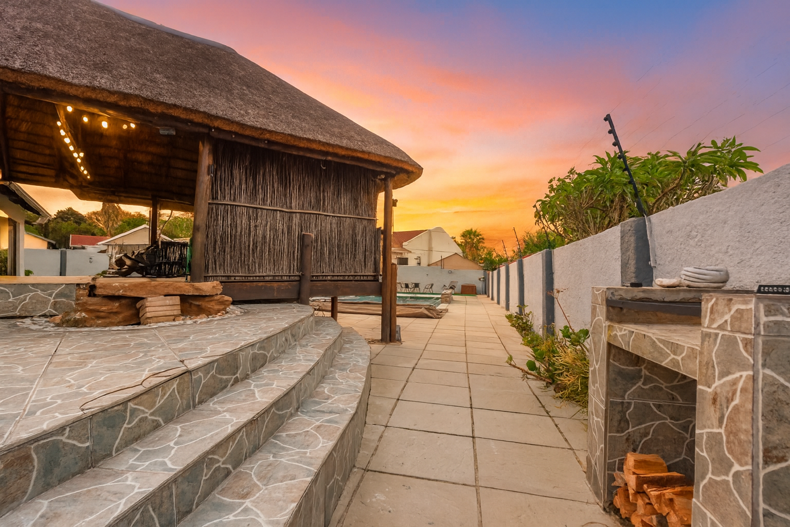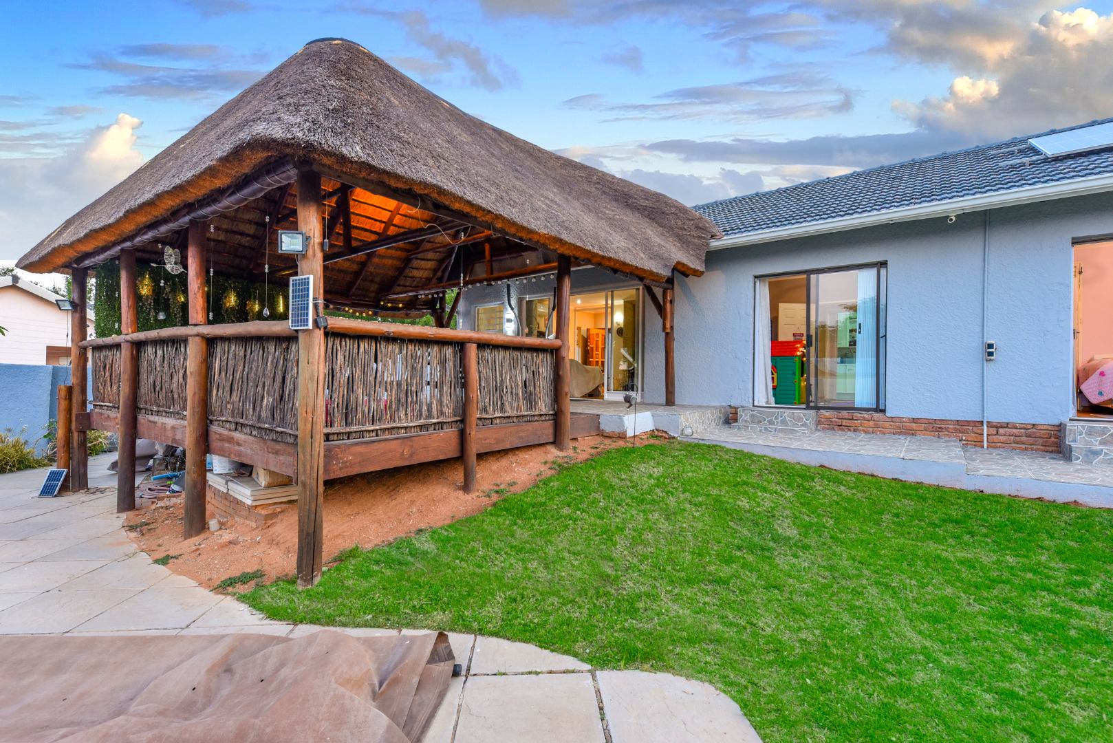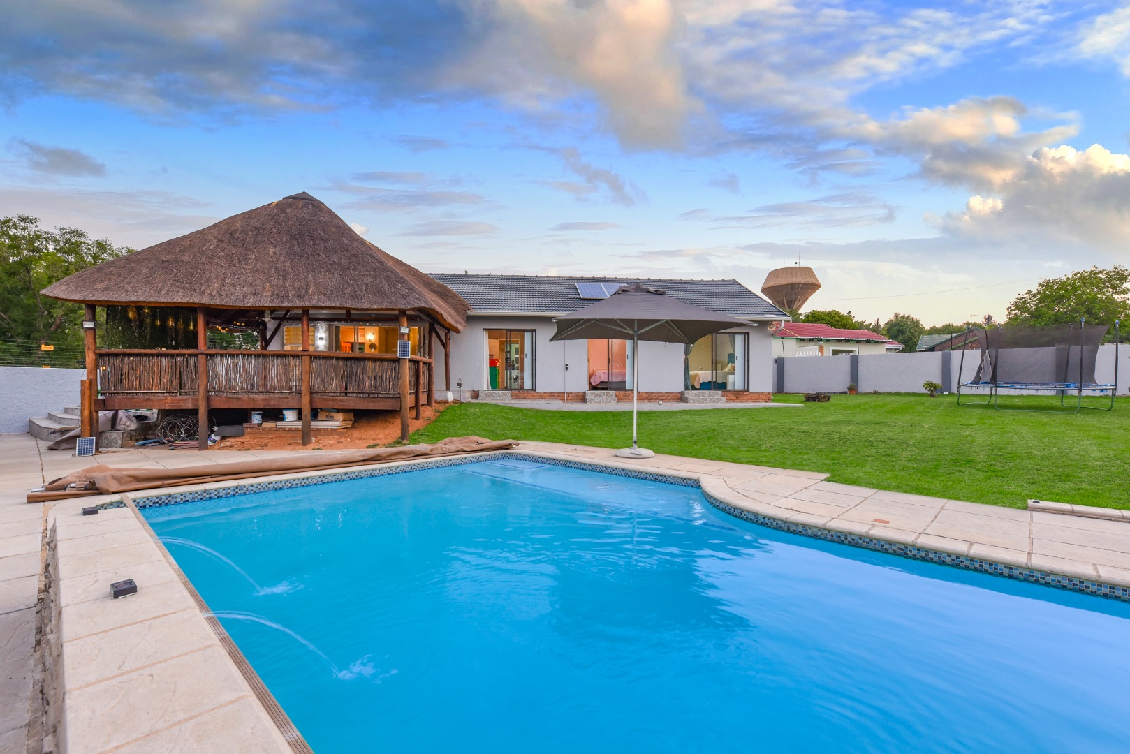 The expansive outdoor area is a true highlight, perfect for the South African lifestyle. A large, sparkling swimming pool and spacious, well-maintained lawn create an ideal setting for recreation. The charming thatched lapa, complete with lighting, offers an excellent entertainment space for gatherings. The property also features a lovely garden, paving, a Wendy house for storage, and generous off-street parking for up to six vehicles.