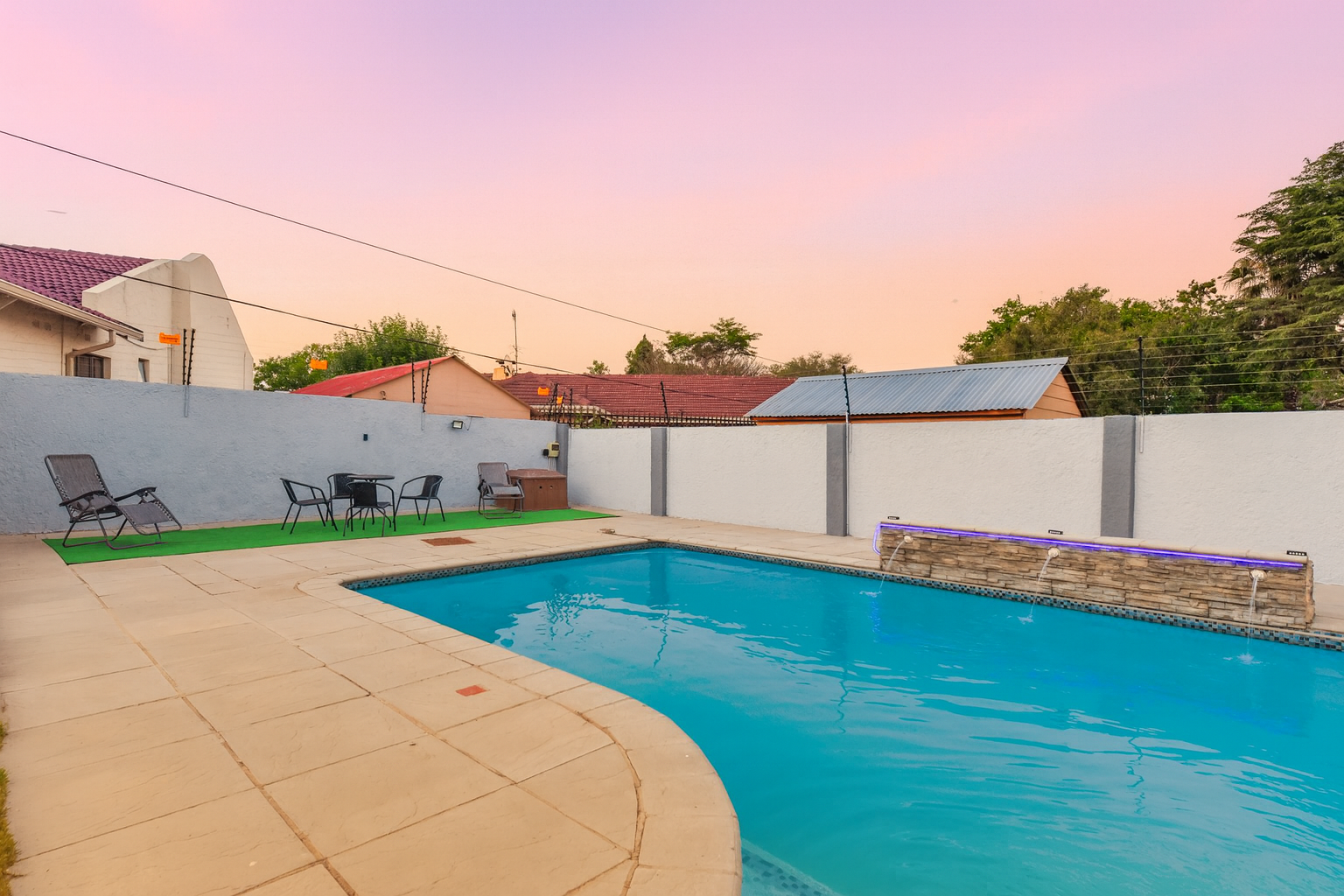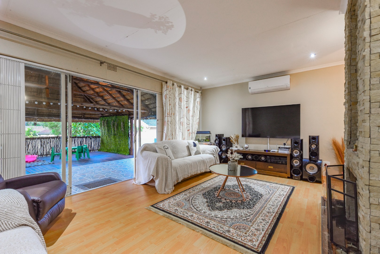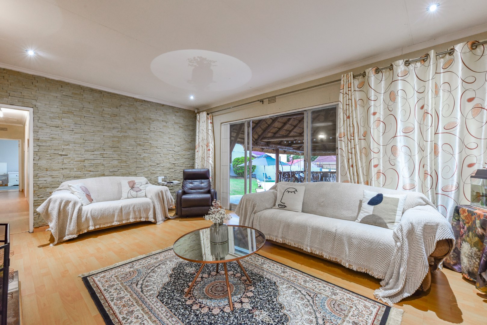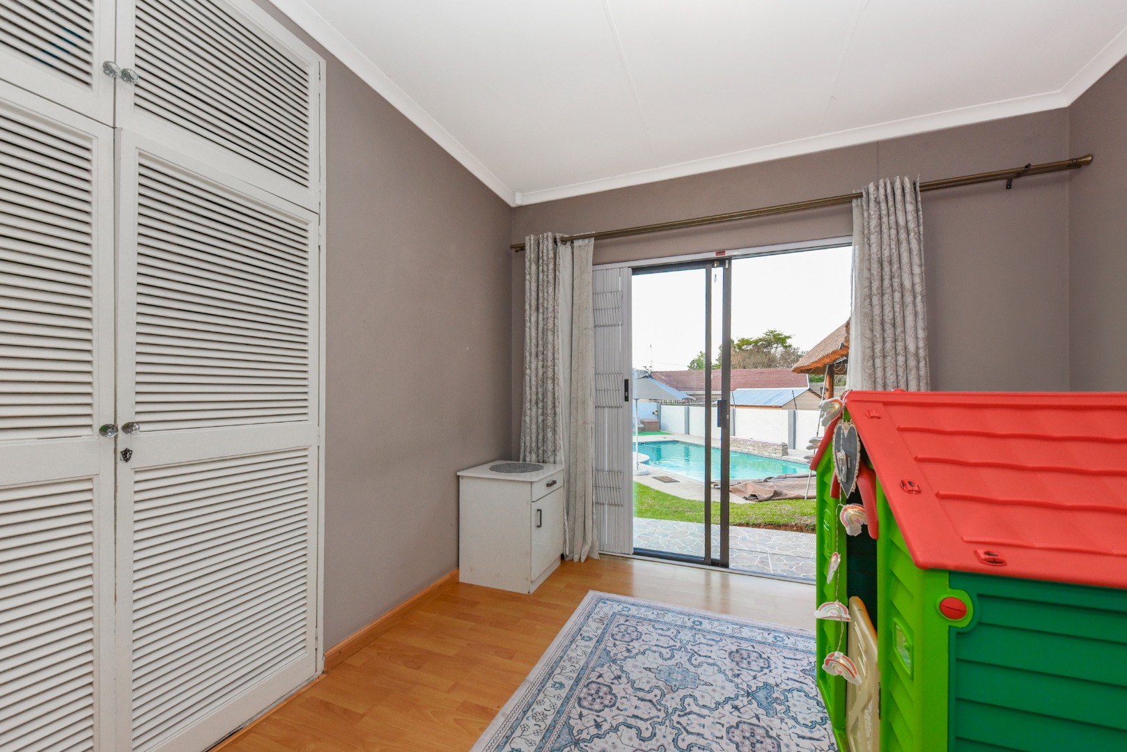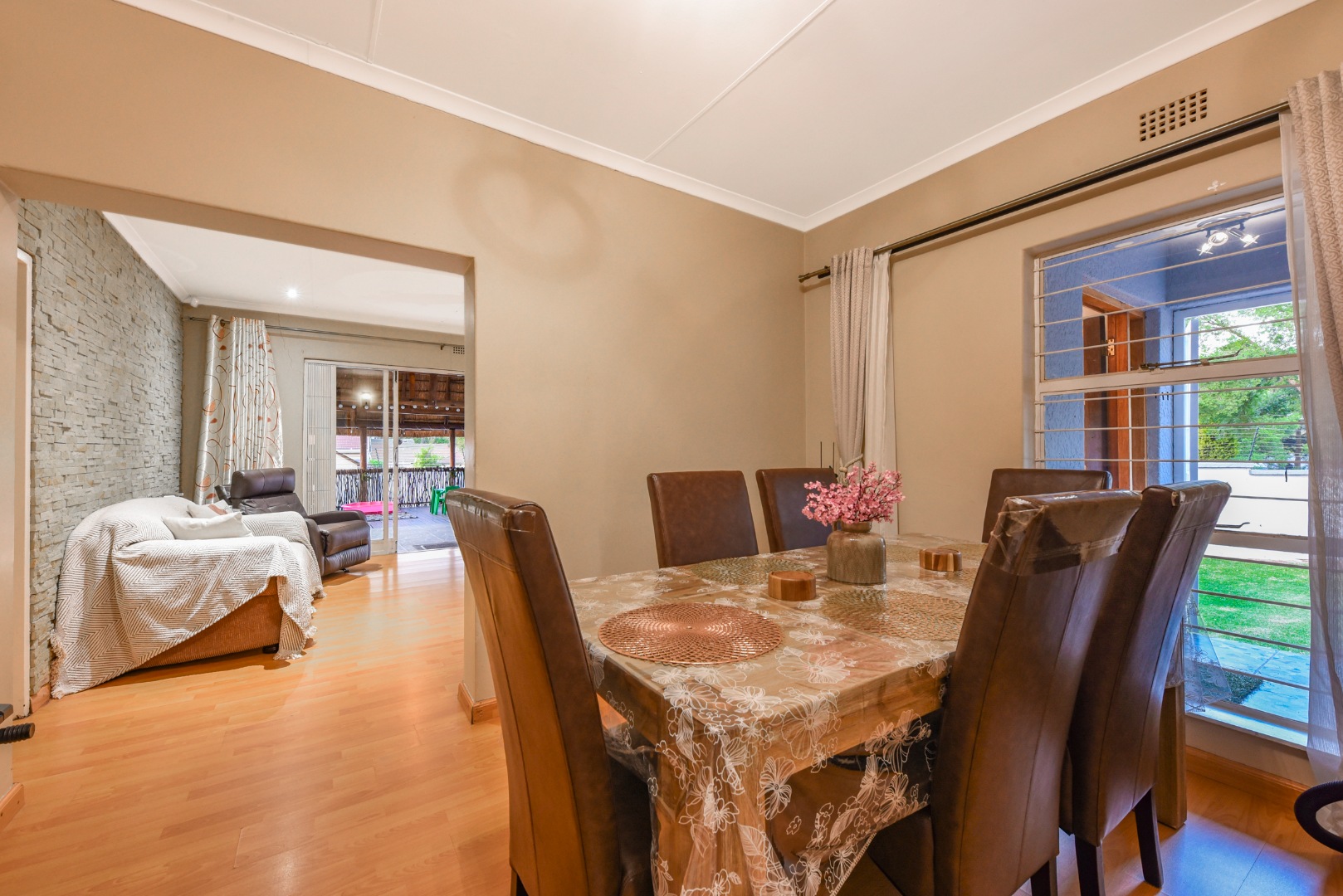 The expansive outdoor area is a true highlight, perfect for the South African lifestyle. A large, sparkling swimming pool and spacious, well-maintained lawn create an ideal setting for recreation. The charming thatched lapa, complete with lighting, offers an excellent entertainment space for gatherings. The property also features a lovely garden, paving, a Wendy house for storage, and generous off-street parking for up to six vehicles.