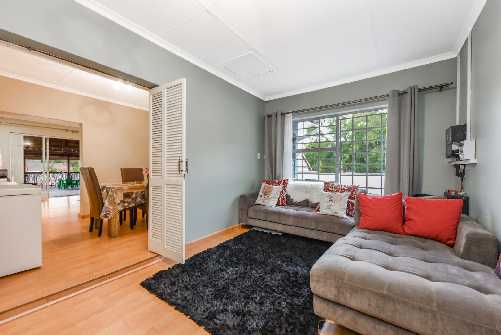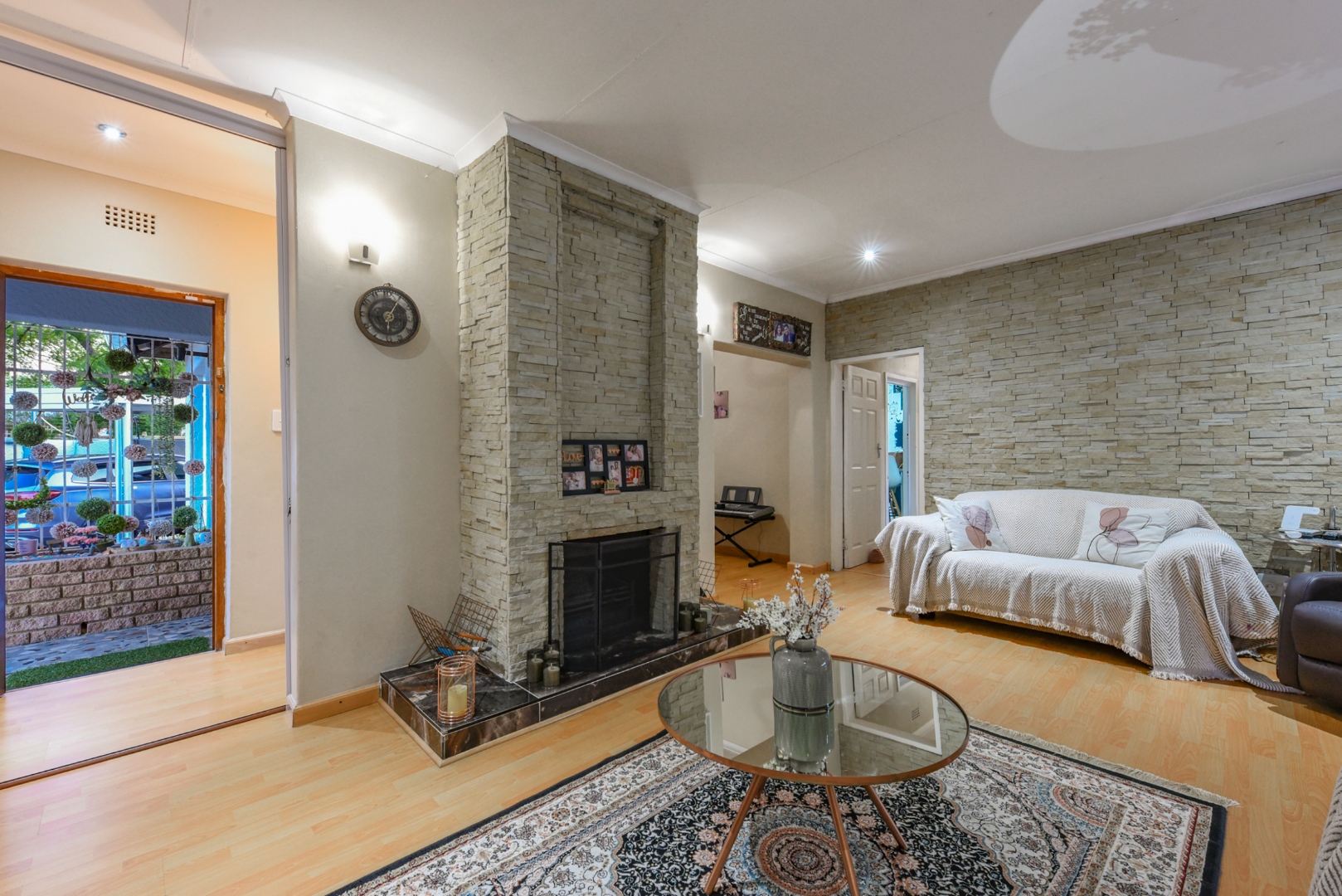 The modern house, features large glass sliding doors, presents a welcoming interior designed for comfortable living. It offers four bedrooms, two bathrooms (including an en-suite).