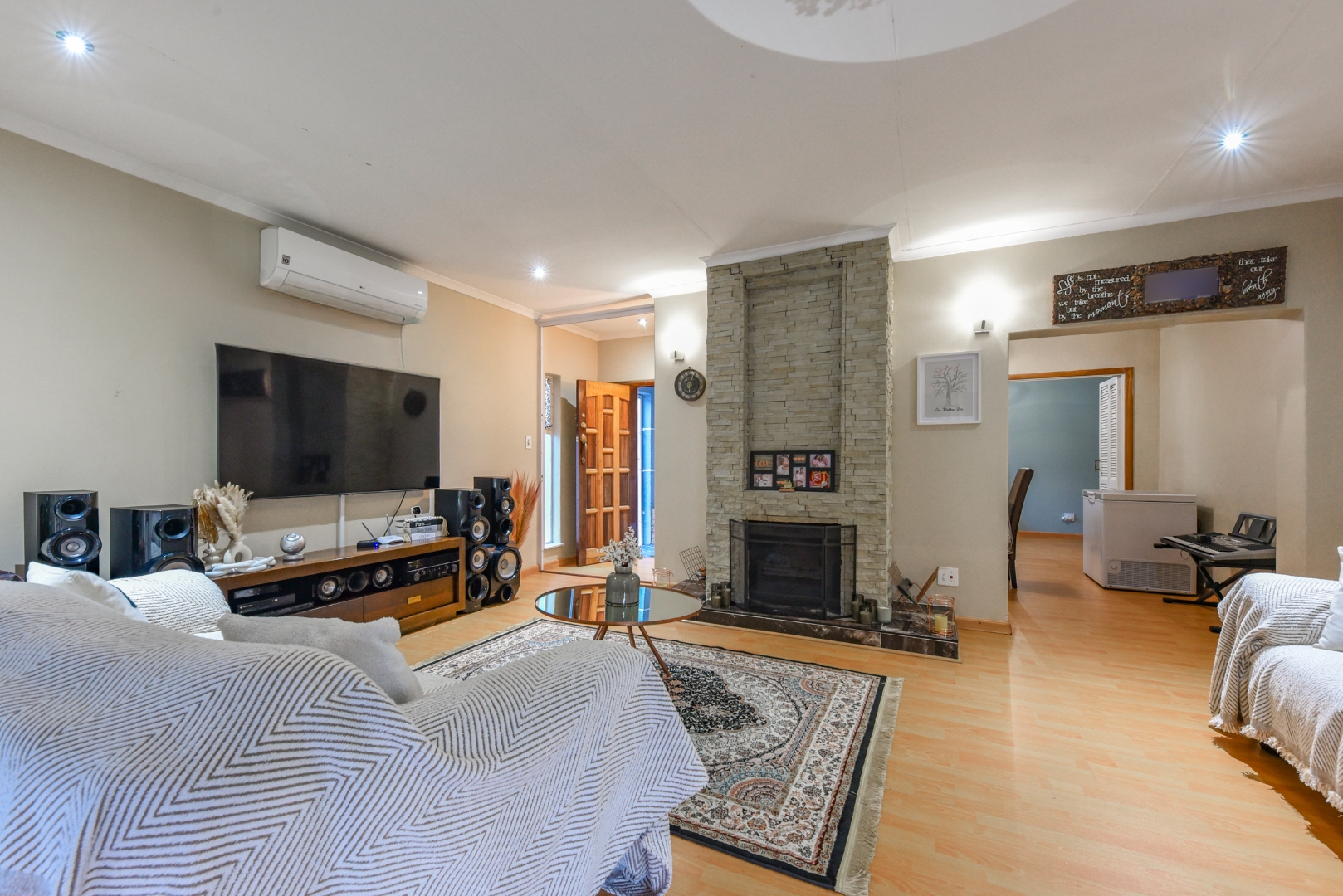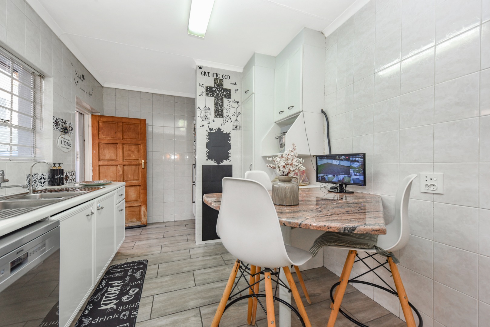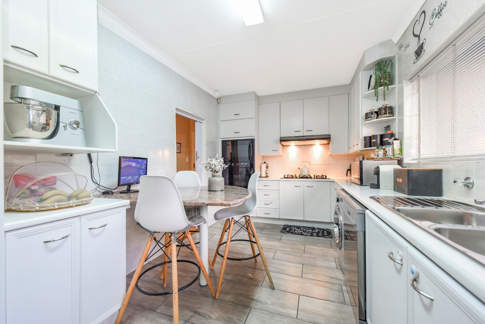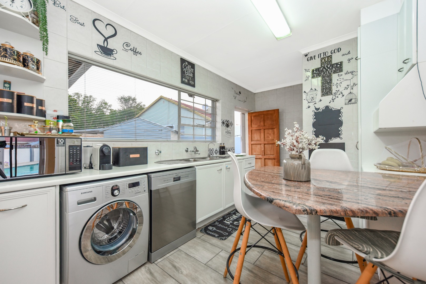 Ensuring peace of mind, this home is equipped with robust security features including an alarm system, electric fencing, burglar bars, and a security gate, further enhanced by an access gate and security post. Modern conveniences are catered for with fibre connectivity and a battery inverter, providing essential backup power.