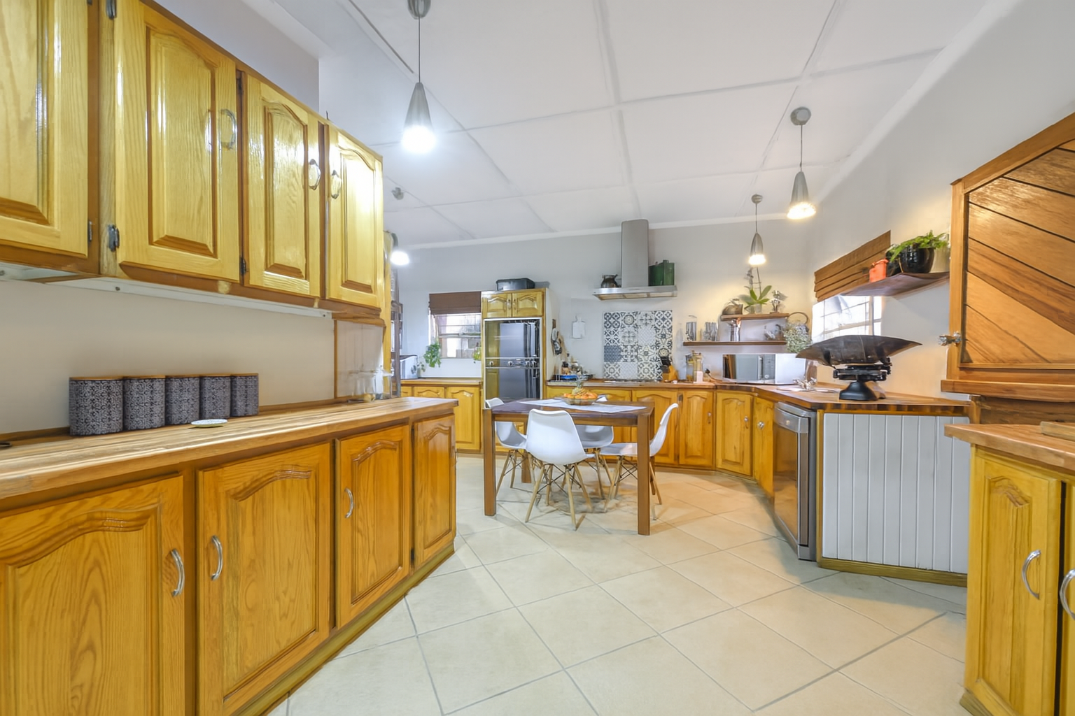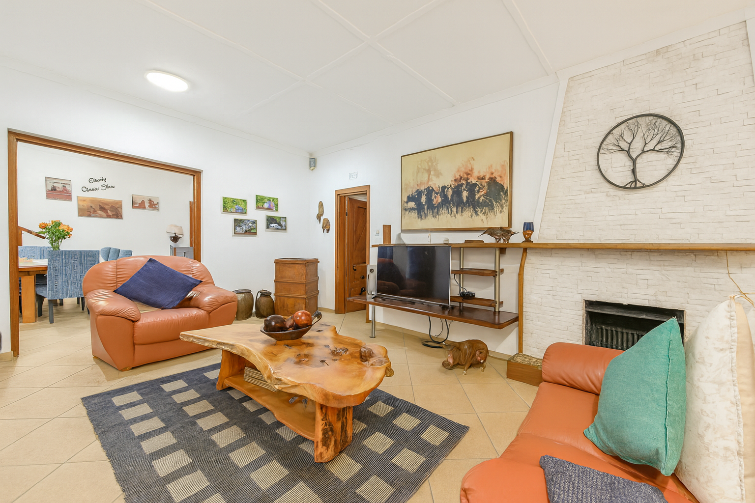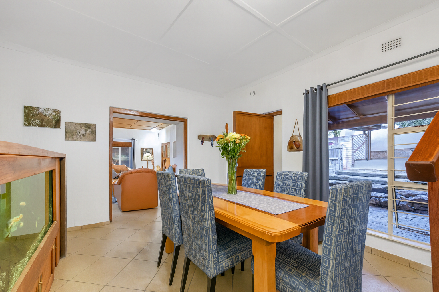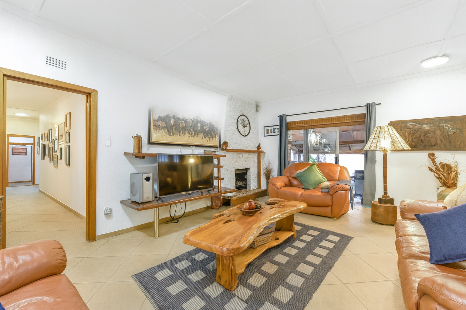 Step inside to find two generous lounges, a dedicated dining area, and a well-appointed kitchen featuring ample cupboard space and a separate pantry. The home’s tiled floors and charming fireplace in the lounge create a warm, welcoming atmosphere throughout.