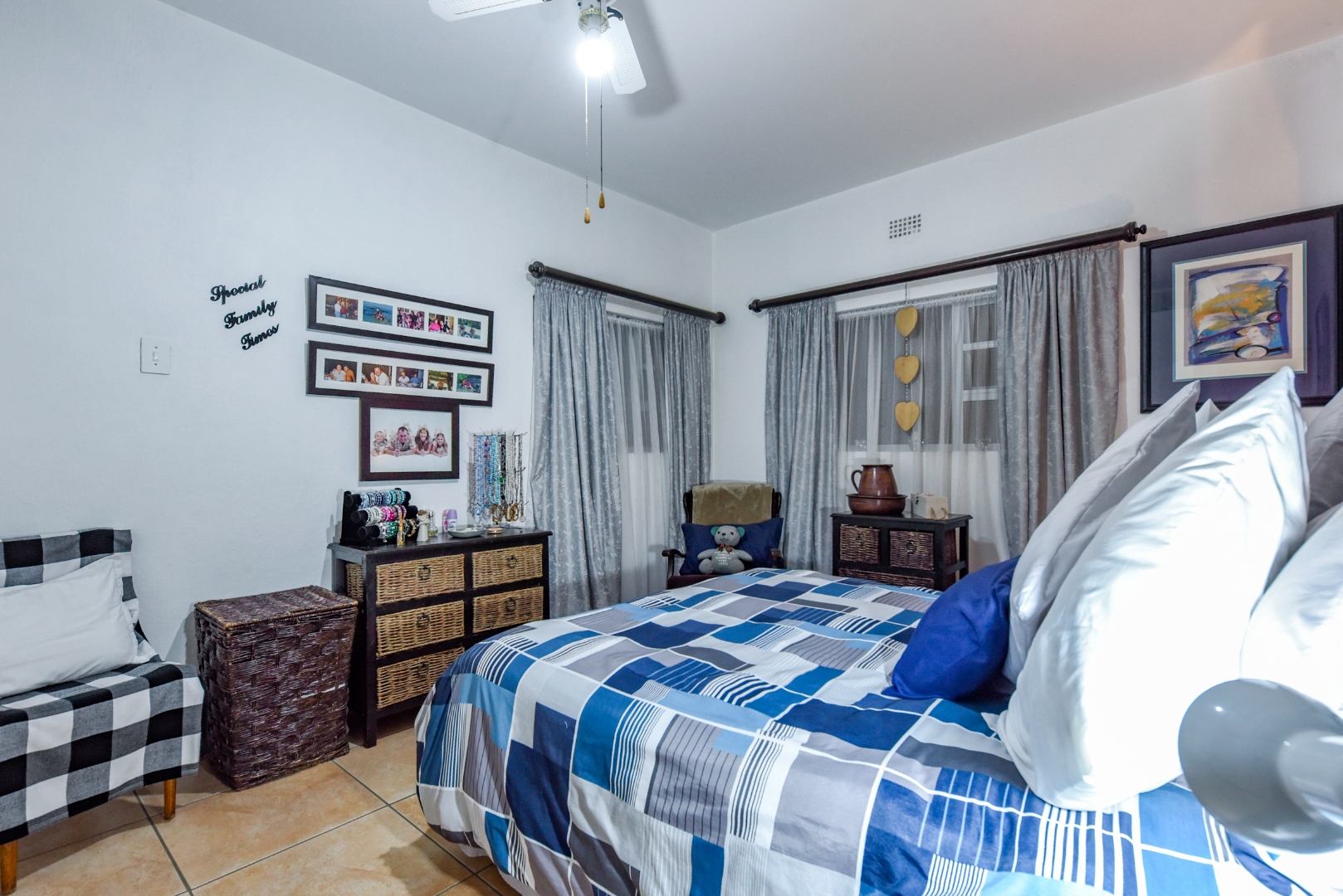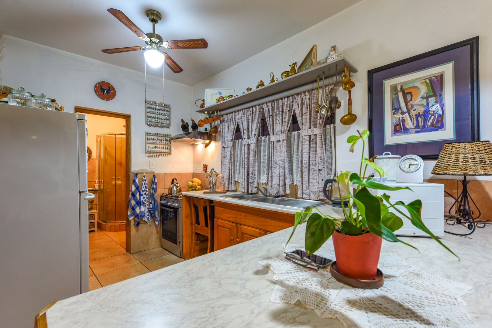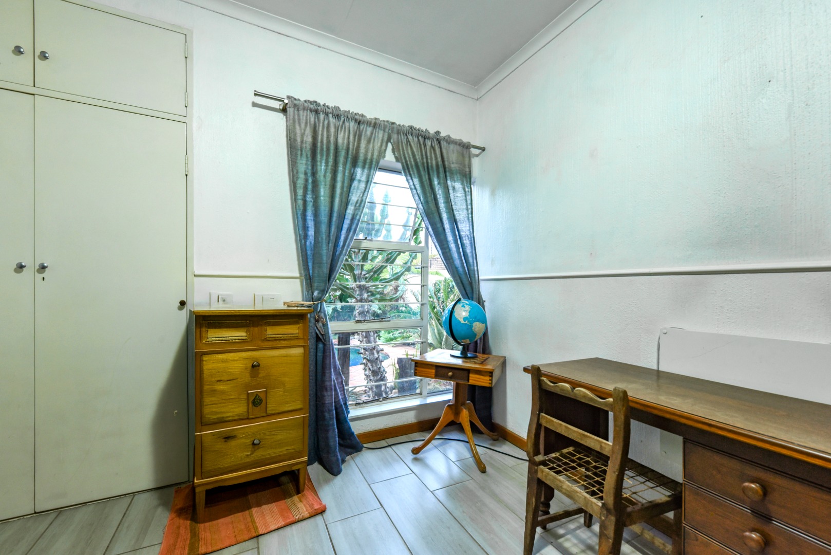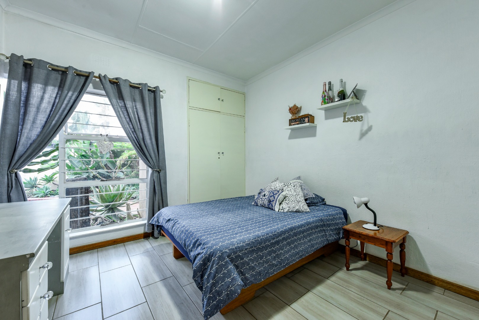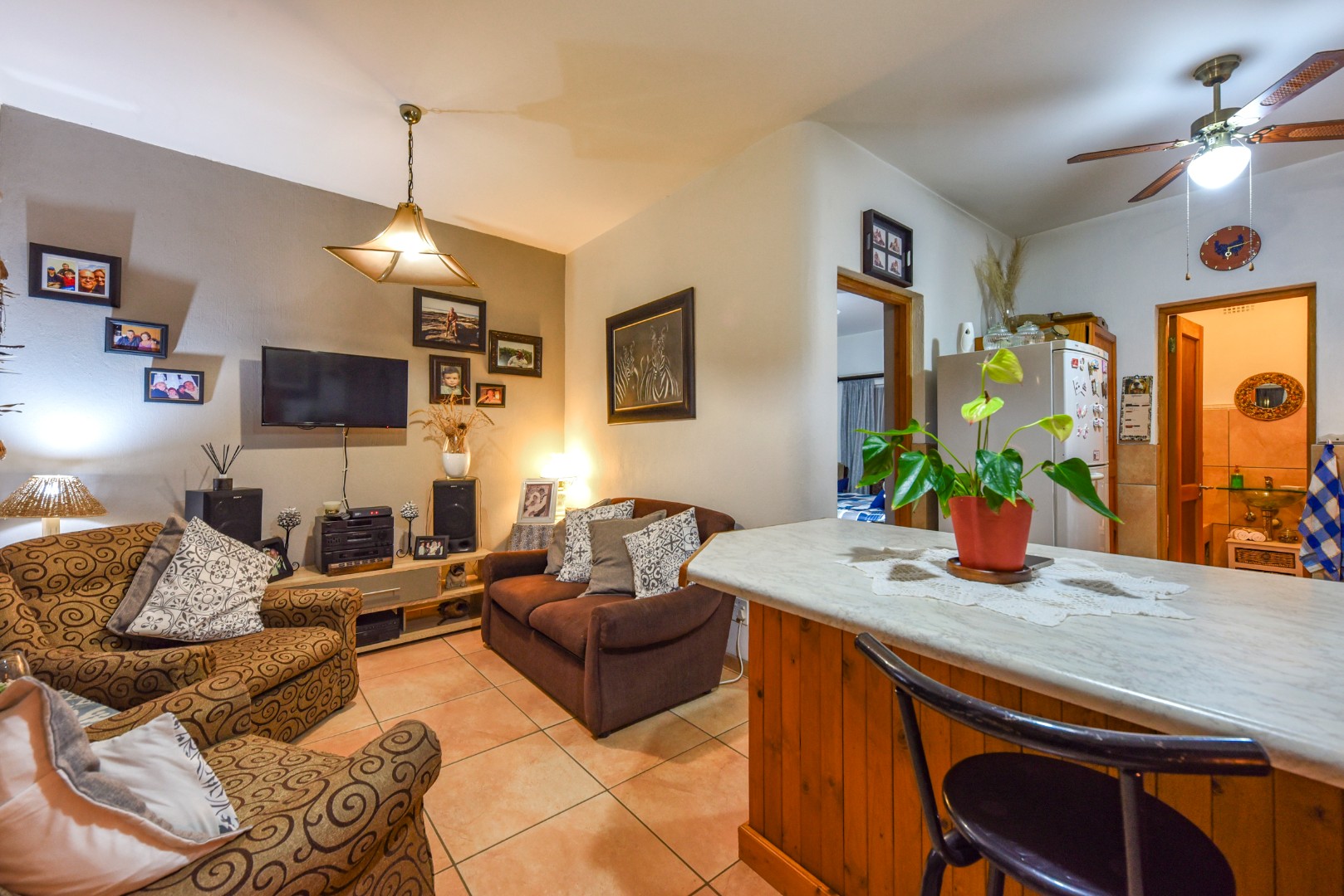 Step inside to find two generous lounges, a dedicated dining area, and a well-appointed kitchen featuring ample cupboard space and a separate pantry. The home’s tiled floors and charming fireplace in the lounge create a warm, welcoming atmosphere throughout.
