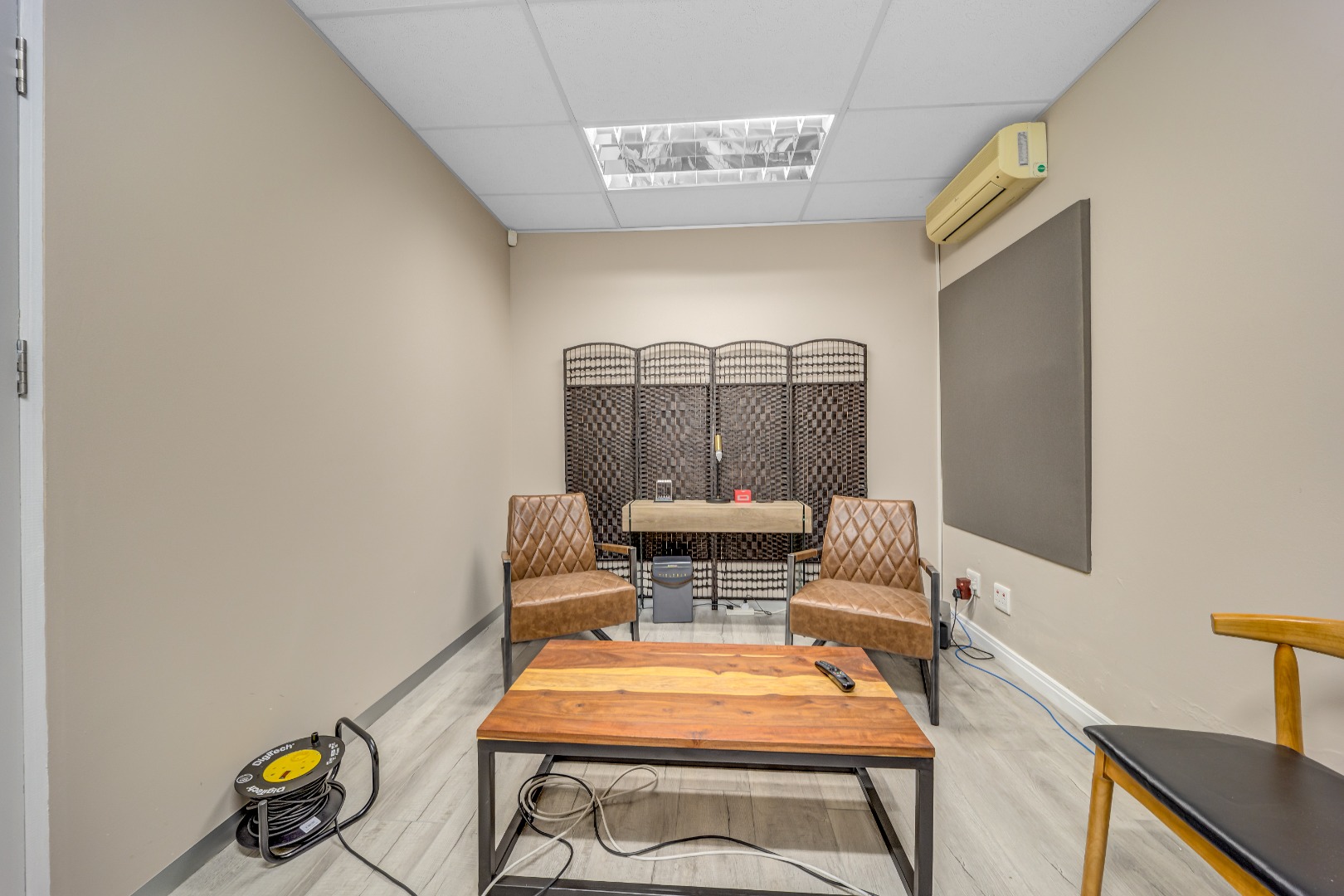 - Soundproof Studio – Professionally designed, acoustically treated space for podcasting, recording, video production, or private calls. Includes sliding door access to an outdoor patio.
