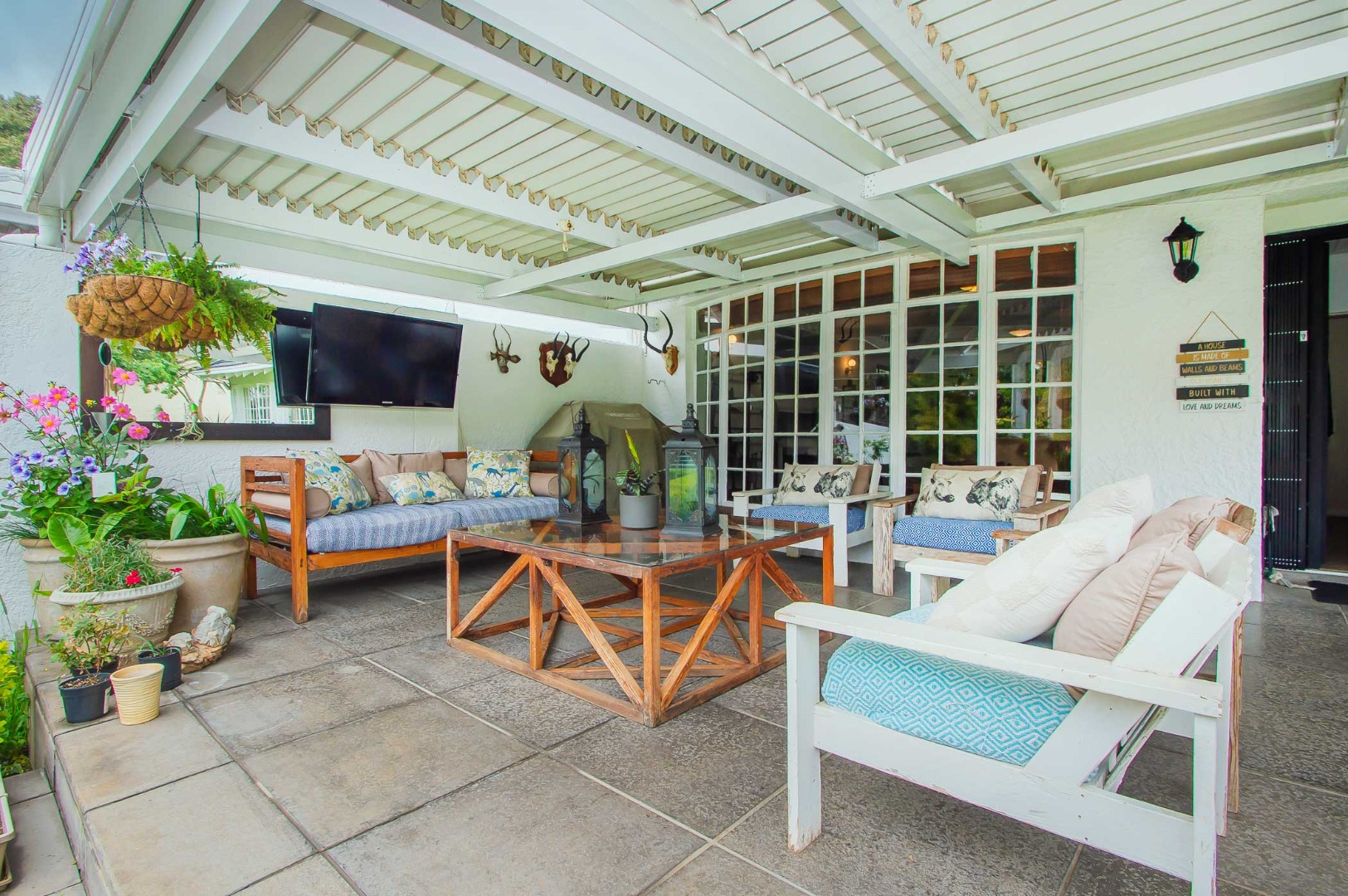 • Covered patio with an open close awning overlooking landscaped lush green garden that has a borehole