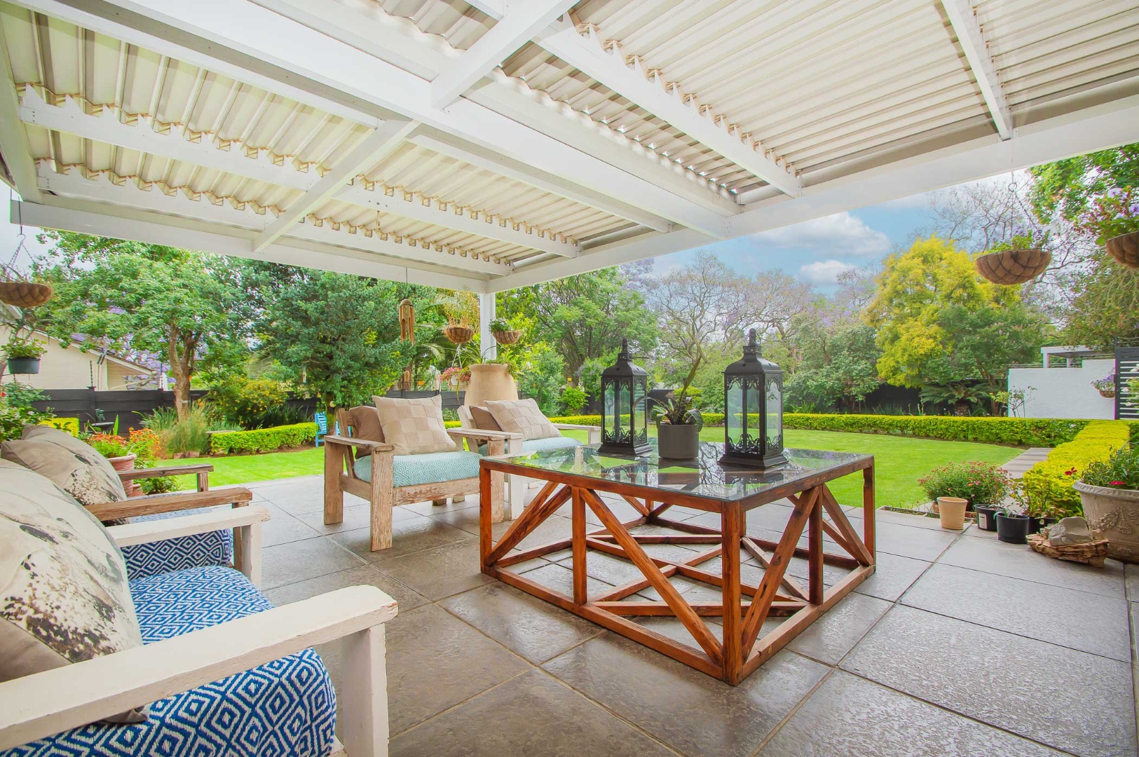 • Covered patio with an open close awning overlooking landscaped lush green garden that has a borehole