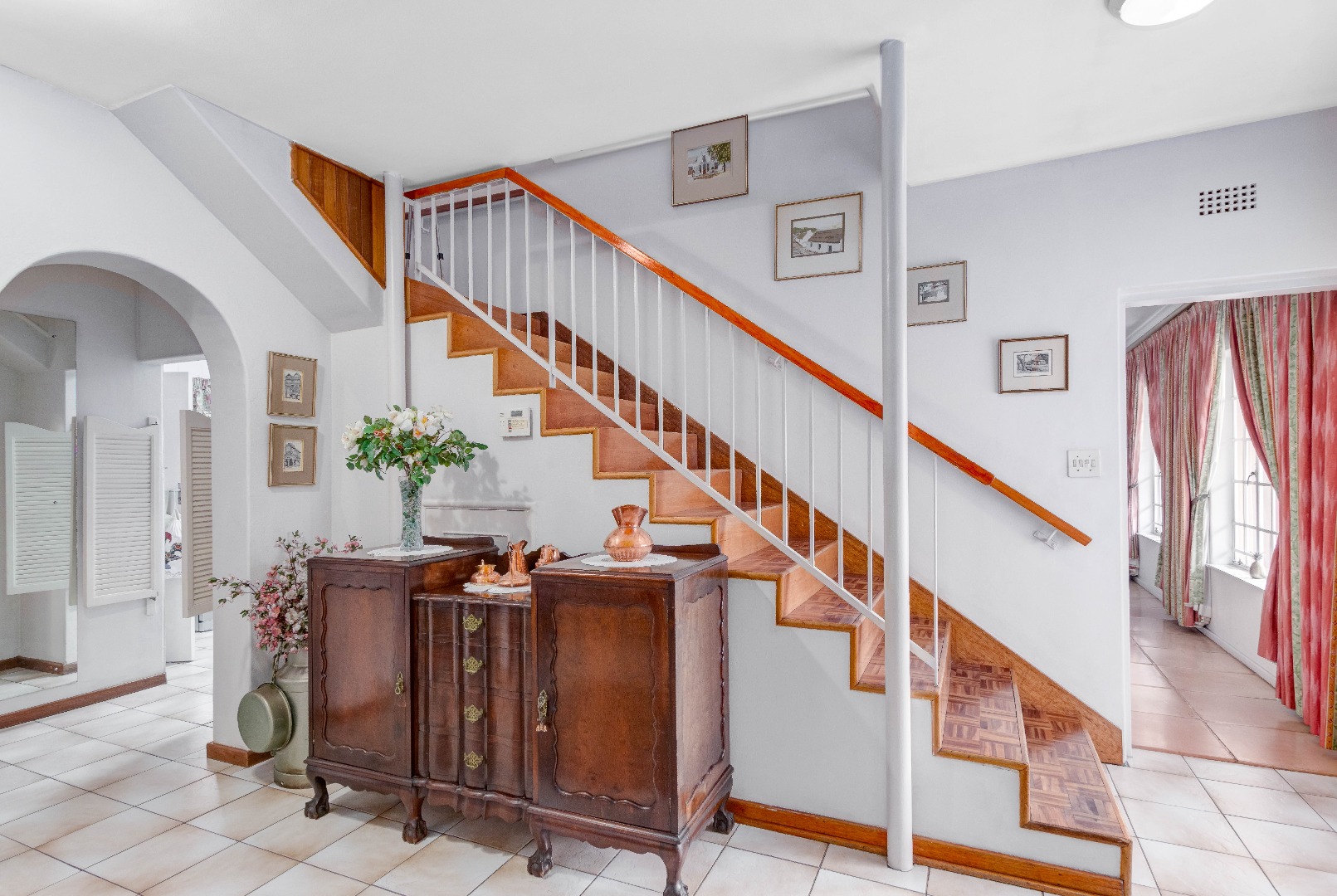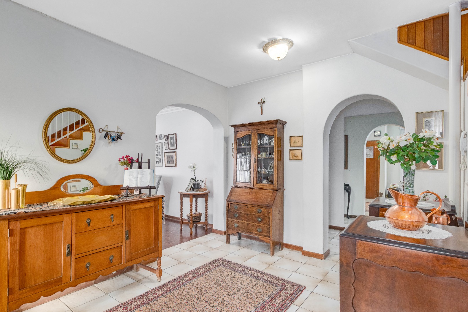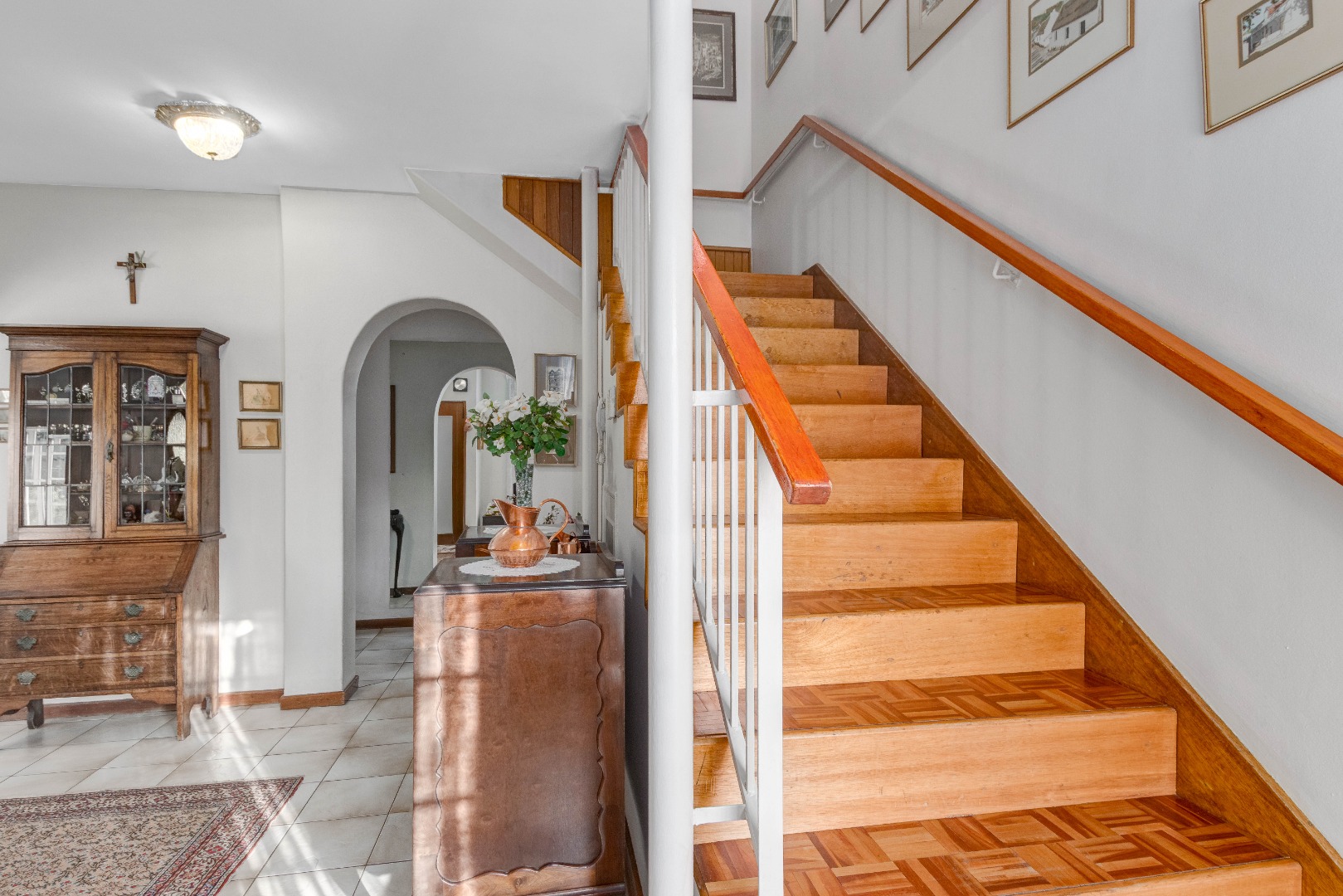 The grand arched entrance hints at the classic design and sturdy build of a house that has stood the test of time. Built for memories, built for life. Inside, warm parquet flooring flows throughout the home, complementing the solid finishes and timeless elegance.