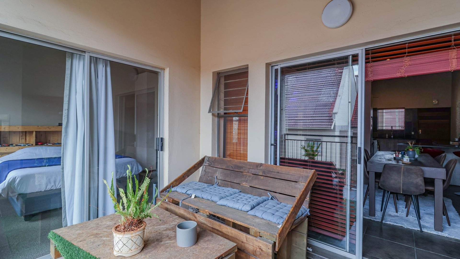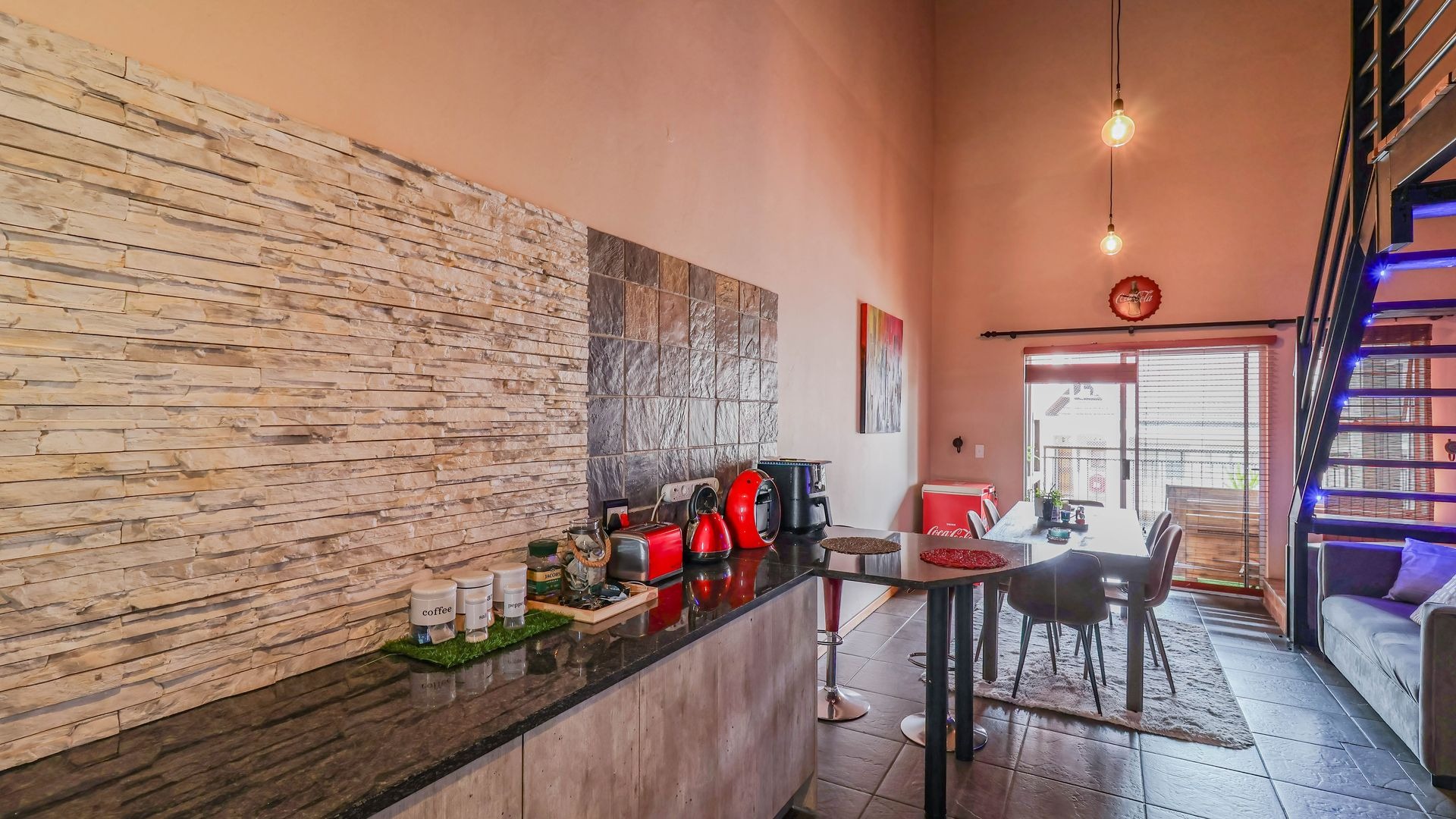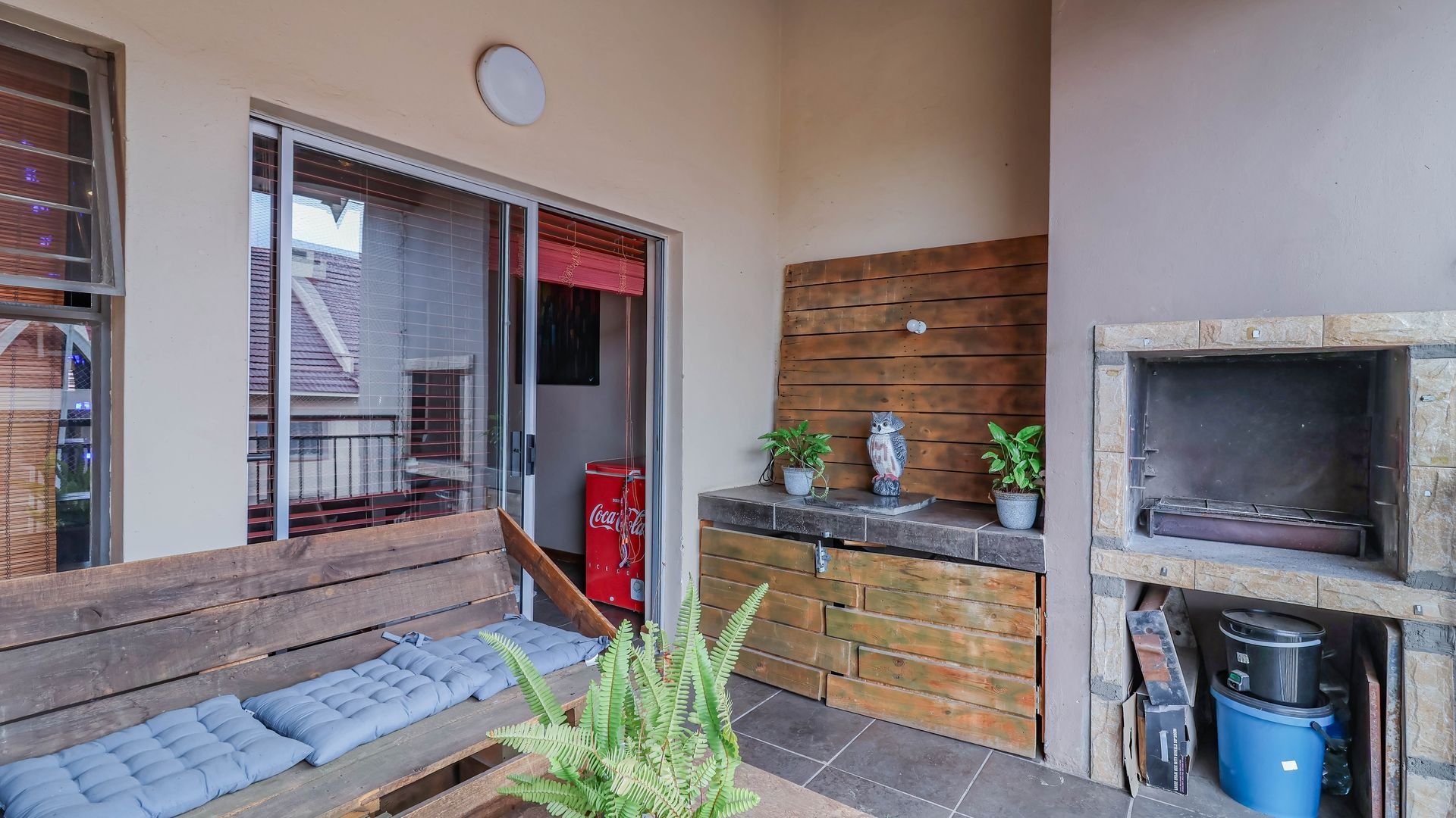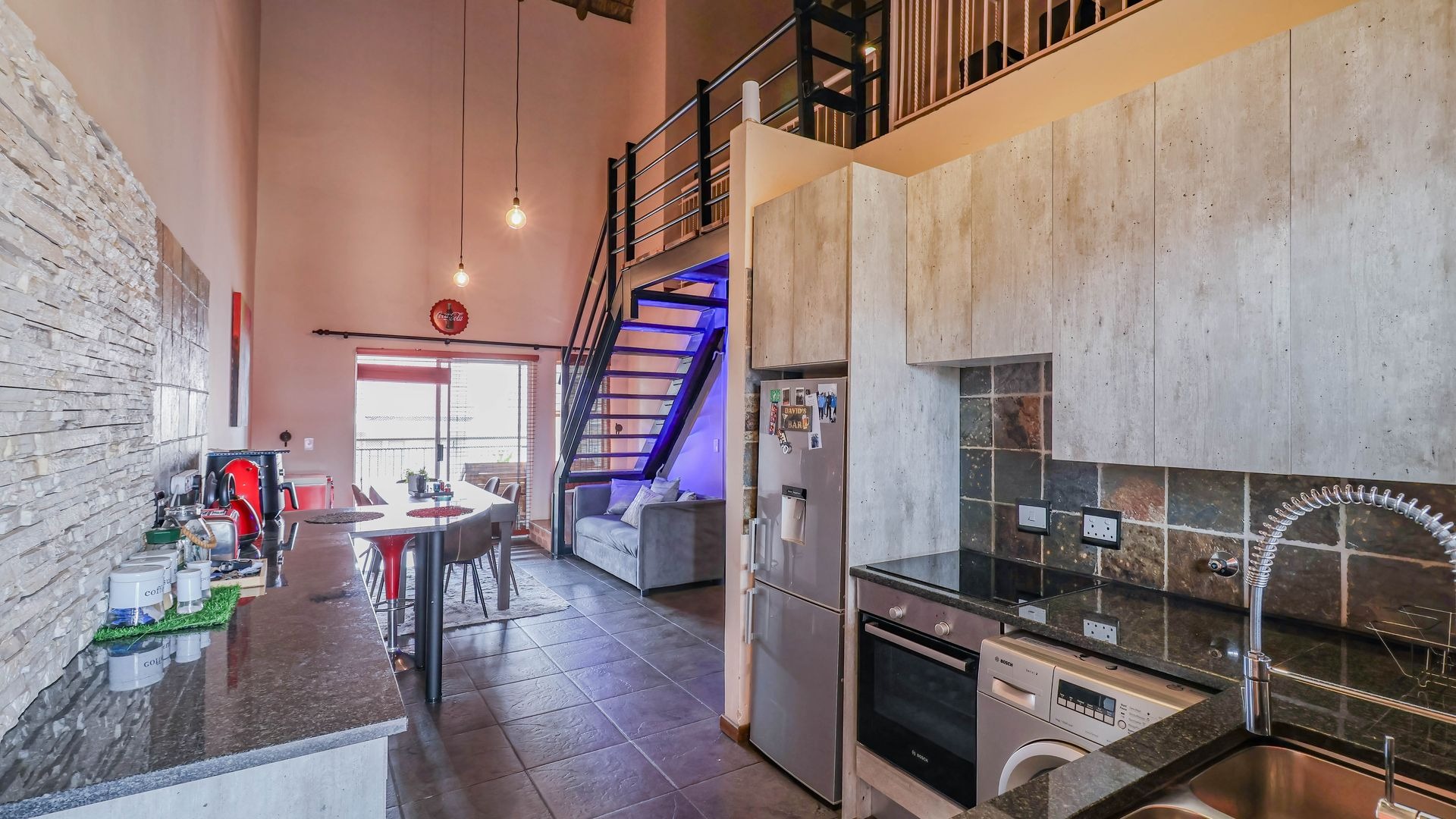 Enter through the front door/security gate into beautiful kitchen with granite tops, undercover oven, glass hob,(Bosch), space for 1 appliance, double sink, lovely breakfast bar, lots of cupboards with soft close. New plumbing, geyser 3mths old. Double volume with ambient lights, lounge/dining room with a slider to the tiled, enclosed patio with built-in braai. Birdnetting to prevent nesting. Patio set to stay. Main Bedroom, carpeted (3 BIC) slider to same patio, MES Loo, basin and walk-in shower, 2nd bedroom carpeted (2 BIC), 2nd bathroom, loo, basin and bath, vanity. Bookshelf/display stand to stay. Go upstairs to the loft room. Use as lounge/entertainment room or use as 3rd bedroom. 2 basement covered parking bays. Blinds throughout except main. Not Pet friendly. 24 hr Guard, Pool in complex. Potential rental income R8500/R9000pm.