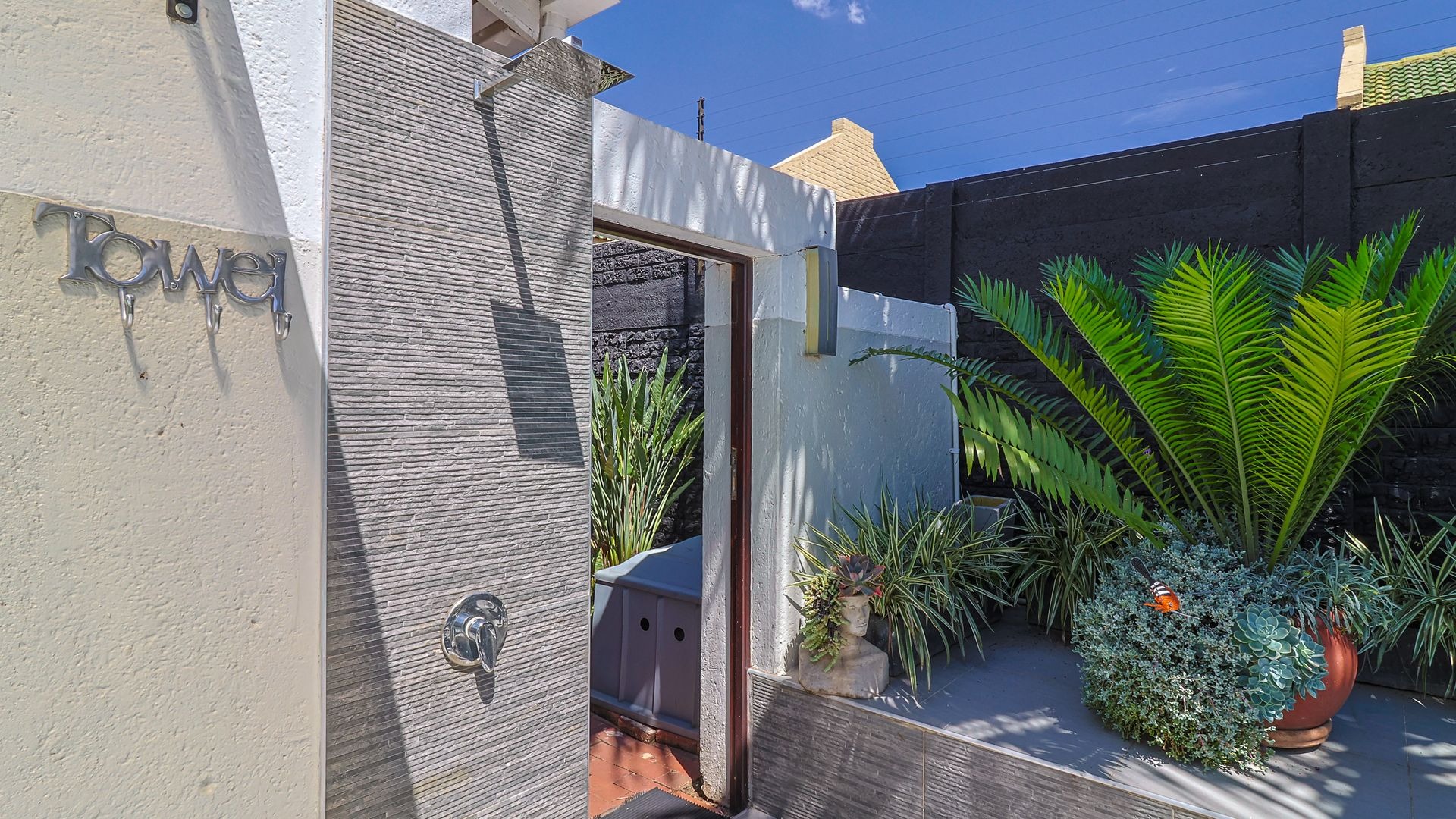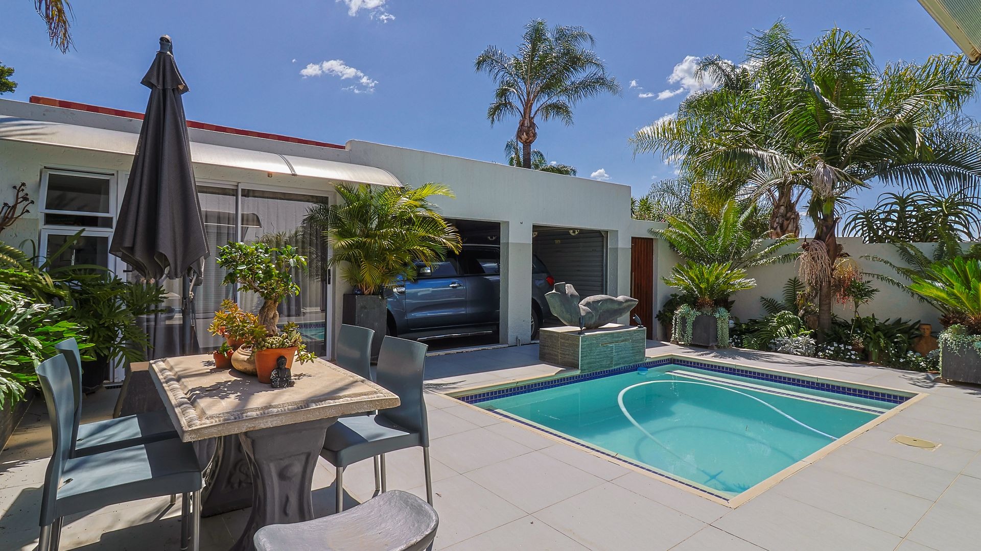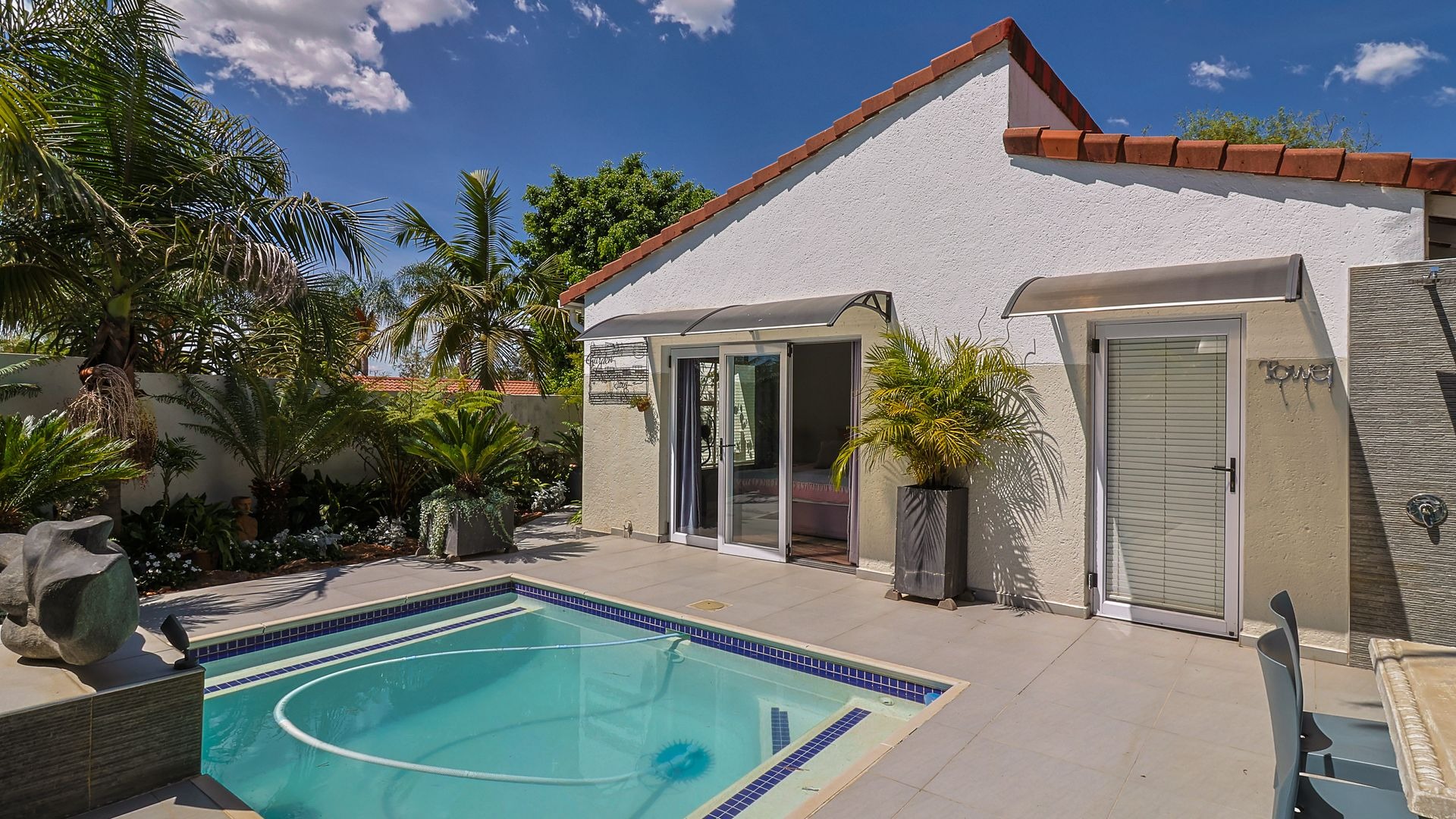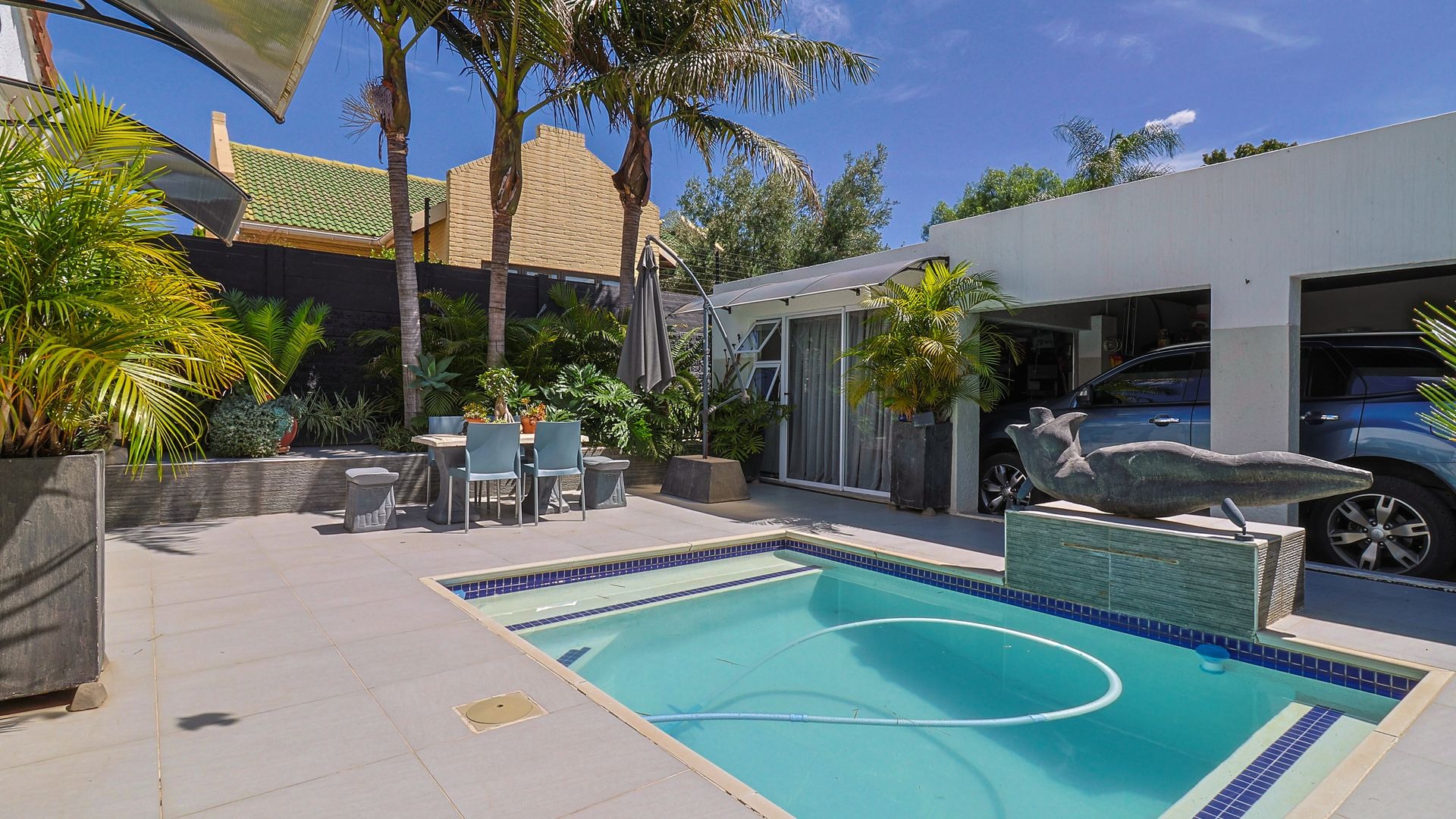 A double automated garage offers secure parking, while the solar-heated swimming pool and outdoor shower with both hot and cold water provide the ultimate in relaxation and entertainment.
