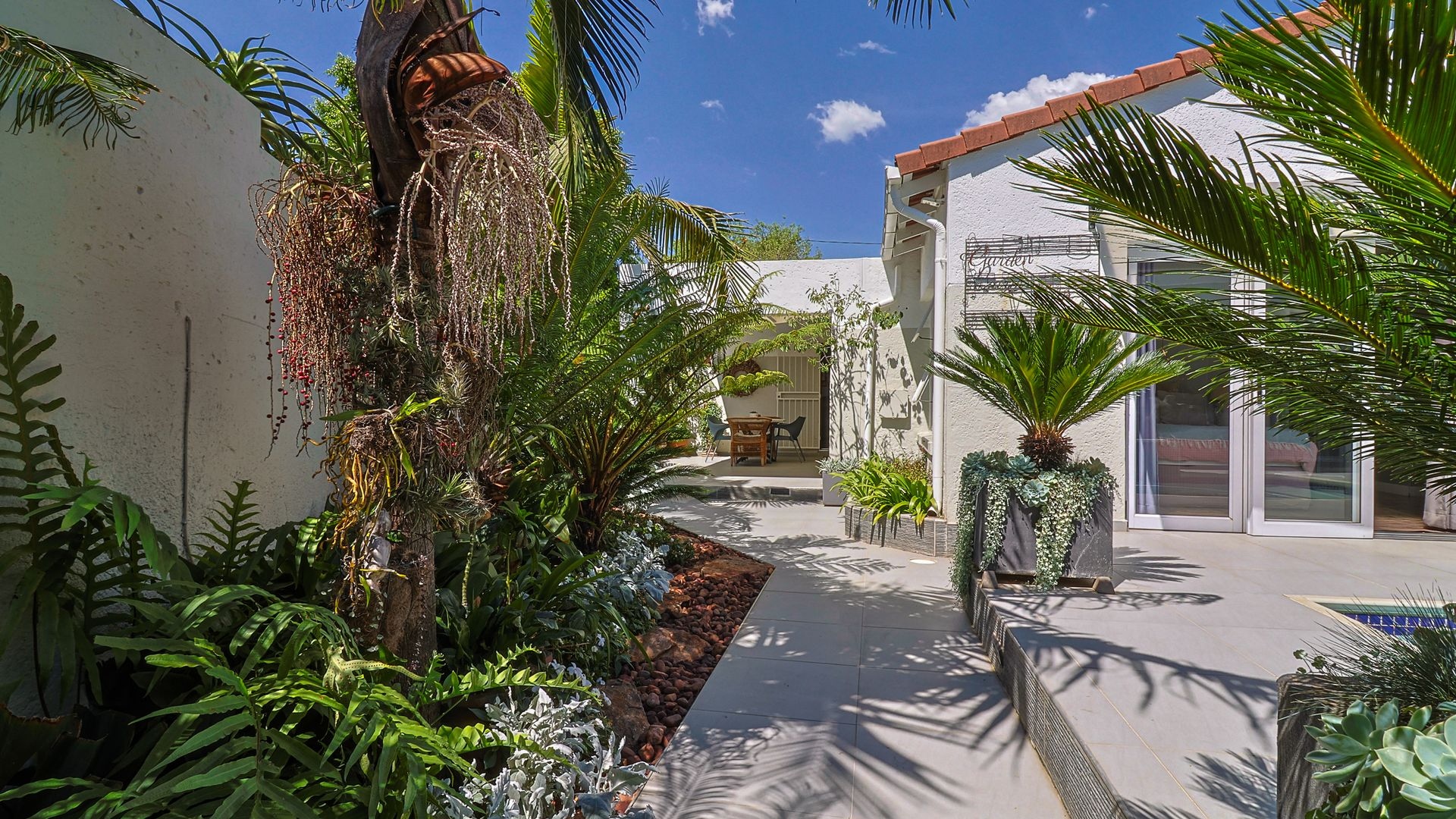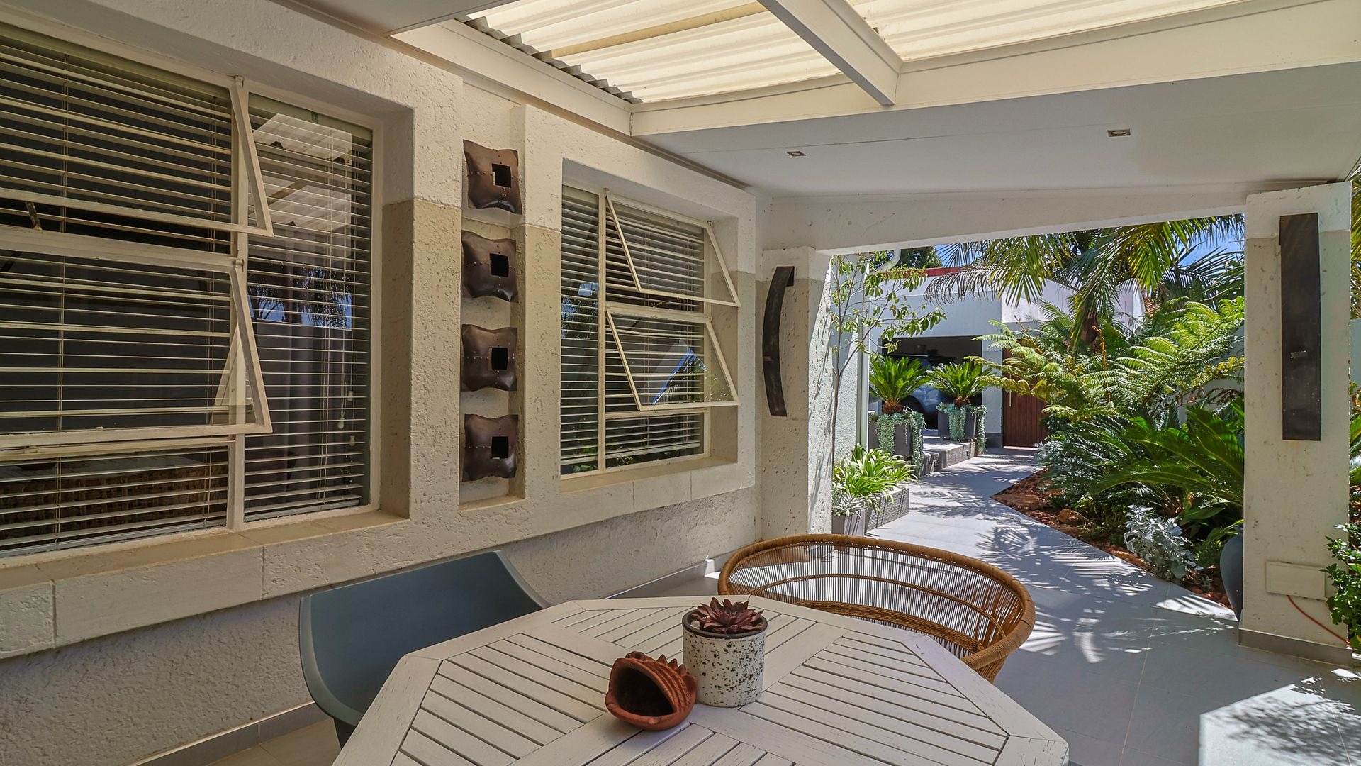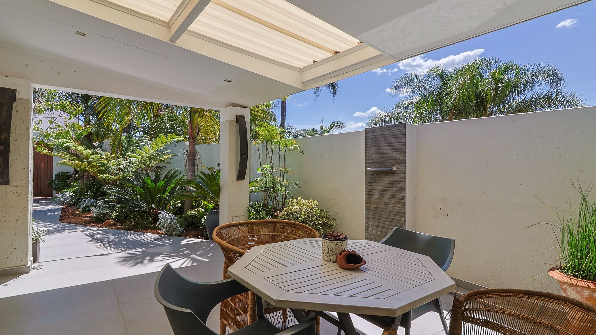 The home features a stunningly landscaped garden, designed for peaceful outdoor living, complete with an undercover patio and a soothing water feature. Inside, you'll find three generously sized bedrooms, including a luxurious main suite with stackable sliding doors leading to the garden, a walk-in closet, and a private en-suite bathroom. The two additional bedrooms share a stylish family bathroom.