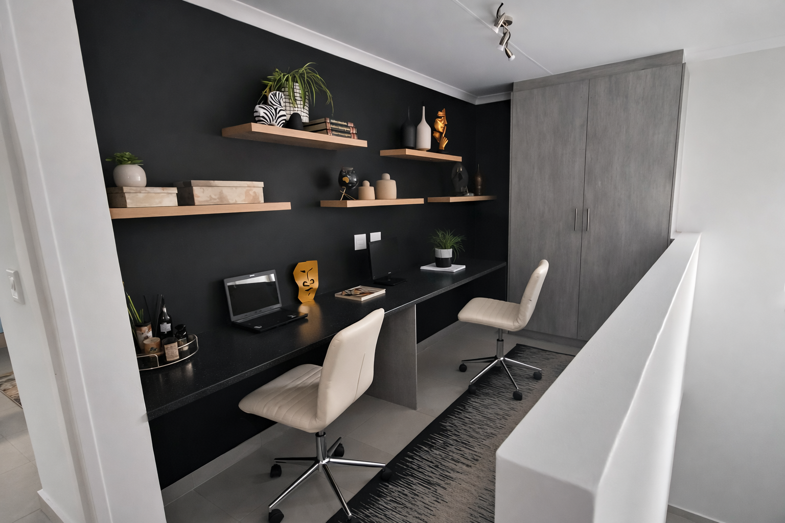 Upstairs you will also find a dedicated contemporary workspace with floating shelves and built-in cabinetry provides the perfect work-from-home solution, adding to the home’s versatile appeal.