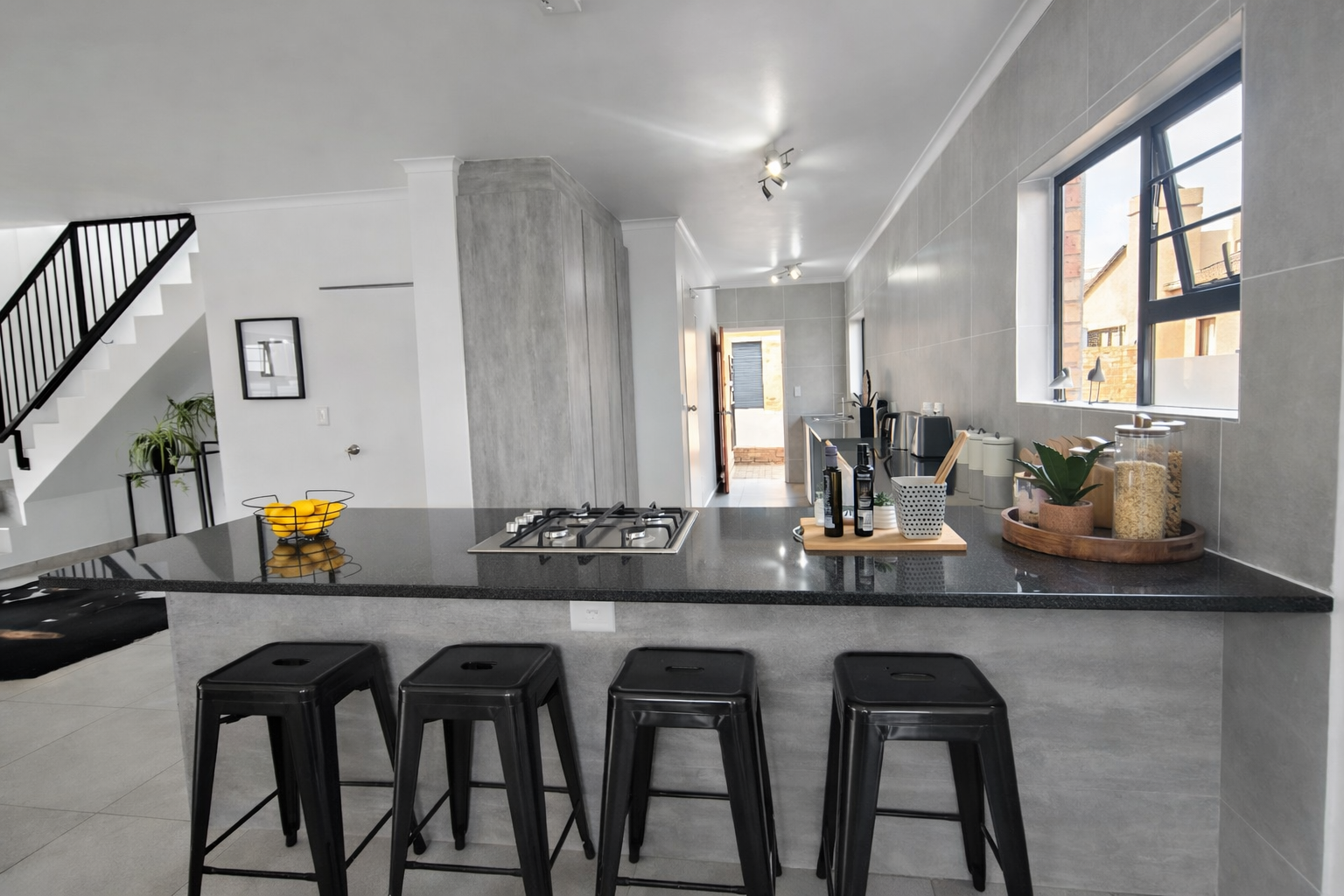 Step inside to an expansive open-plan living area where contemporary design meets effortless functionality. The heart of the home is the modern kitchen, featuring a stylish island with an integrated gas hob and seating — perfect for cooking and entertaining. With dark granite countertops, extensive tiled walls, generous cupboard space, room for three under-counter appliances, and a double-door fridge, this kitchen truly delivers. The garage interleads directly into the home for added convenience.