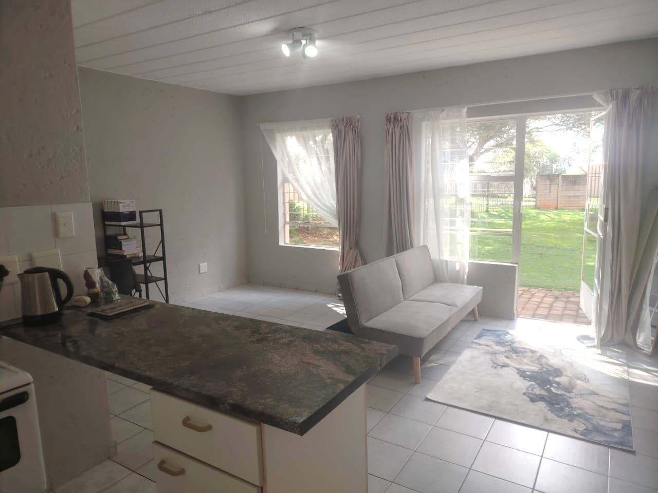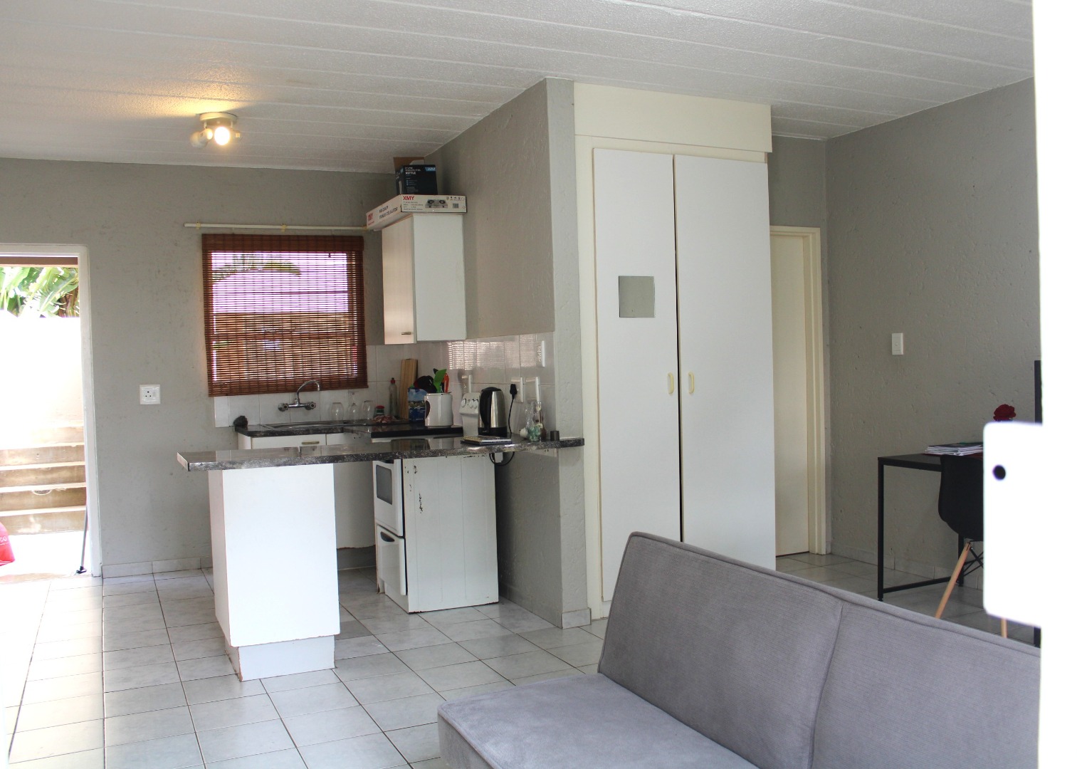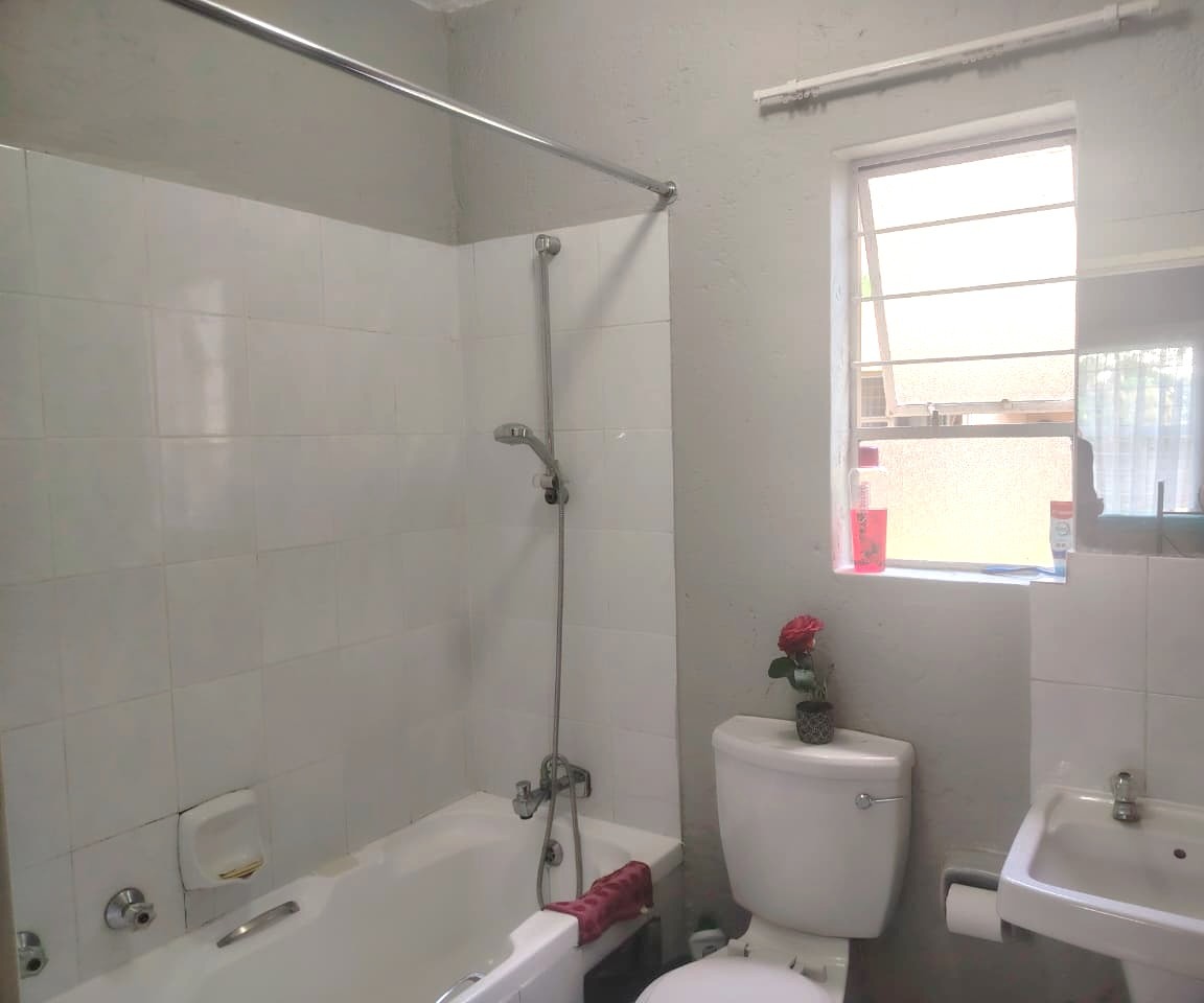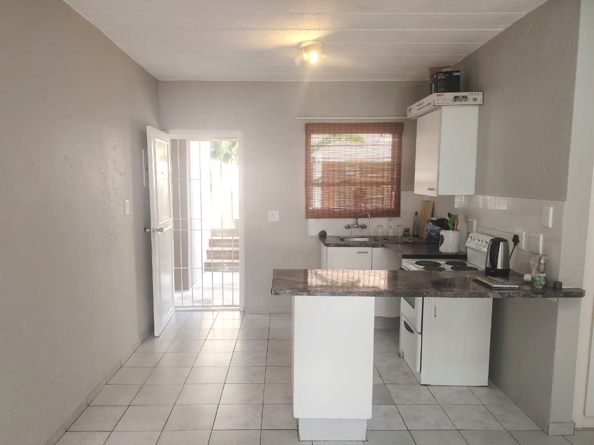 The unit features an inviting open-plan layout, fully tiled throughout for easy maintenance. The kitchen area includes a practical breakfast counter, while the bathroom is fitted with a stand-up shower handle in the bath, complete with a curtain rail pole to ensure functionality. The lounge and bedroom area is generously sized, benefiting from abundant natural light. For added security, the unit boasts 2 security gates on entrance doors and burglar bars.