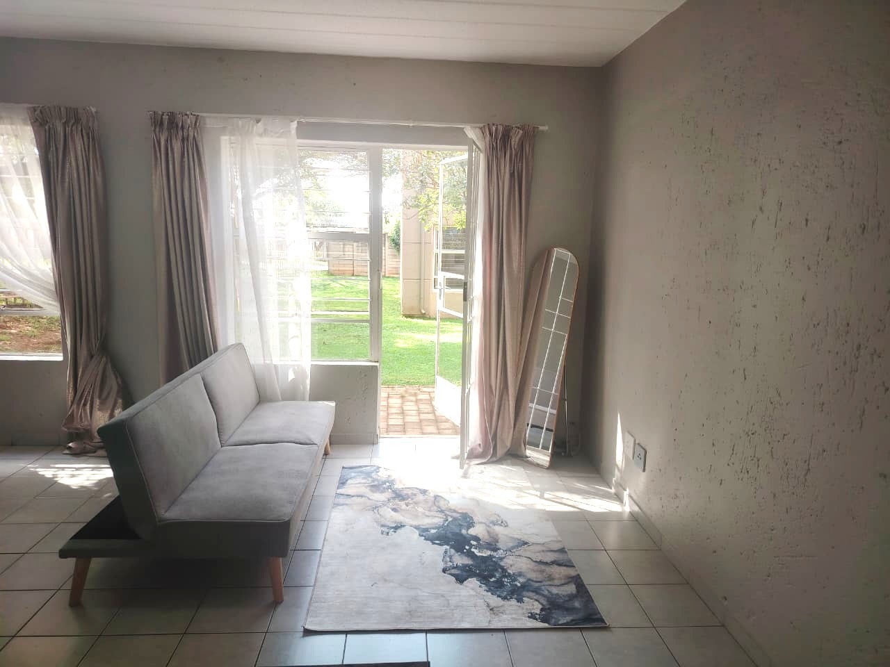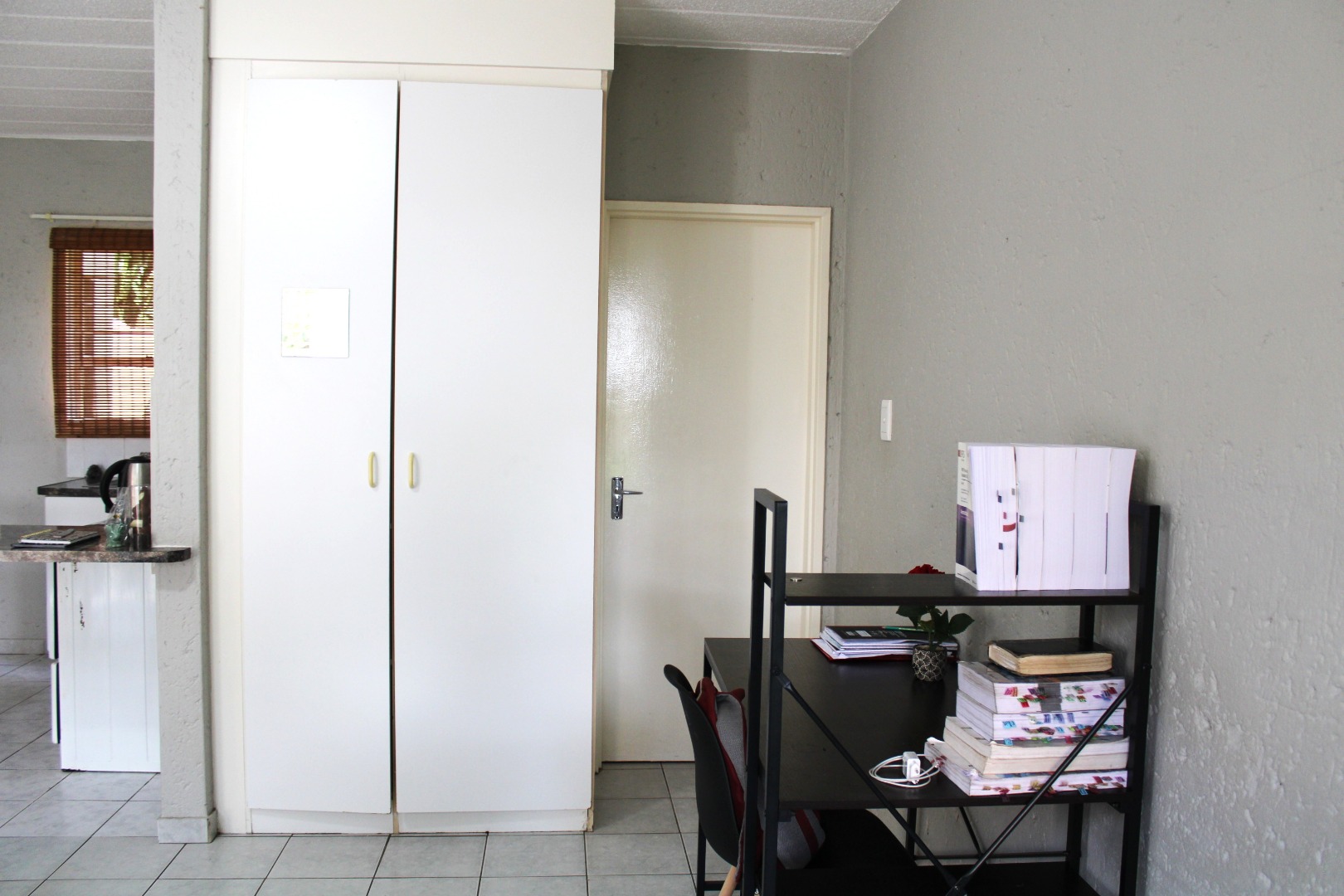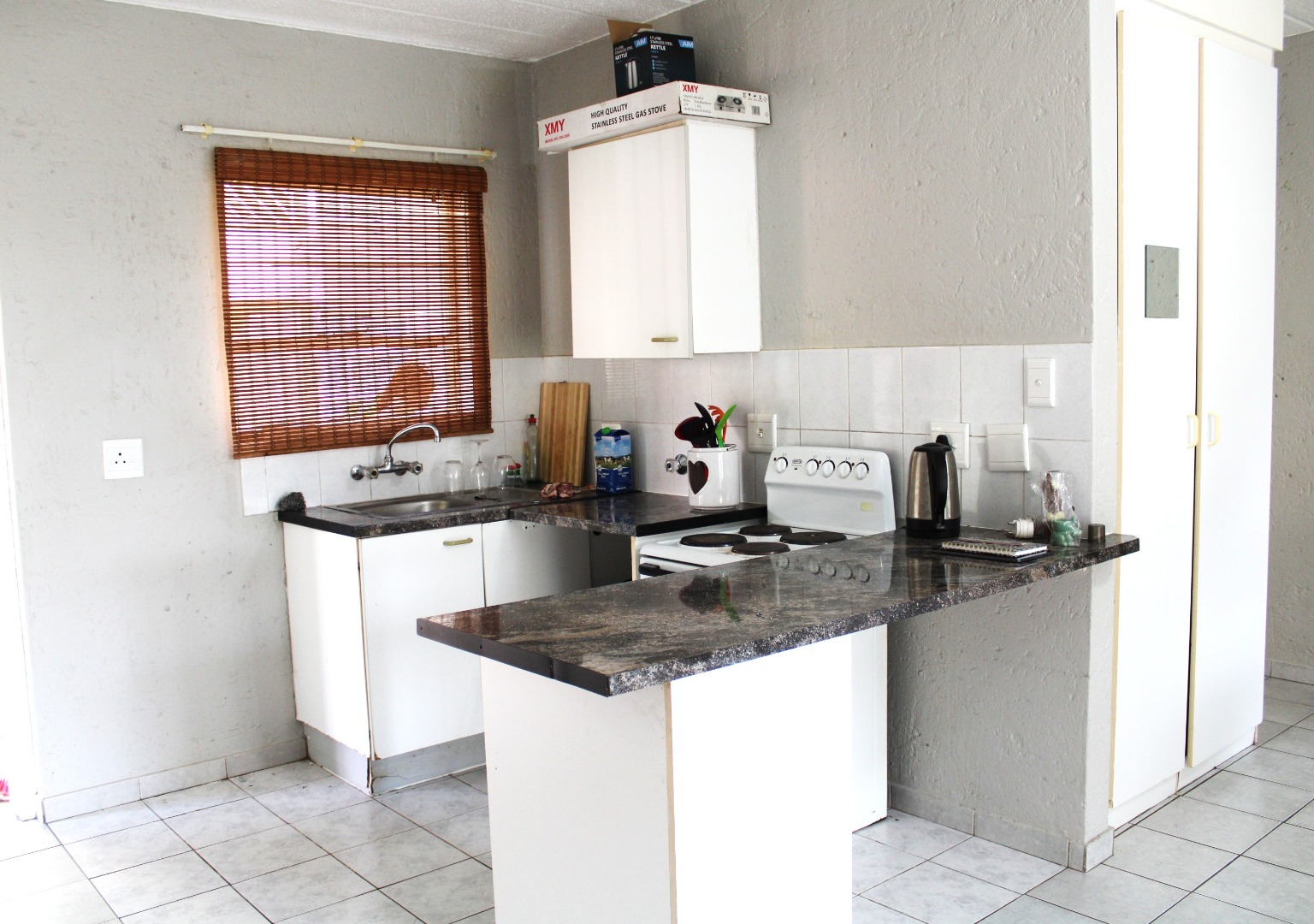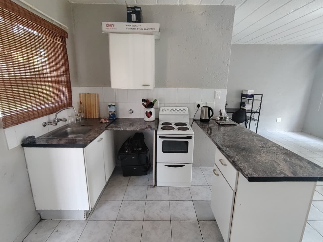 The unit features an inviting open-plan layout, fully tiled throughout for easy maintenance. The kitchen area includes a practical breakfast counter, while the bathroom is fitted with a stand-up shower handle in the bath, complete with a curtain rail pole to ensure functionality. The lounge and bedroom area is generously sized, benefiting from abundant natural light. For added security, the unit boasts 2 security gates on entrance doors and burglar bars.