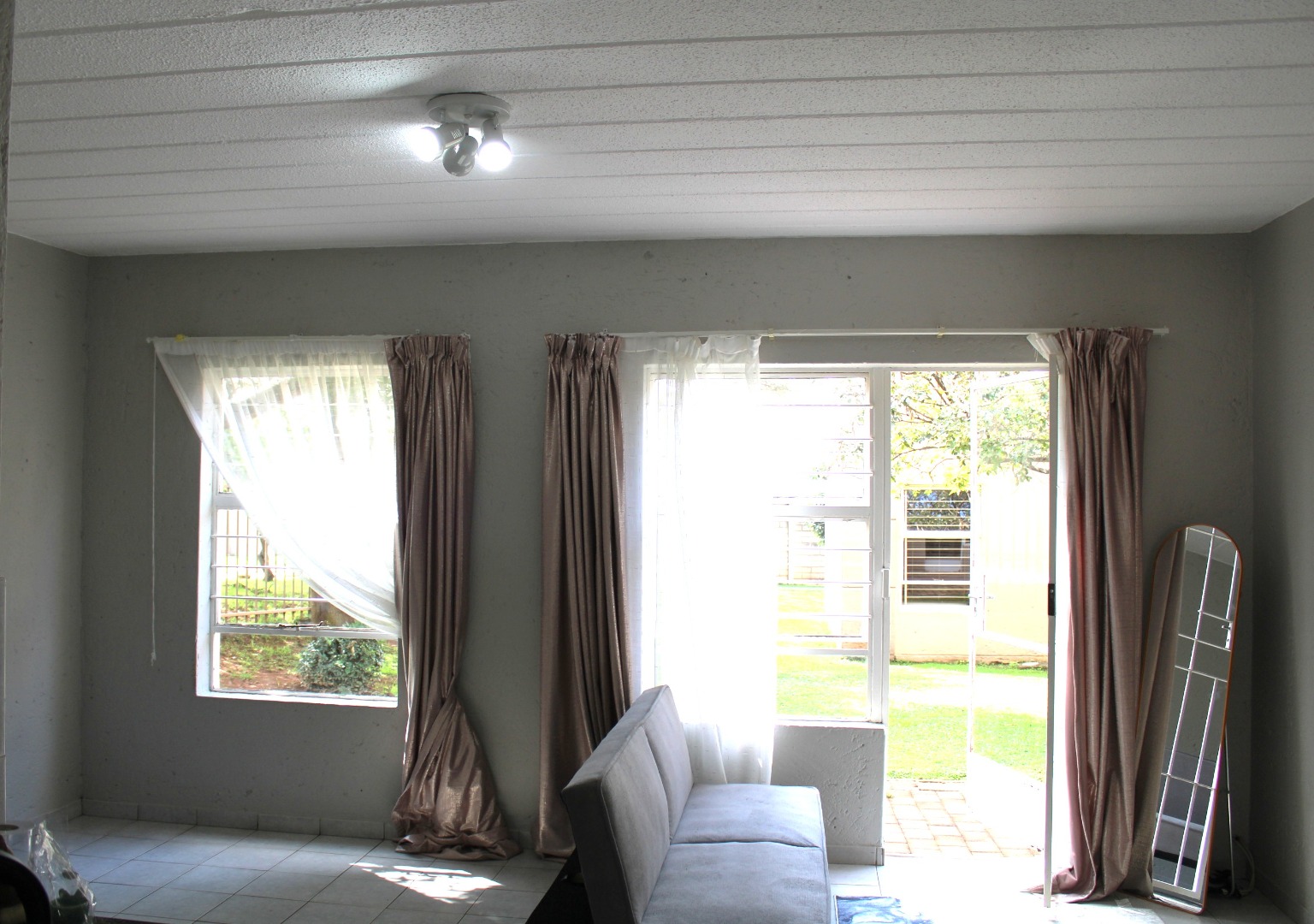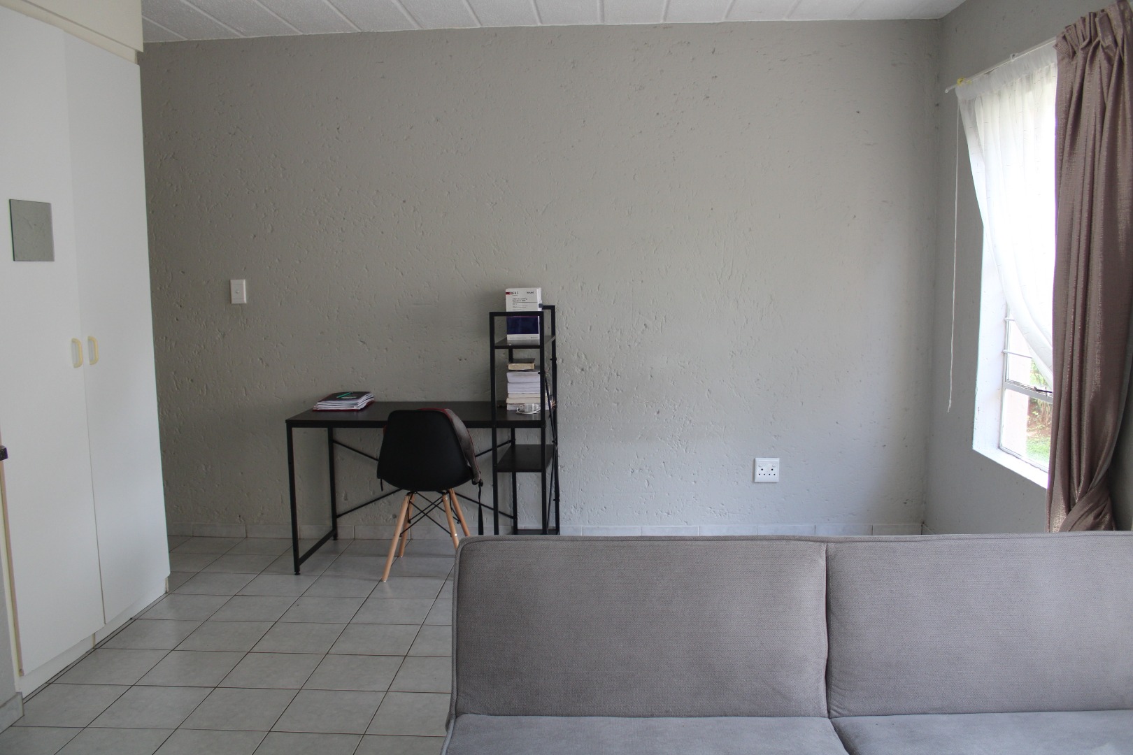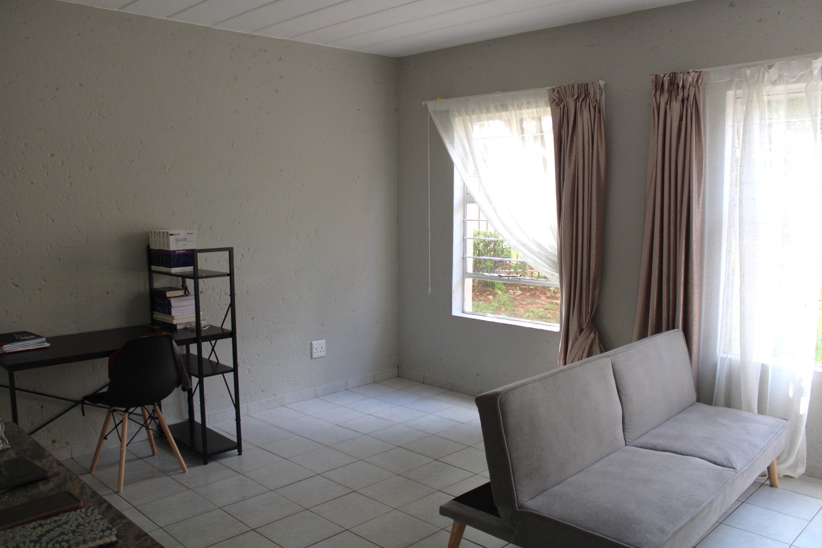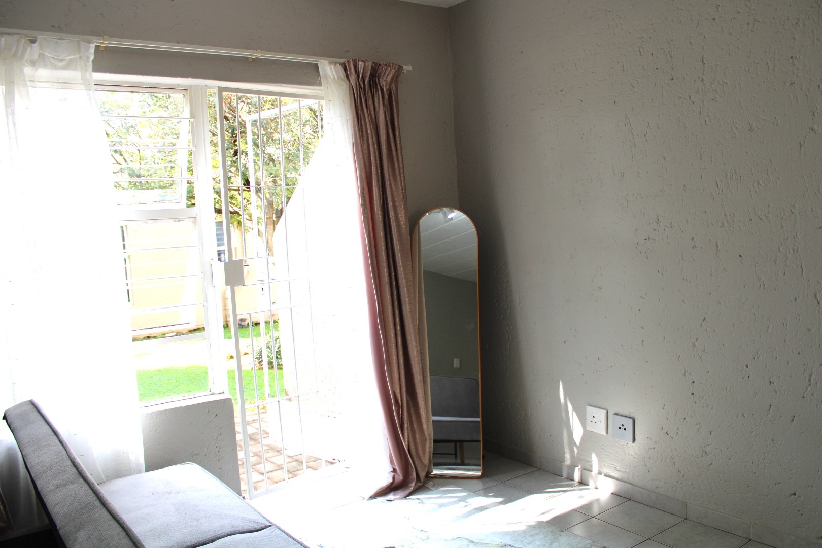 The unit features an inviting open-plan layout, fully tiled throughout for easy maintenance. The kitchen area includes a practical breakfast counter, while the bathroom is fitted with a stand-up shower handle in the bath, complete with a curtain rail pole to ensure functionality. The lounge and bedroom area is generously sized, benefiting from abundant natural light. For added security, the unit boasts 2 security gates on entrance doors and burglar bars.