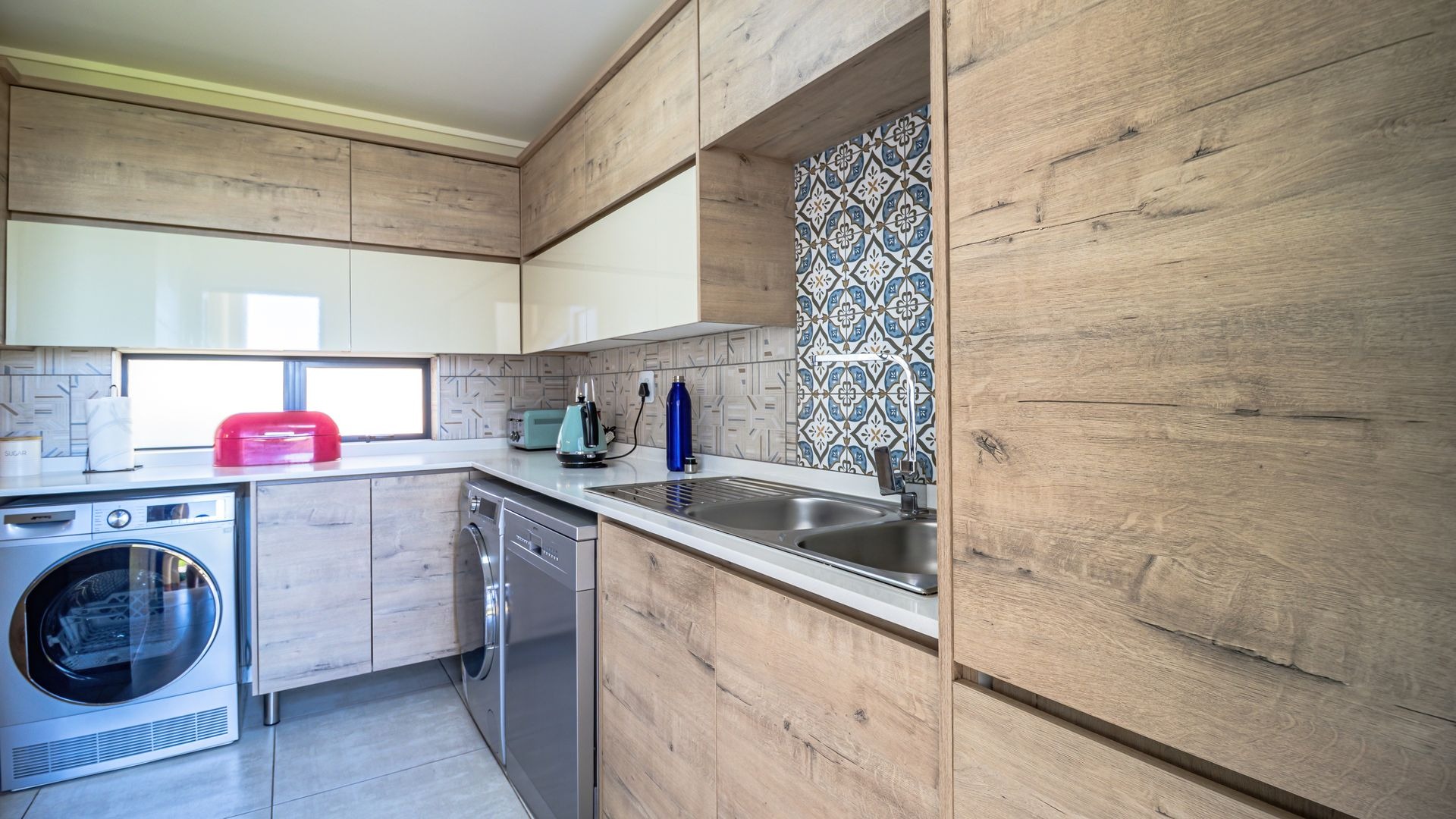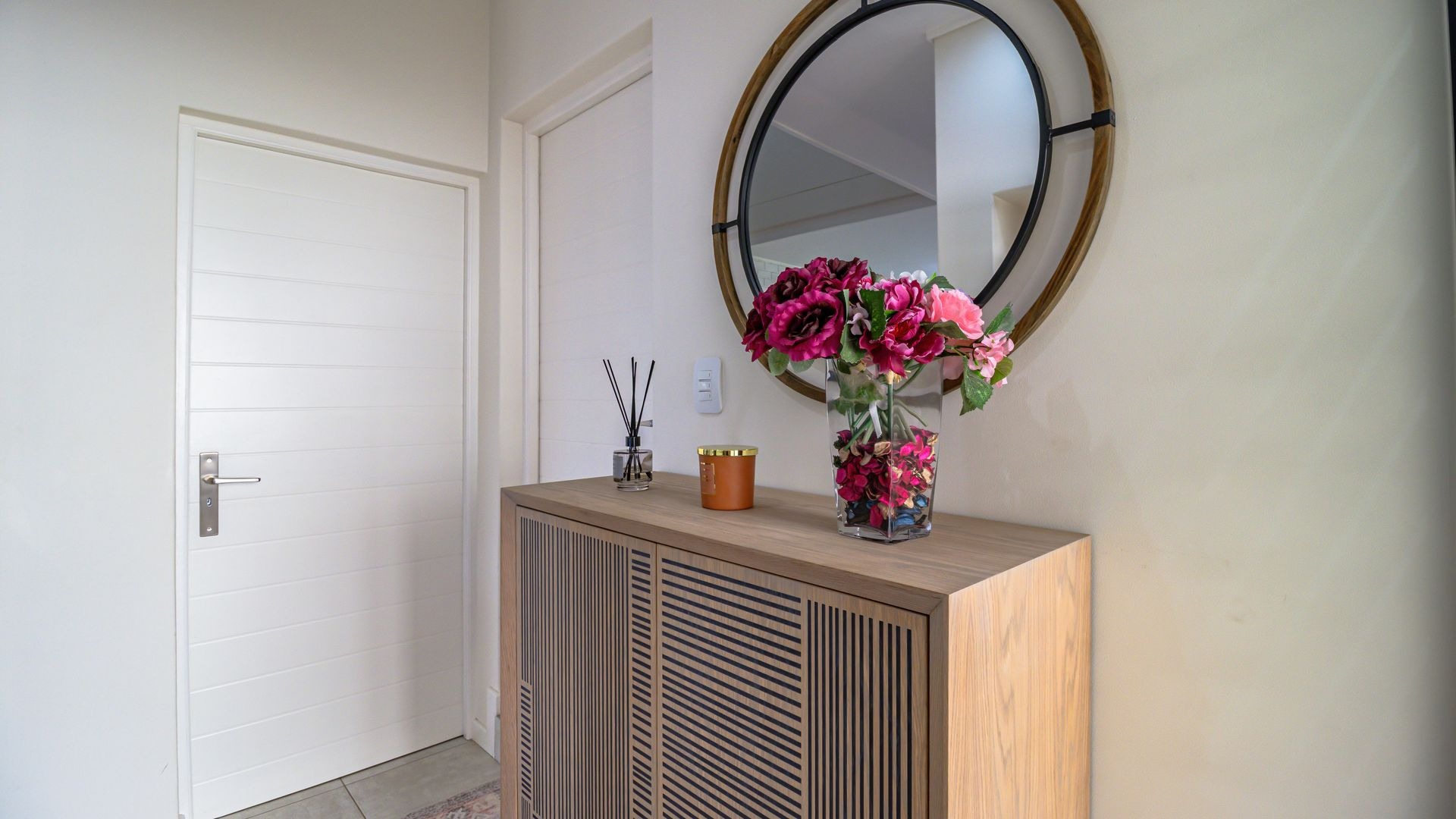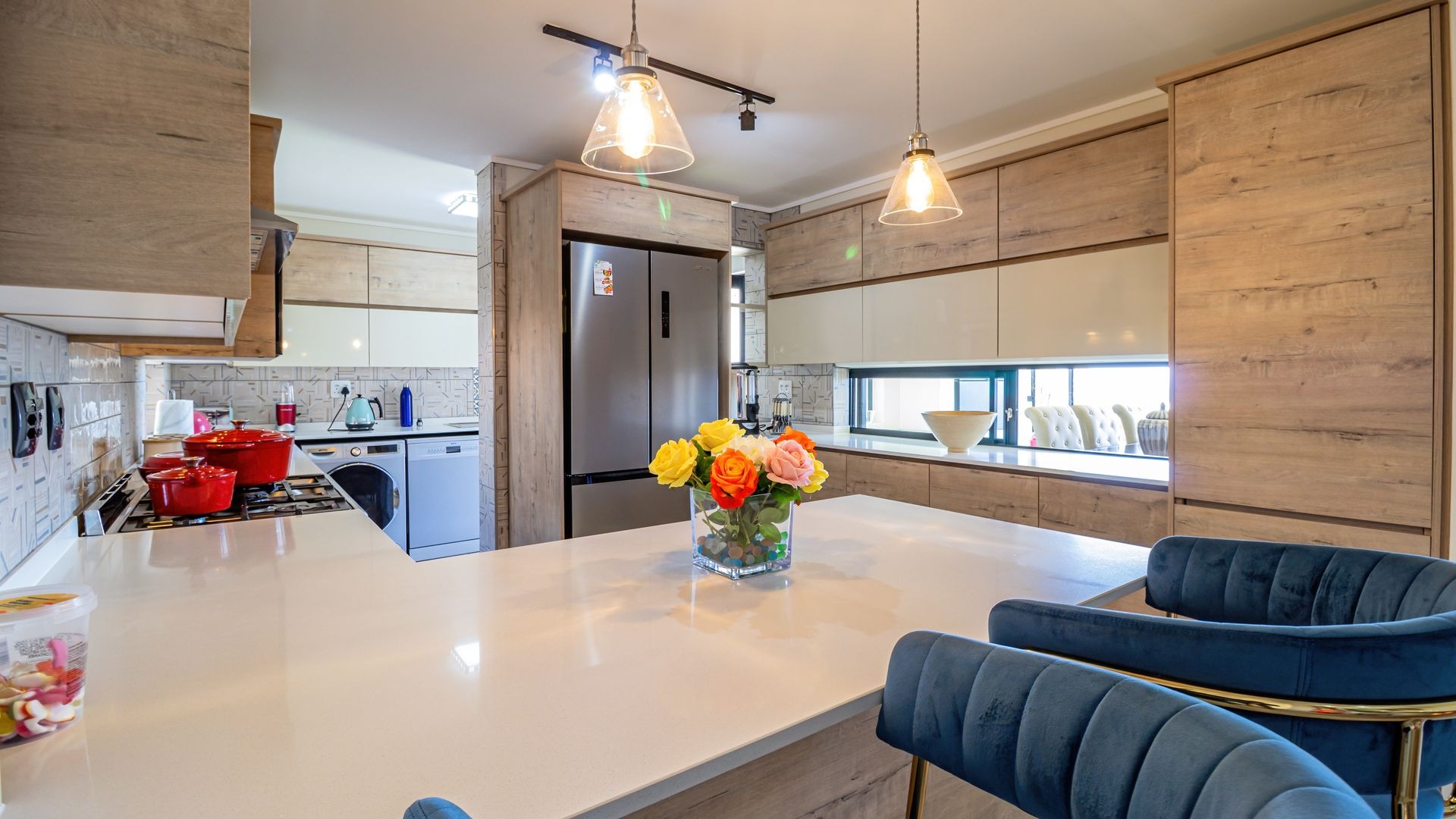 As you step inside, you are greeted by a stunning open-plan lounge, filled with warmth, colour, and natural light. The lounge is complemented by a beautiful built-in TV cabinet, which will remain with the home, adding both style and practicality to the space.
