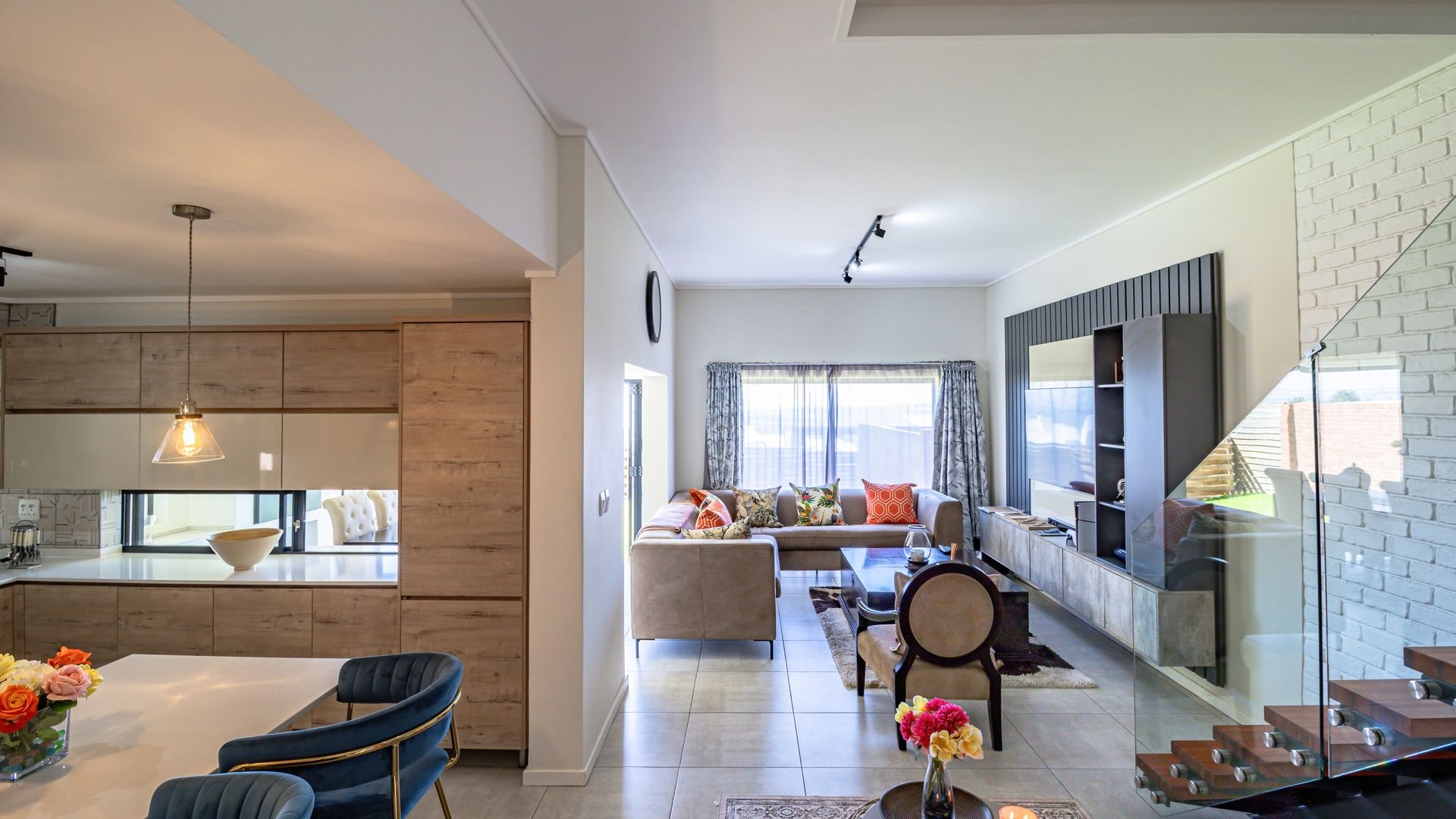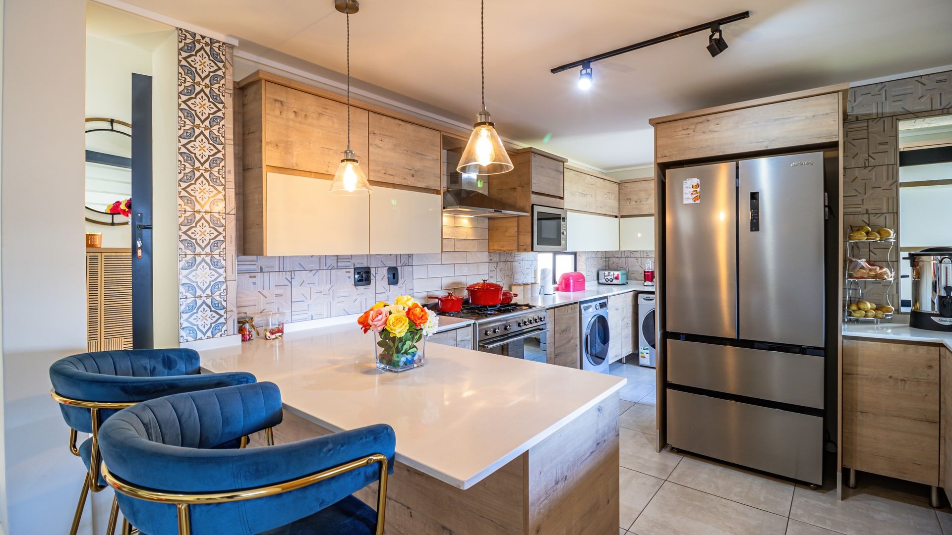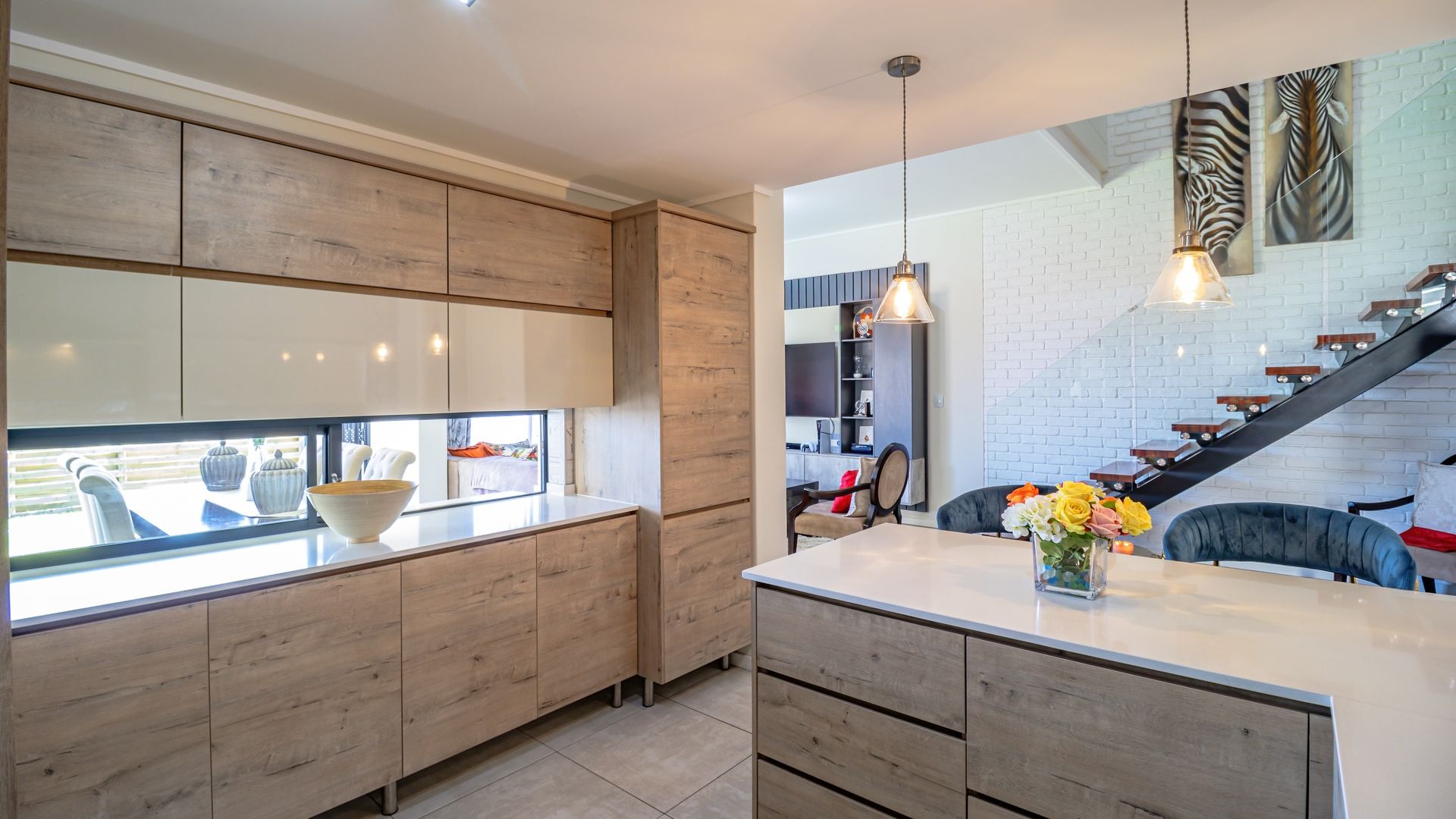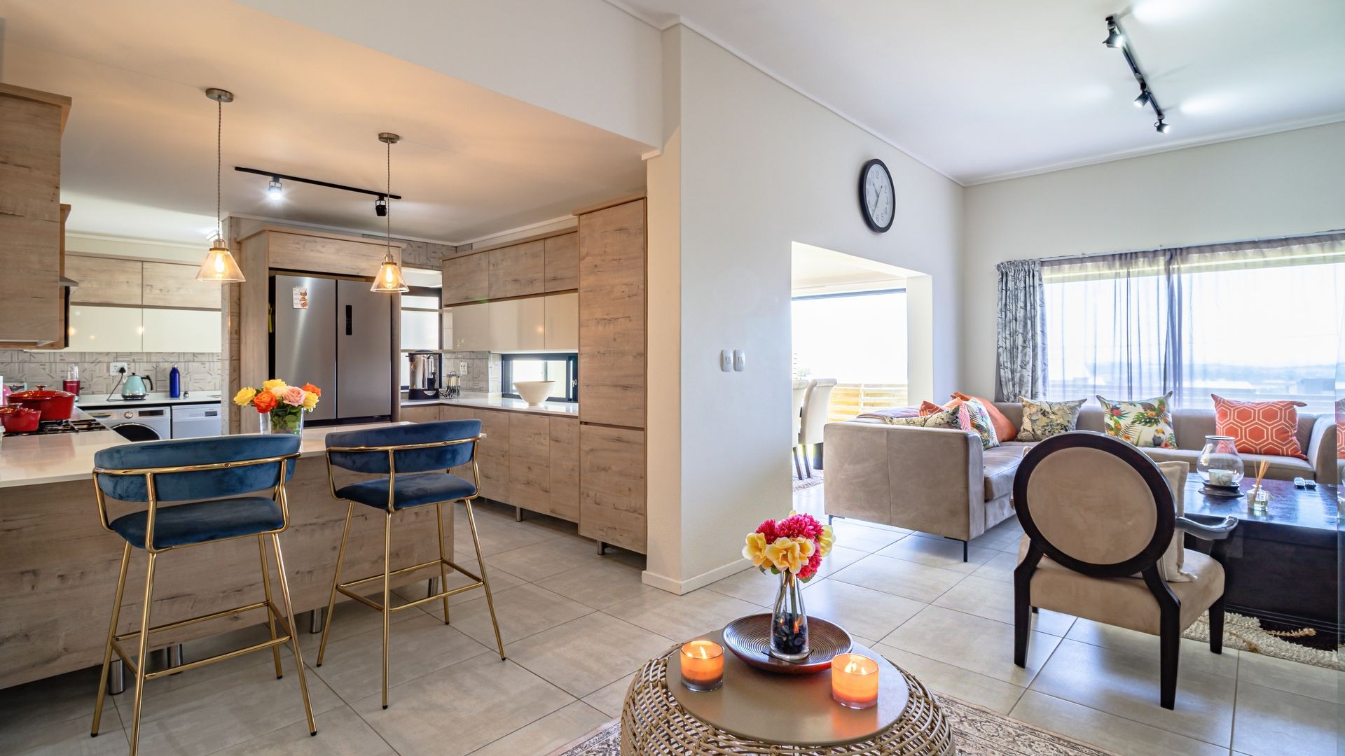 The living area flows seamlessly into a beautifully designed kitchen that is both stylish and functional. The kitchen offers ample cupboard space, a premium SMEG oven, hob, and extractor, and a separate scullery. It comfortably accommodates three under-counter appliances and features a convenient door leading directly to the garden. A gas geyser ensures year-round comfort and efficiency.