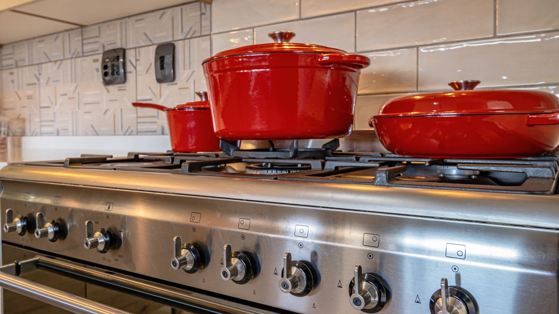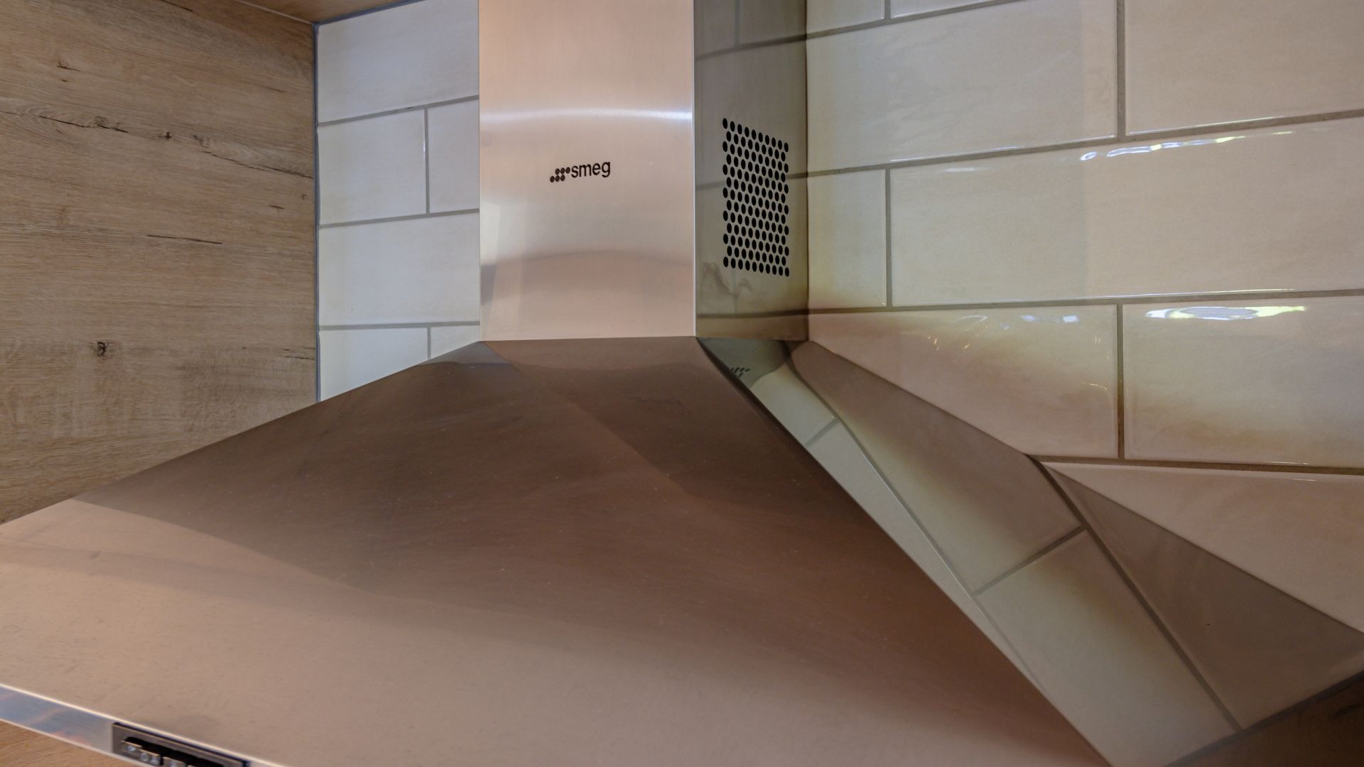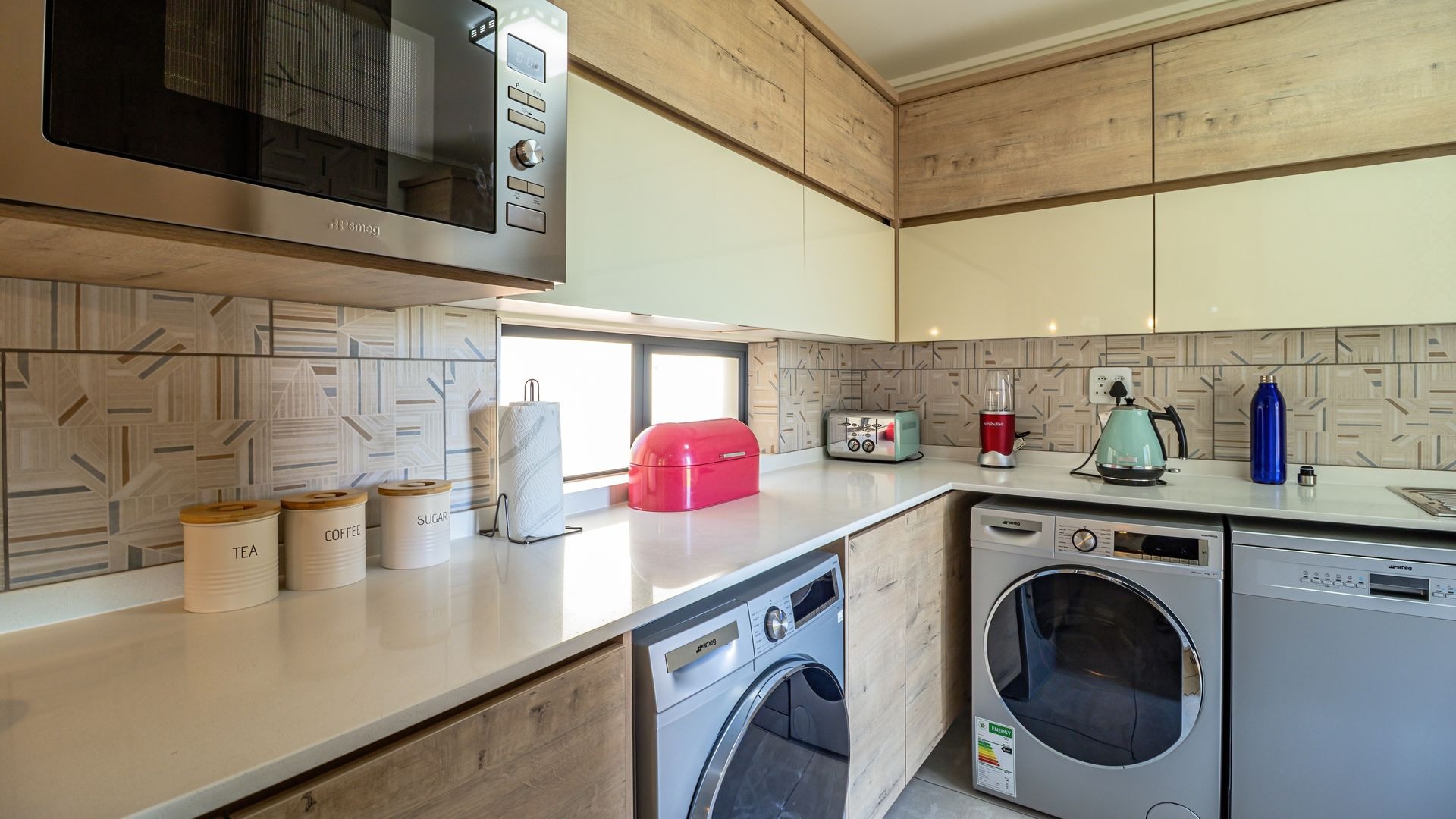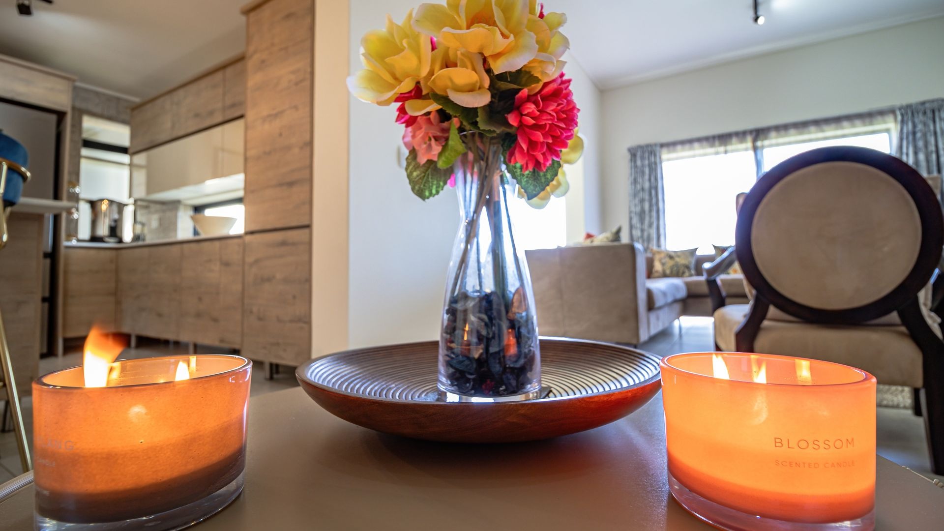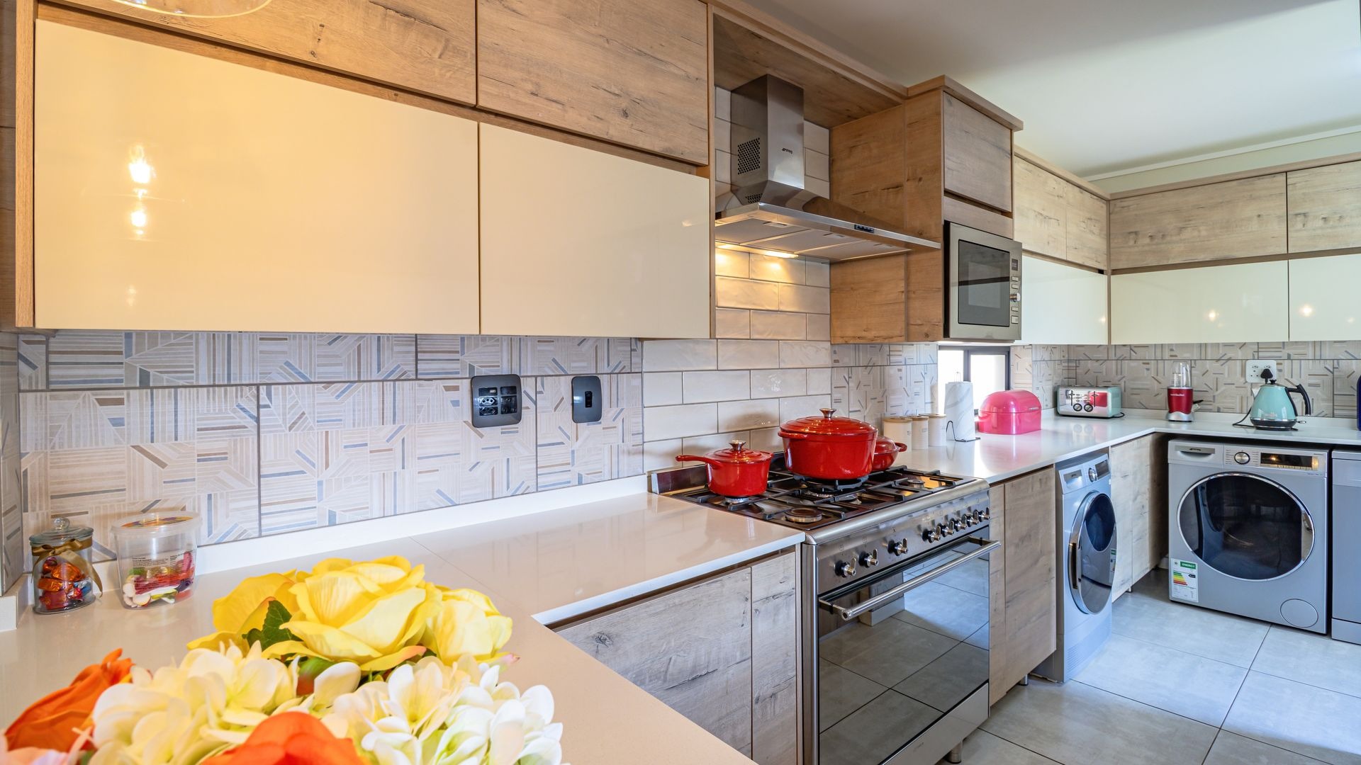 The living area flows seamlessly into a beautifully designed kitchen that is both stylish and functional. The kitchen offers ample cupboard space, a premium SMEG oven, hob, and extractor, and a separate scullery. It comfortably accommodates three under-counter appliances and features a convenient door leading directly to the garden. A gas geyser ensures year-round comfort and efficiency.