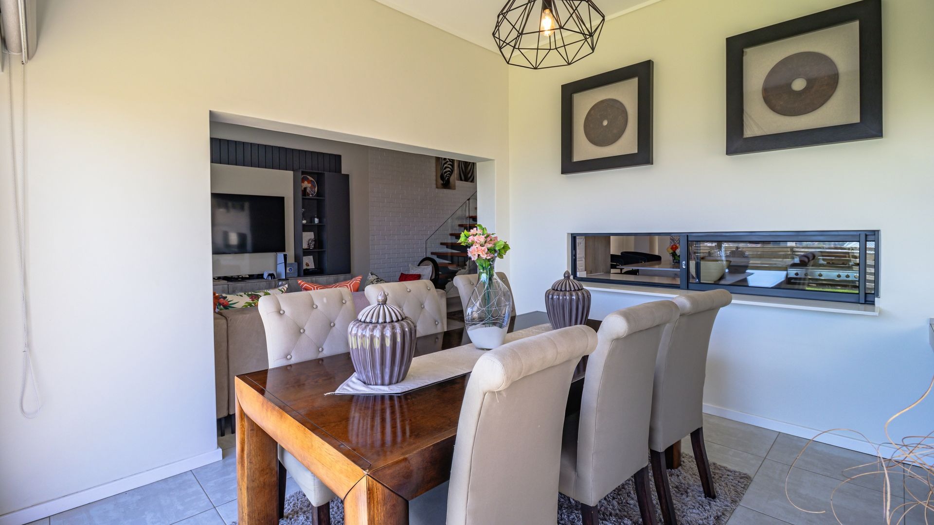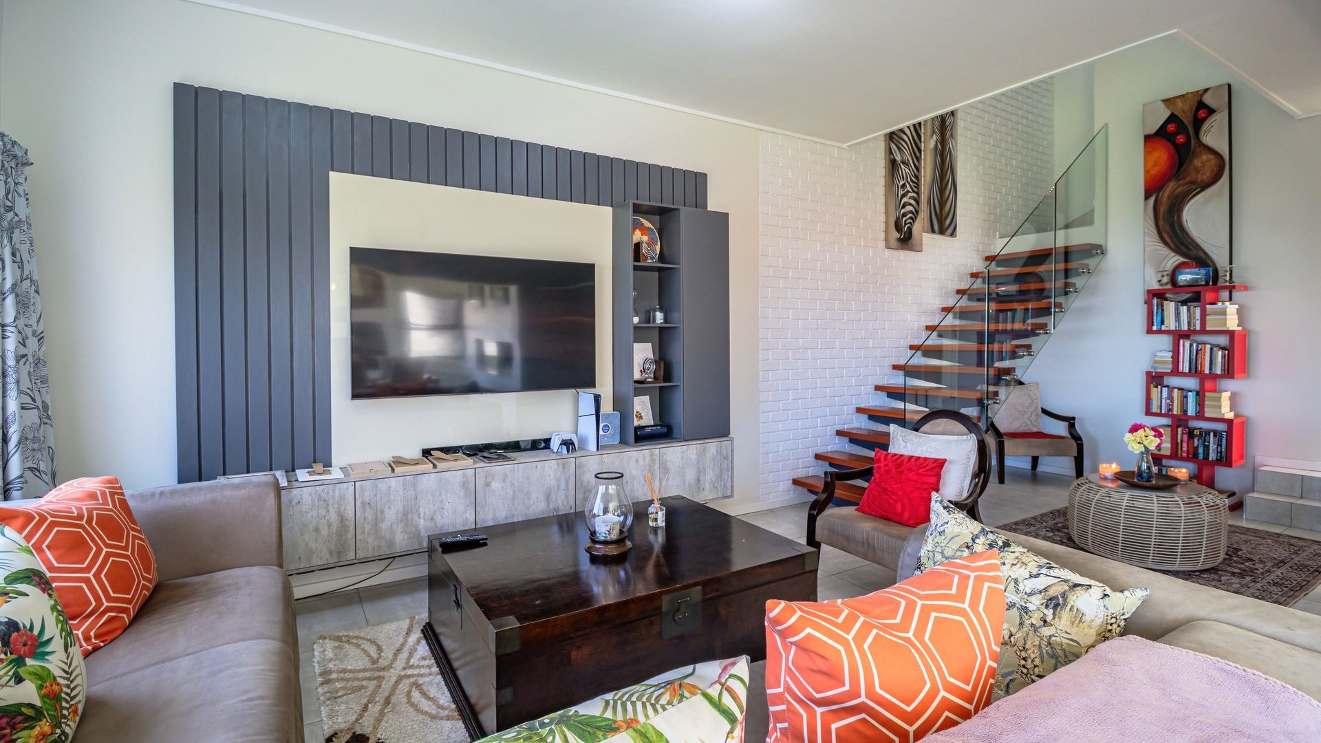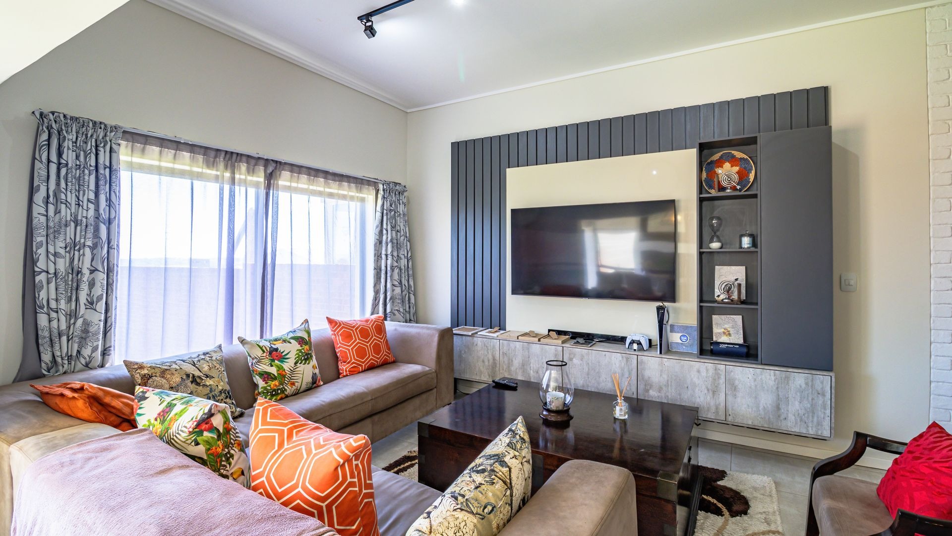 The lounge opens beautifully onto the entertainment patio, currently accommodating a dining table and designed for hours of relaxed entertaining. This inviting entertainment room includes a built-in braai and stackable doors that open onto a neat, private, and generously sized garden, creating effortless indoor-outdoor living.